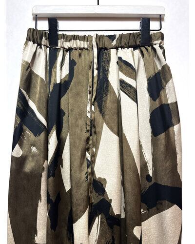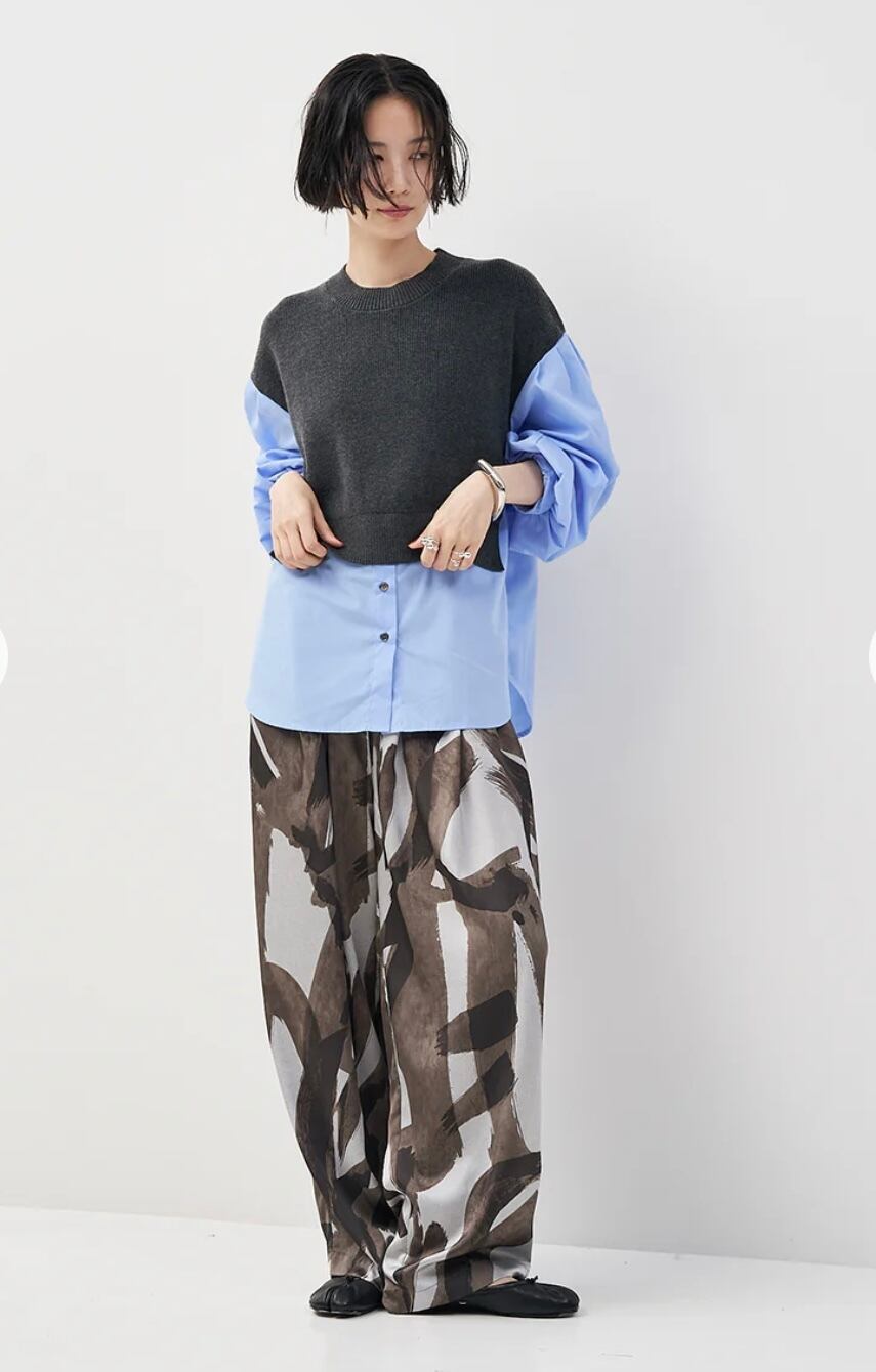 ドレープ感のあるサテンのような素材感と、落ち着いたカラーで、大胆な柄でもスタイリングしやすいアイテムになっています。
