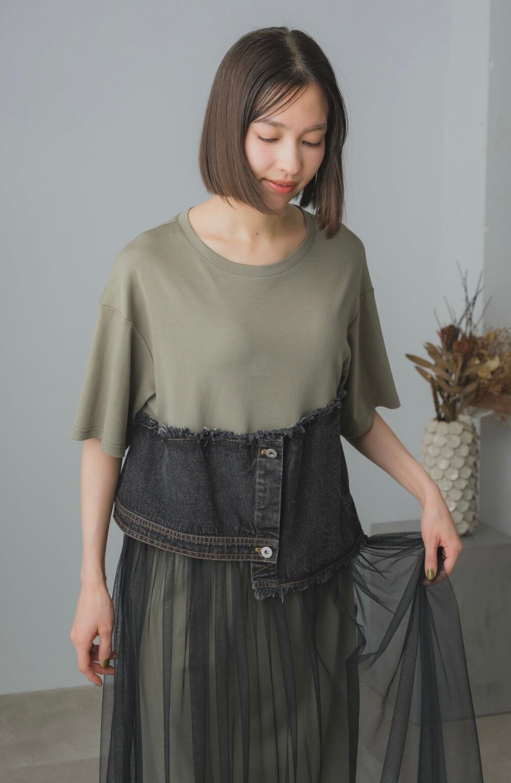 デニム素材を使用したおしゃれなカットデザインが特徴の一着。