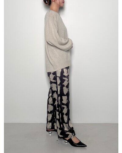 程よい光沢感と落ち感のある素材で女性らしい柄パンツができあがりました。動くたびにふわっと軽やかに広がるシルエットです。