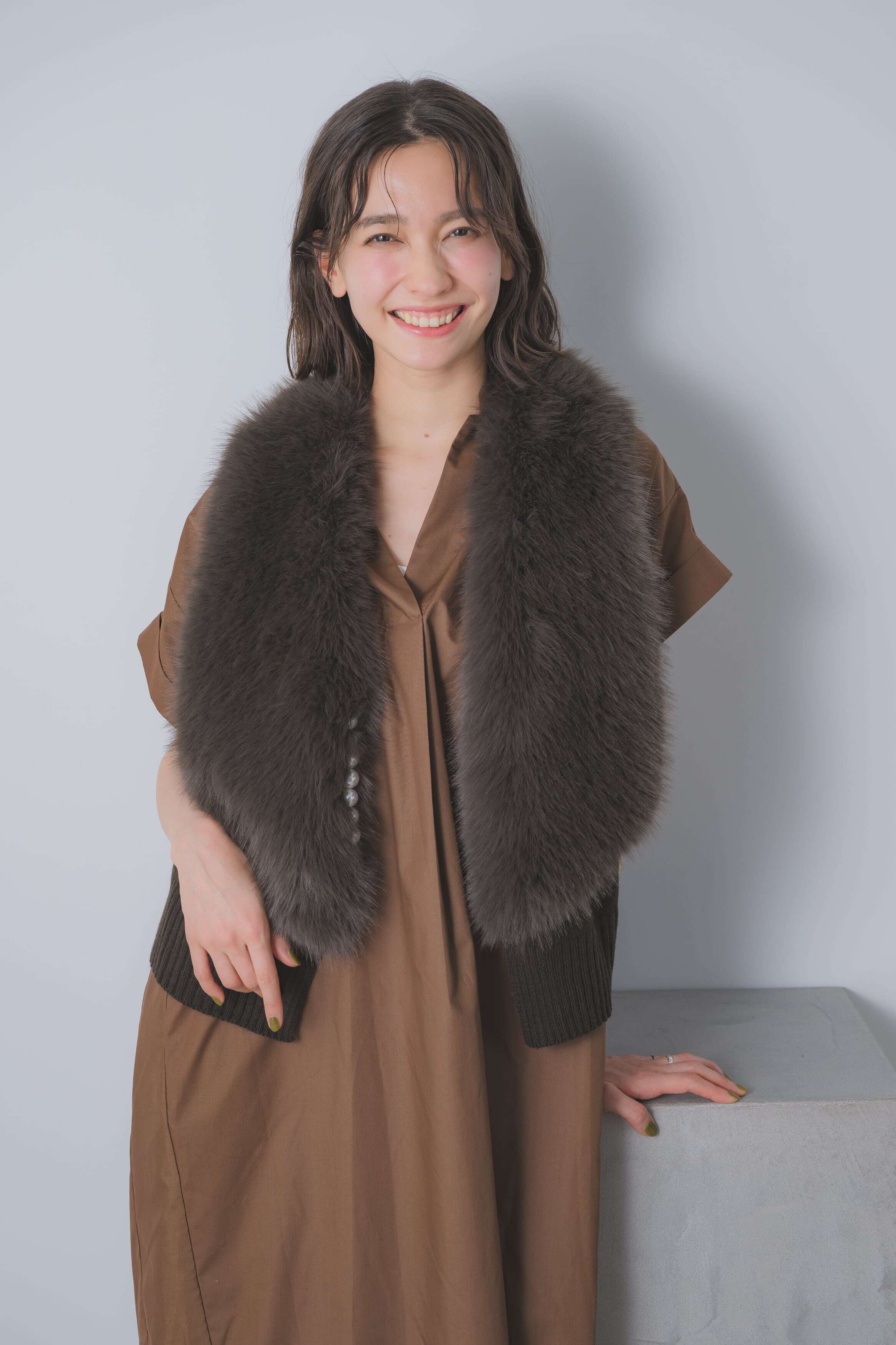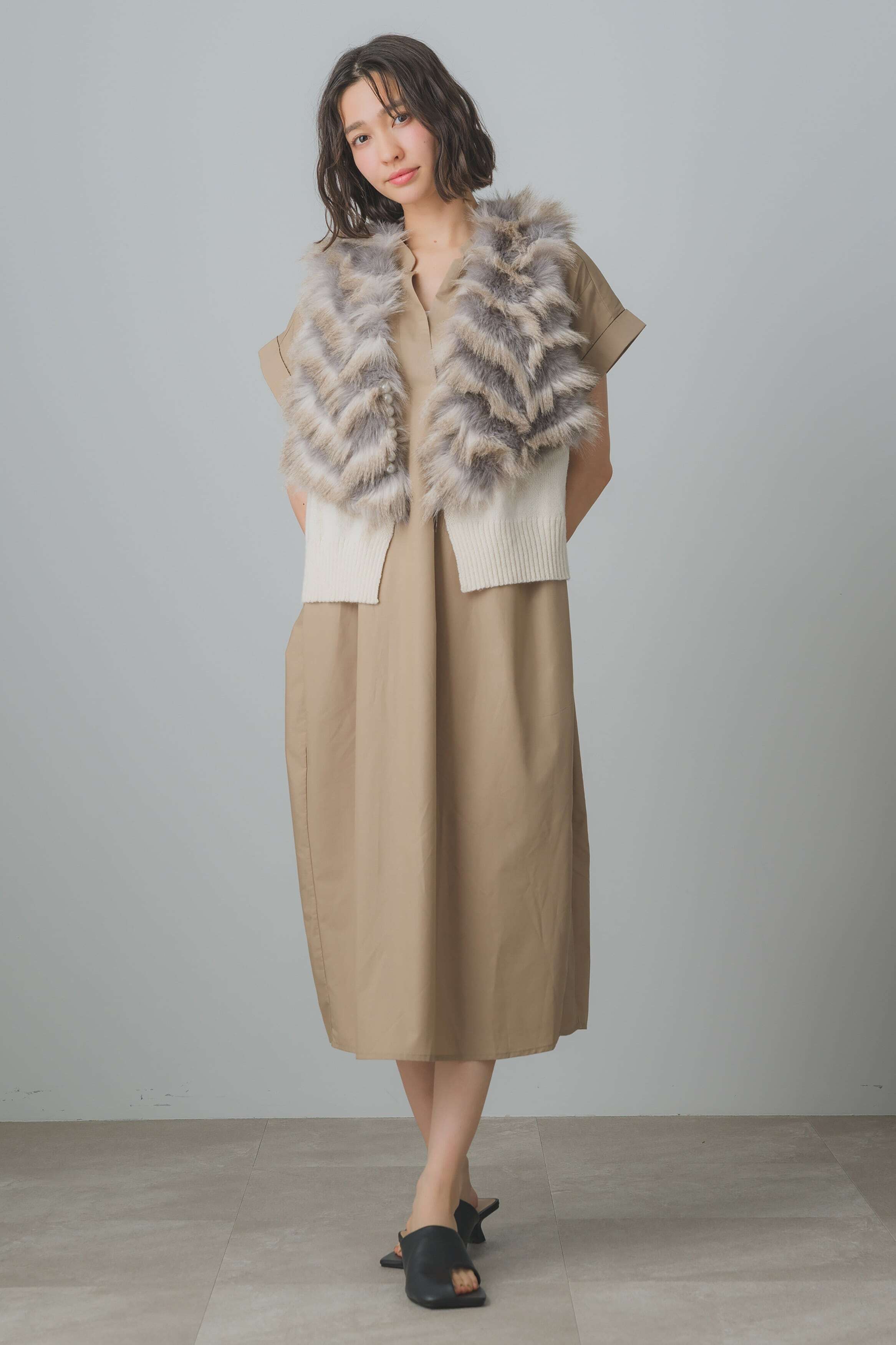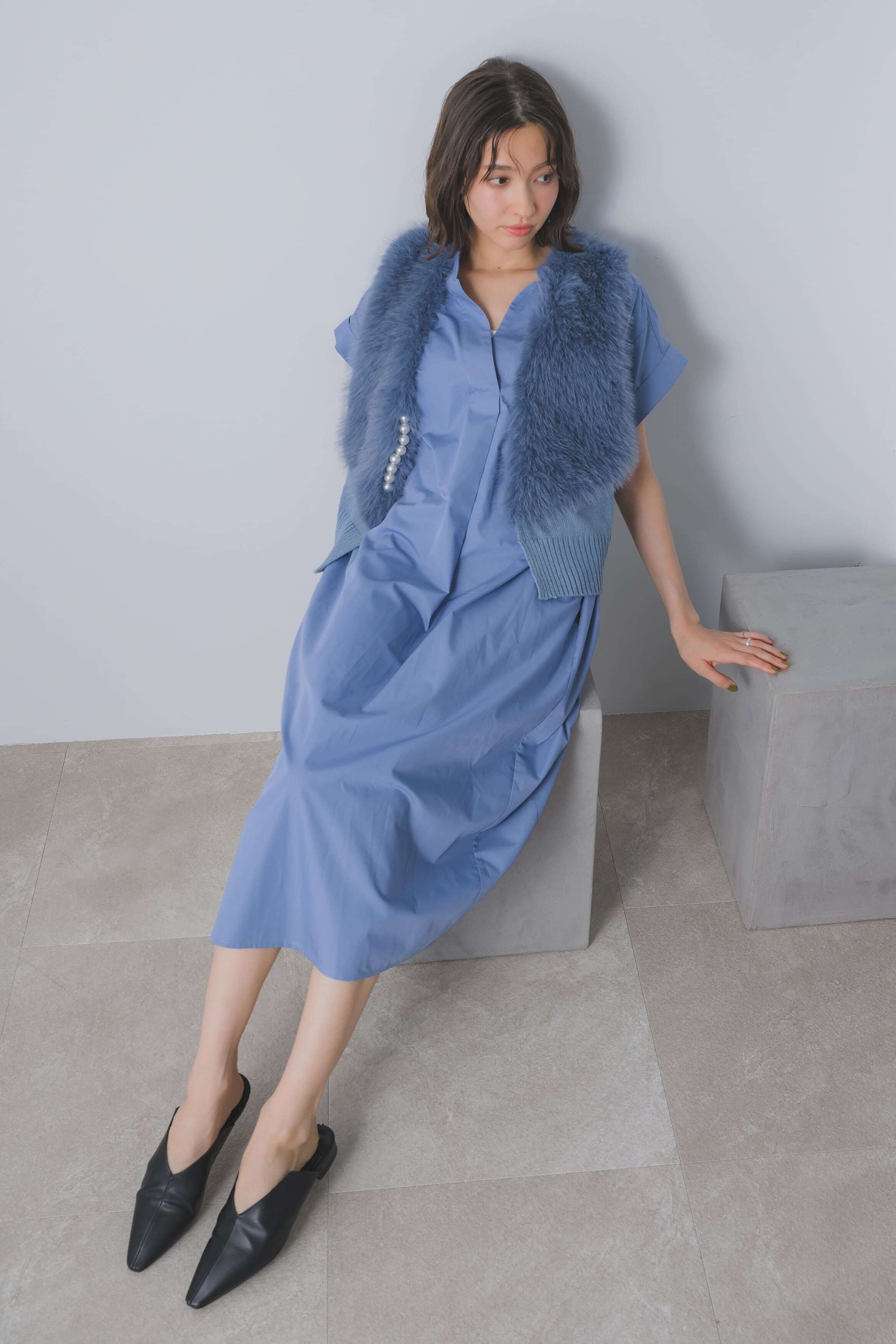 胸元のスキッパーデザインが顔周りをスッキリと見せ、