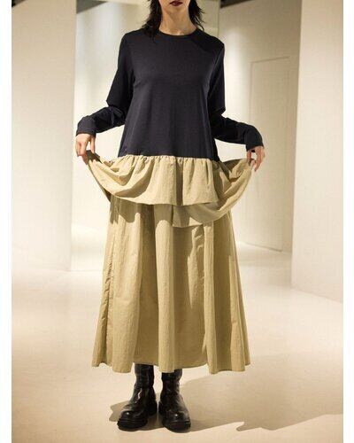 トップス部分は肌触りのよいカットソー素材でリラックス感を、スカート部分にはしなやかでハリのあるタフタ素材を合わせ、甘さを抑えたモードな印象に仕上げました。