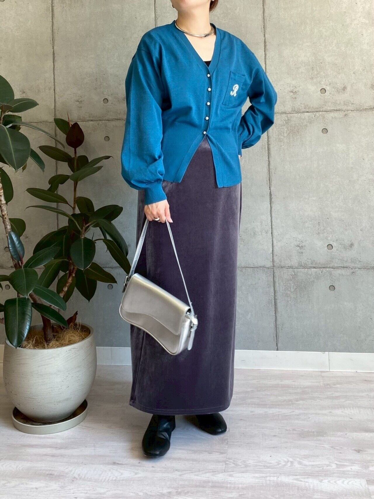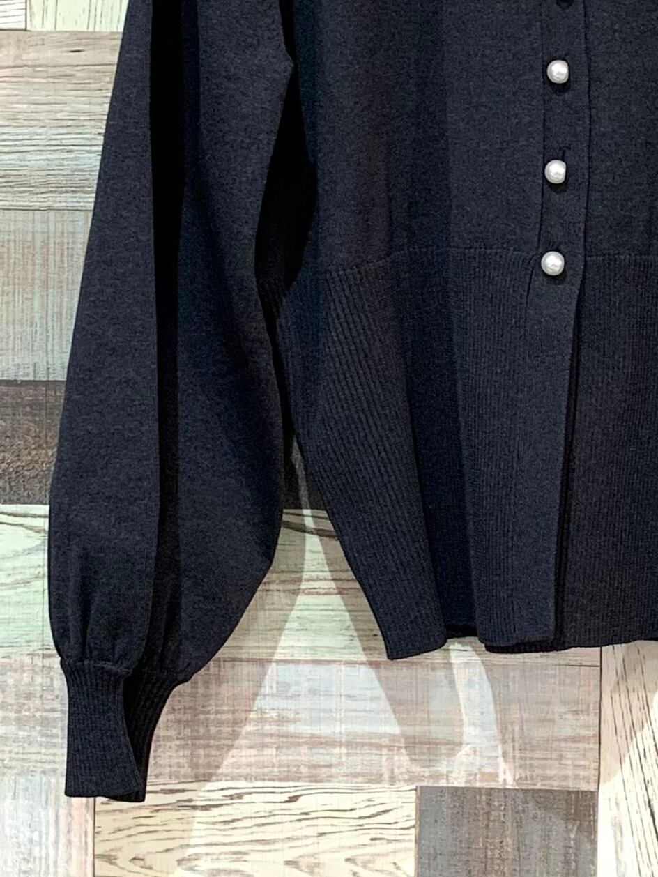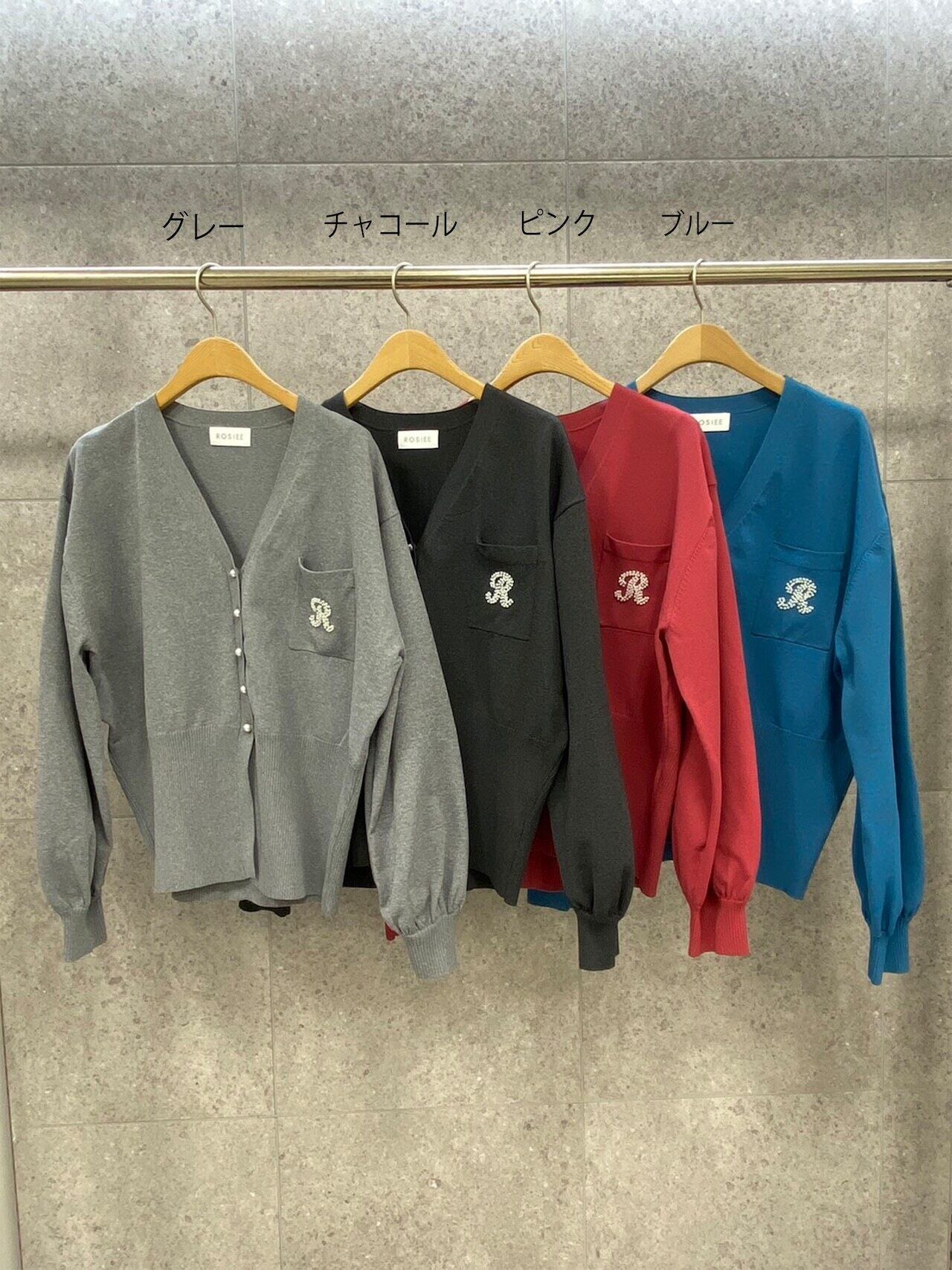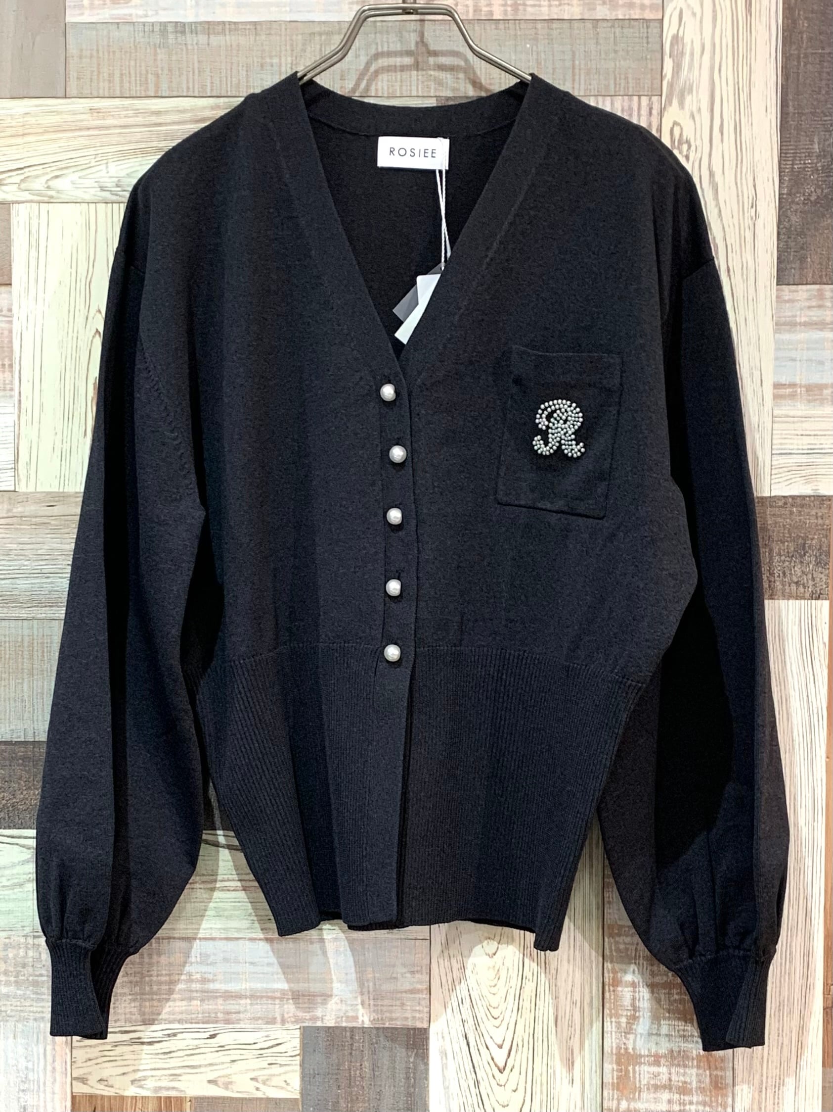 Rブローチ風ニットカーディガン