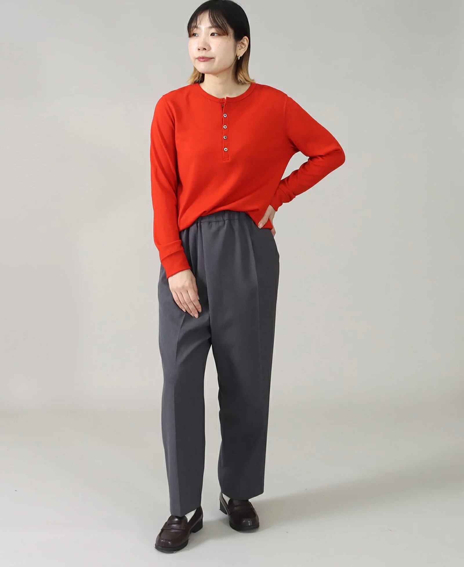 首元のボタンデザインがシンプルながらもアクセントになり、Tシャツよりもラフすぎず、シャツほどかっちりしすぎない絶妙なバランスです。