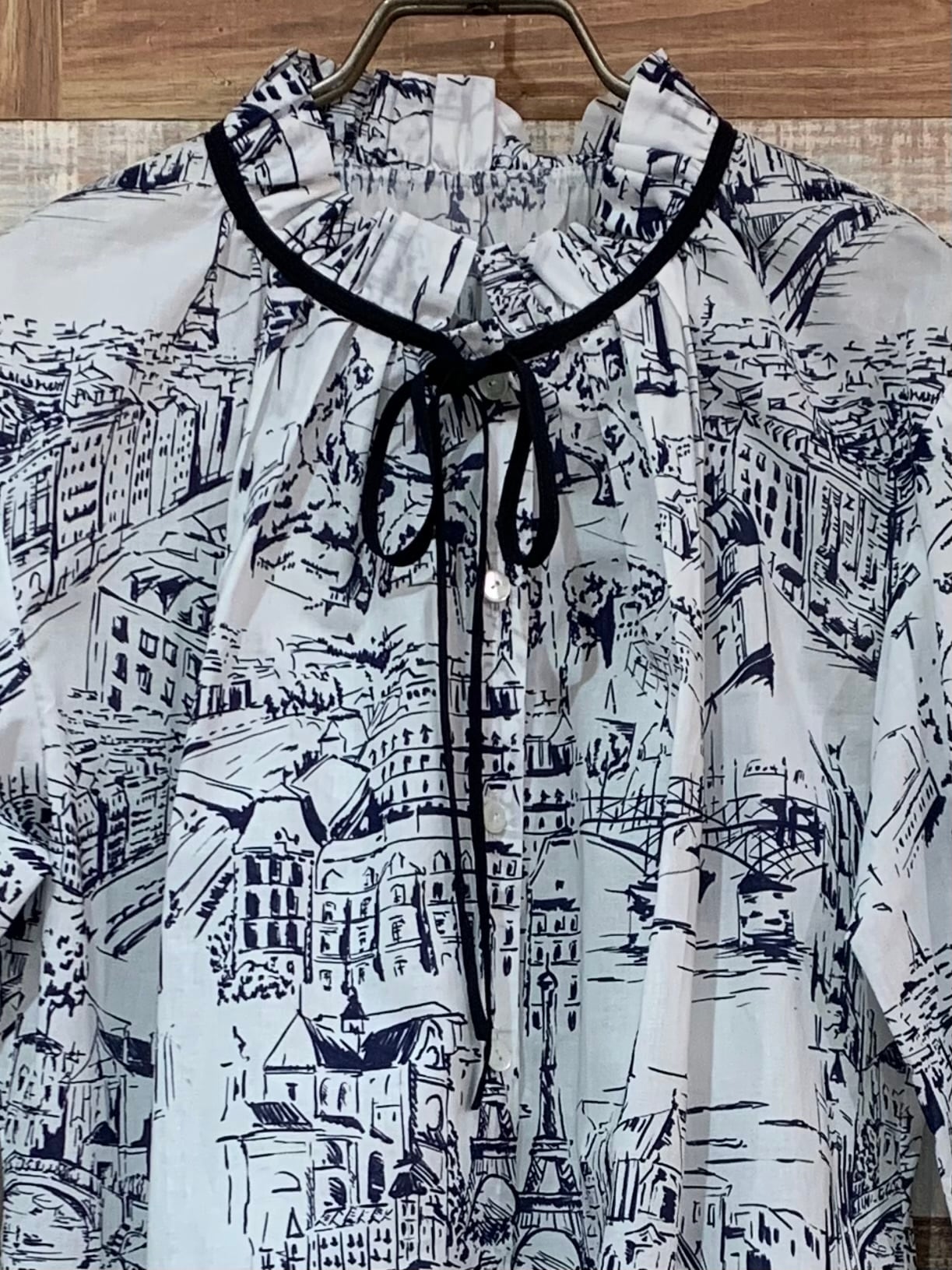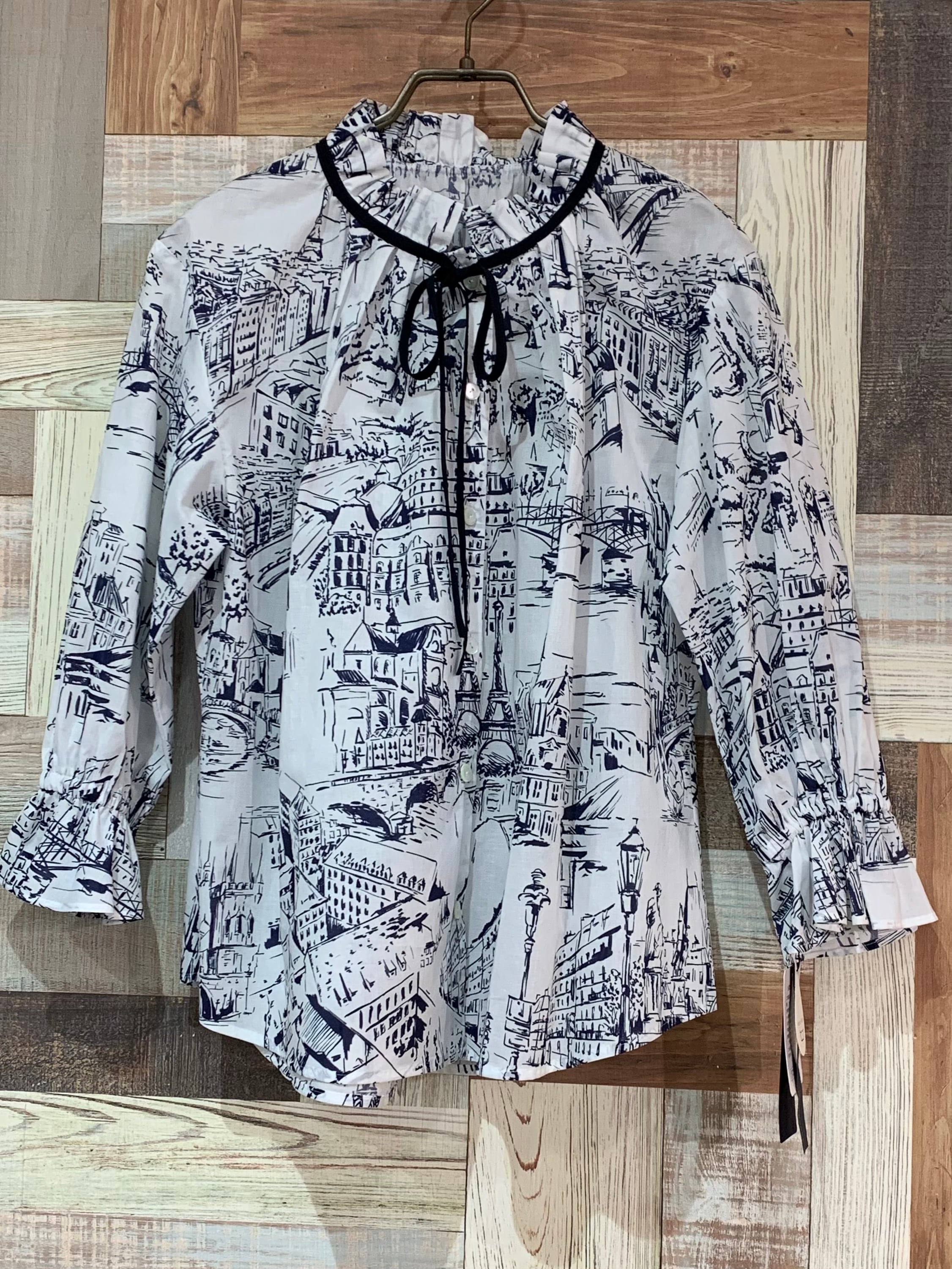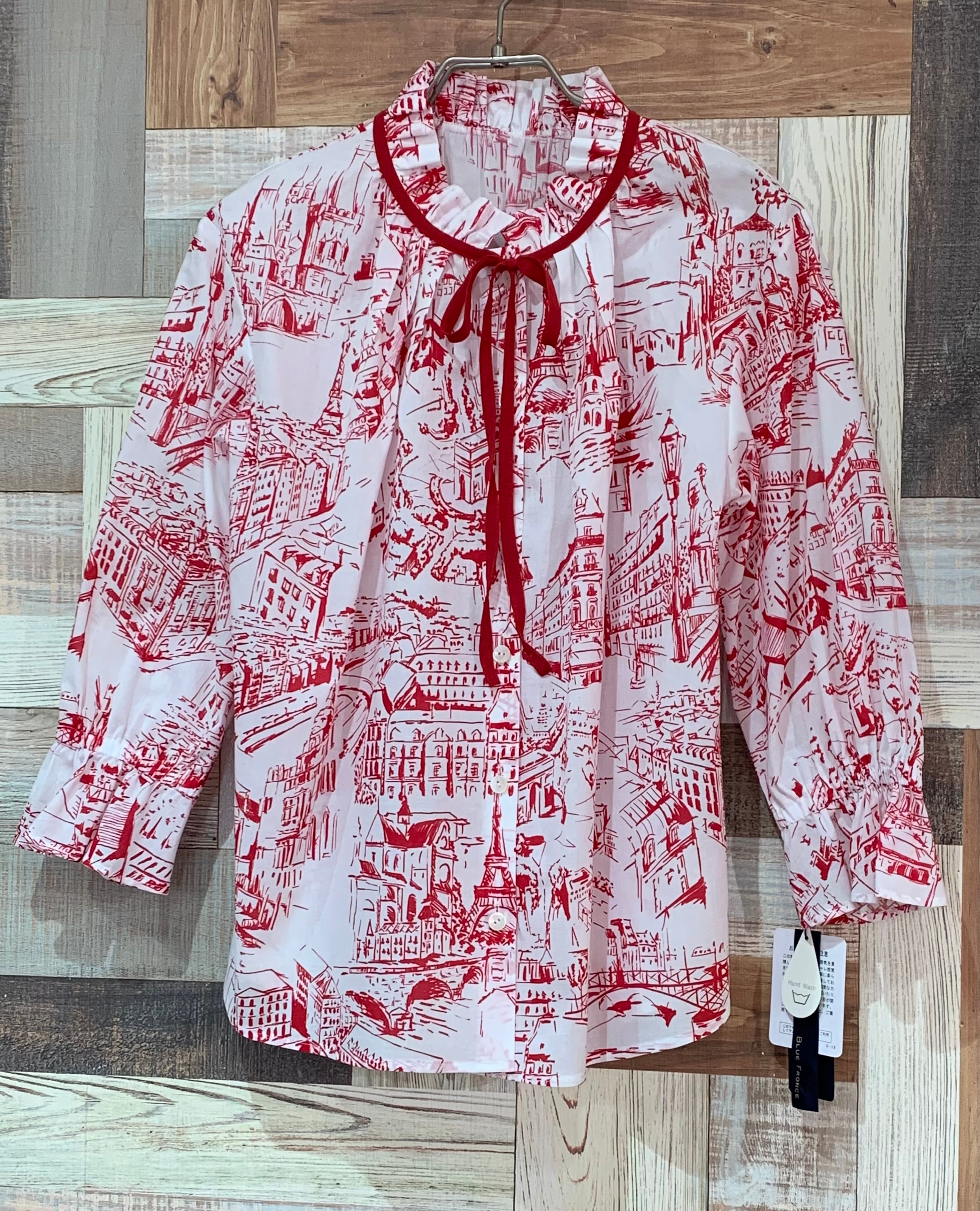 フリルネックリボン付きブラウス(総柄)