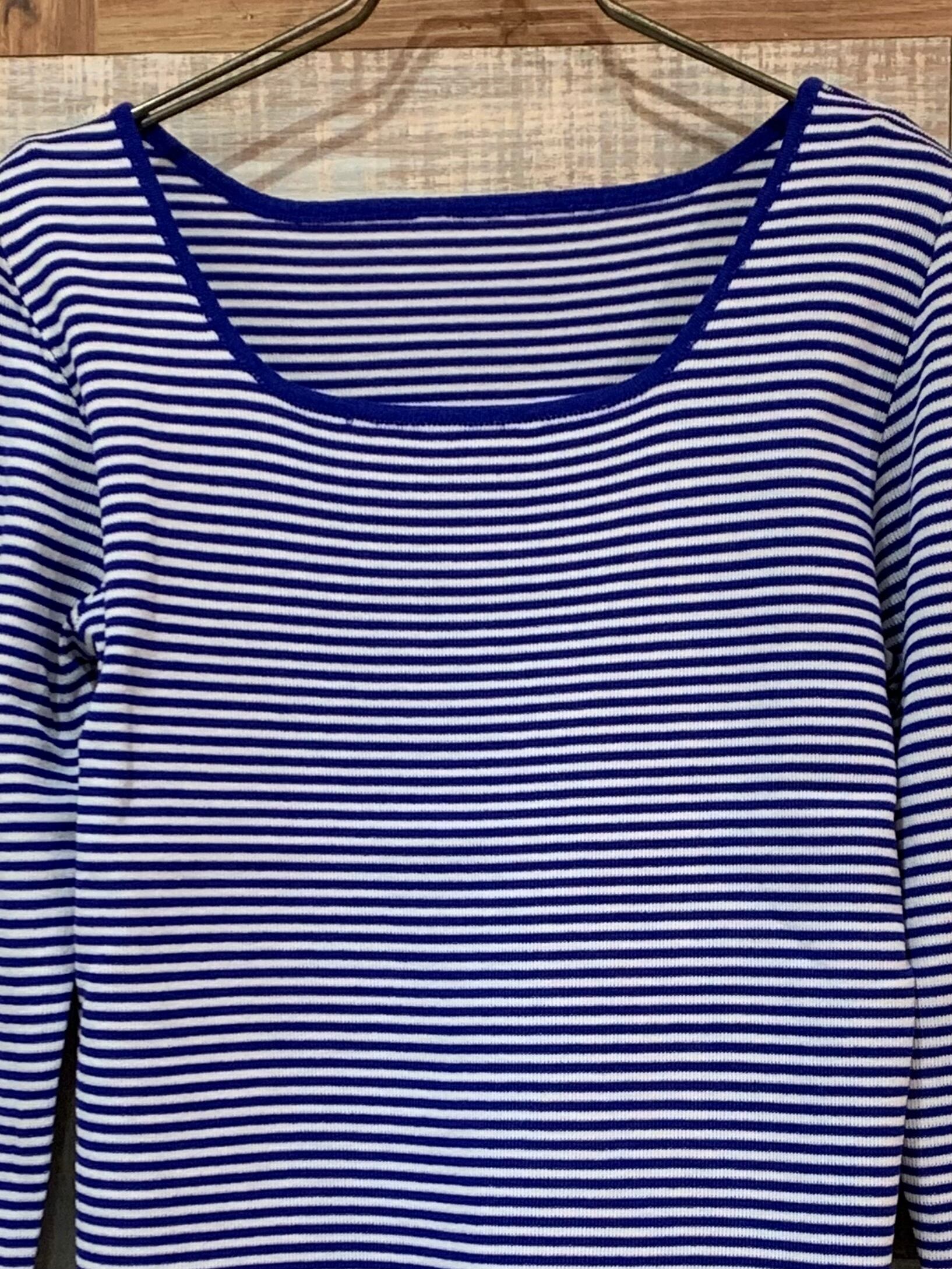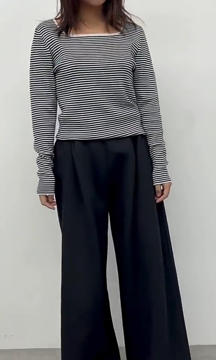 今年らしい細ピッチのボーダーで、トップスとしても 、インナーとして少しボーダーを見せても可愛く着て頂けます。