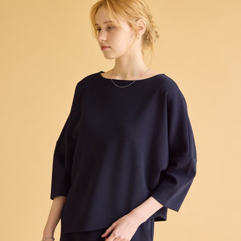 肩はドロップショルダーで程よい抜け感がありながら、肌触りの良いしっかりとしたカットソー生地を使用し、きちんと感のある仕上がりに♪