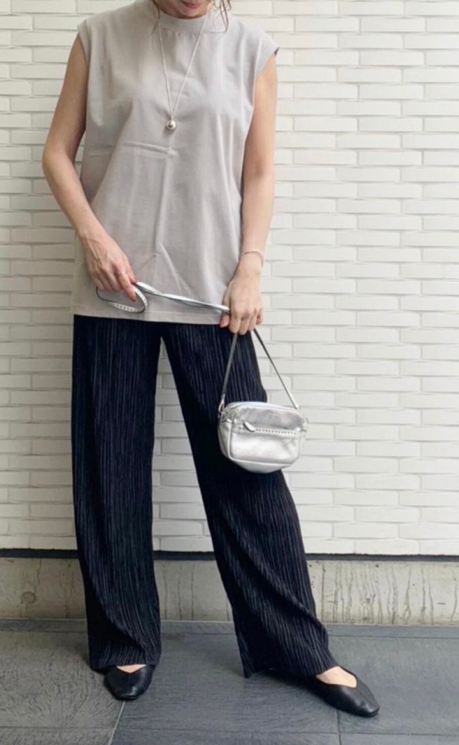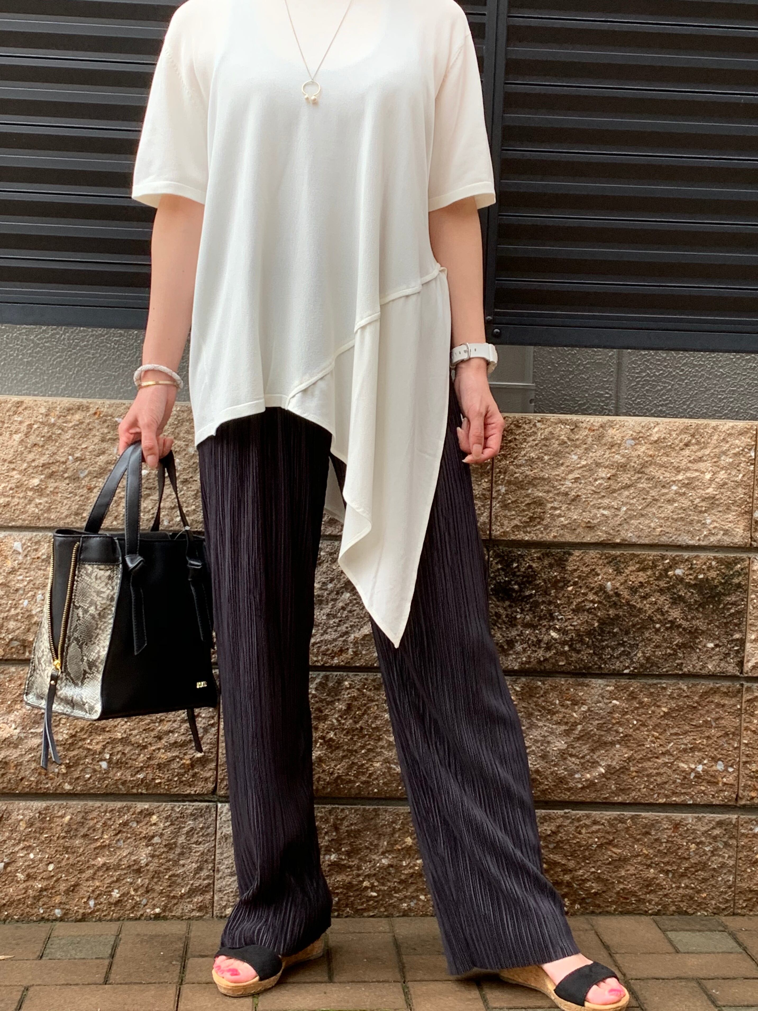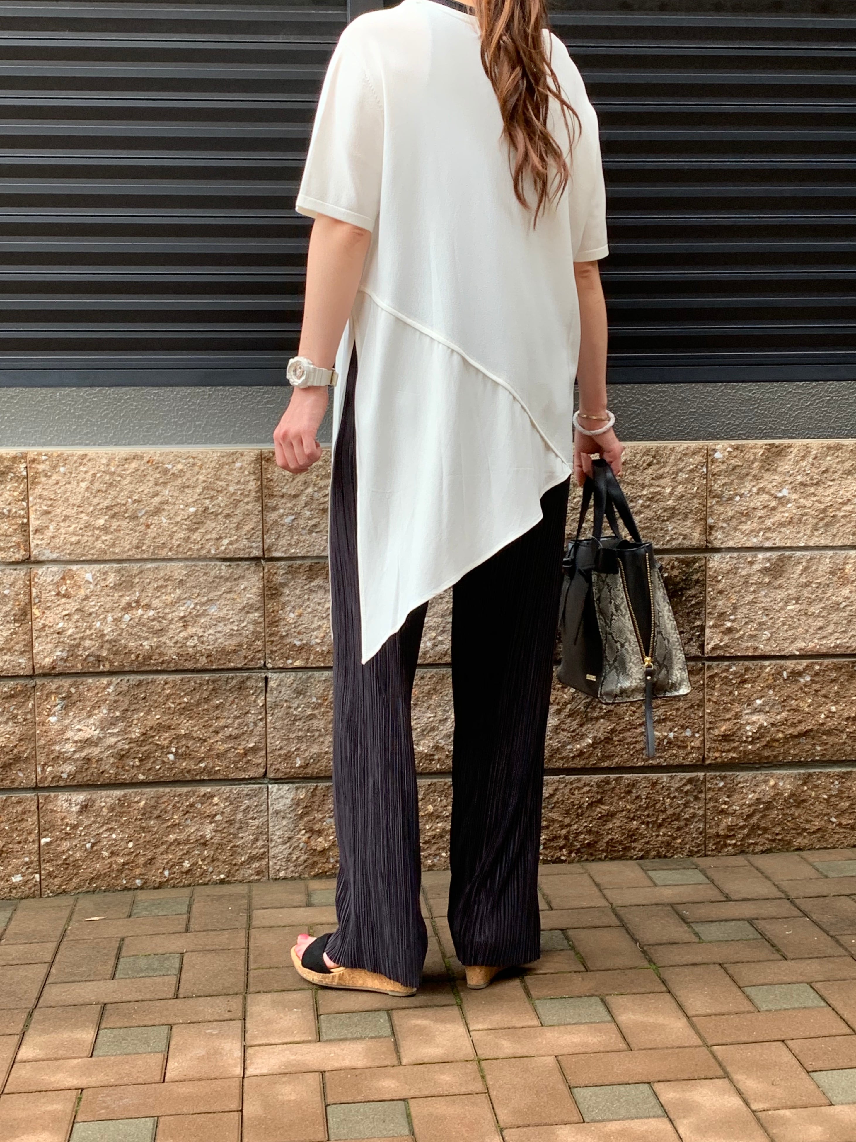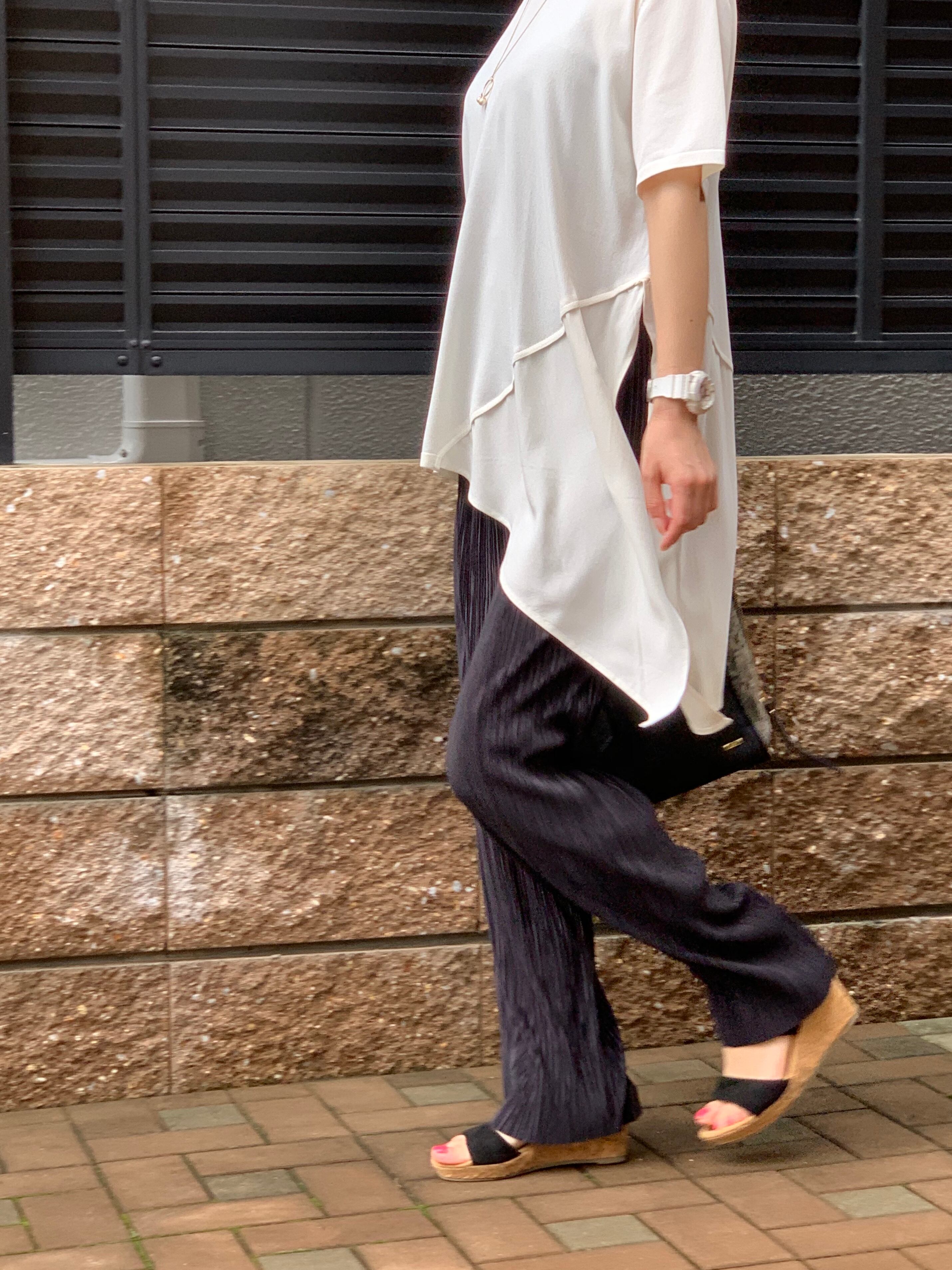 ランダムなプリーツが身体のラインを拾いすぎず程良くフィットして、綺麗なシルエットを出してくれます◎