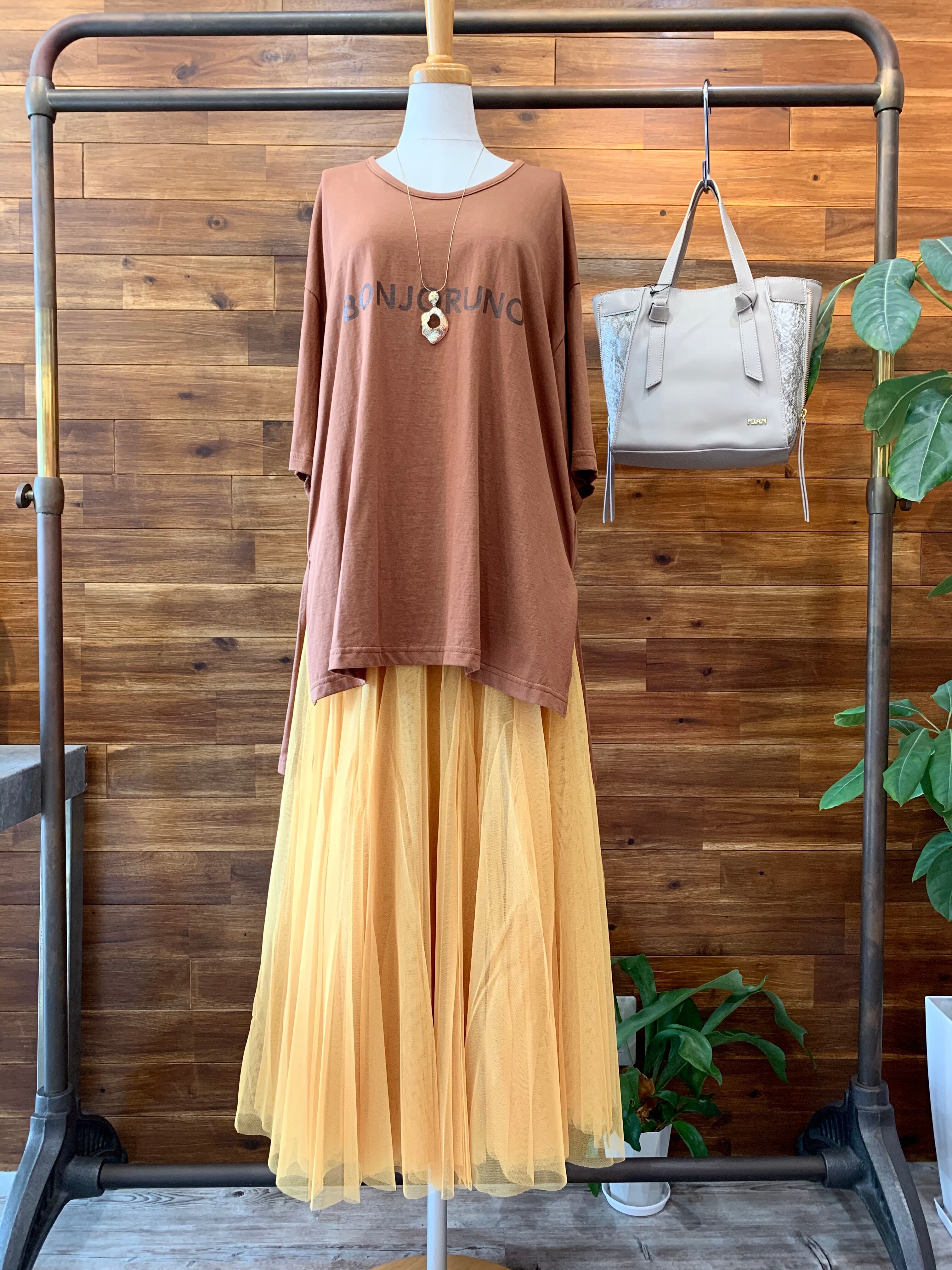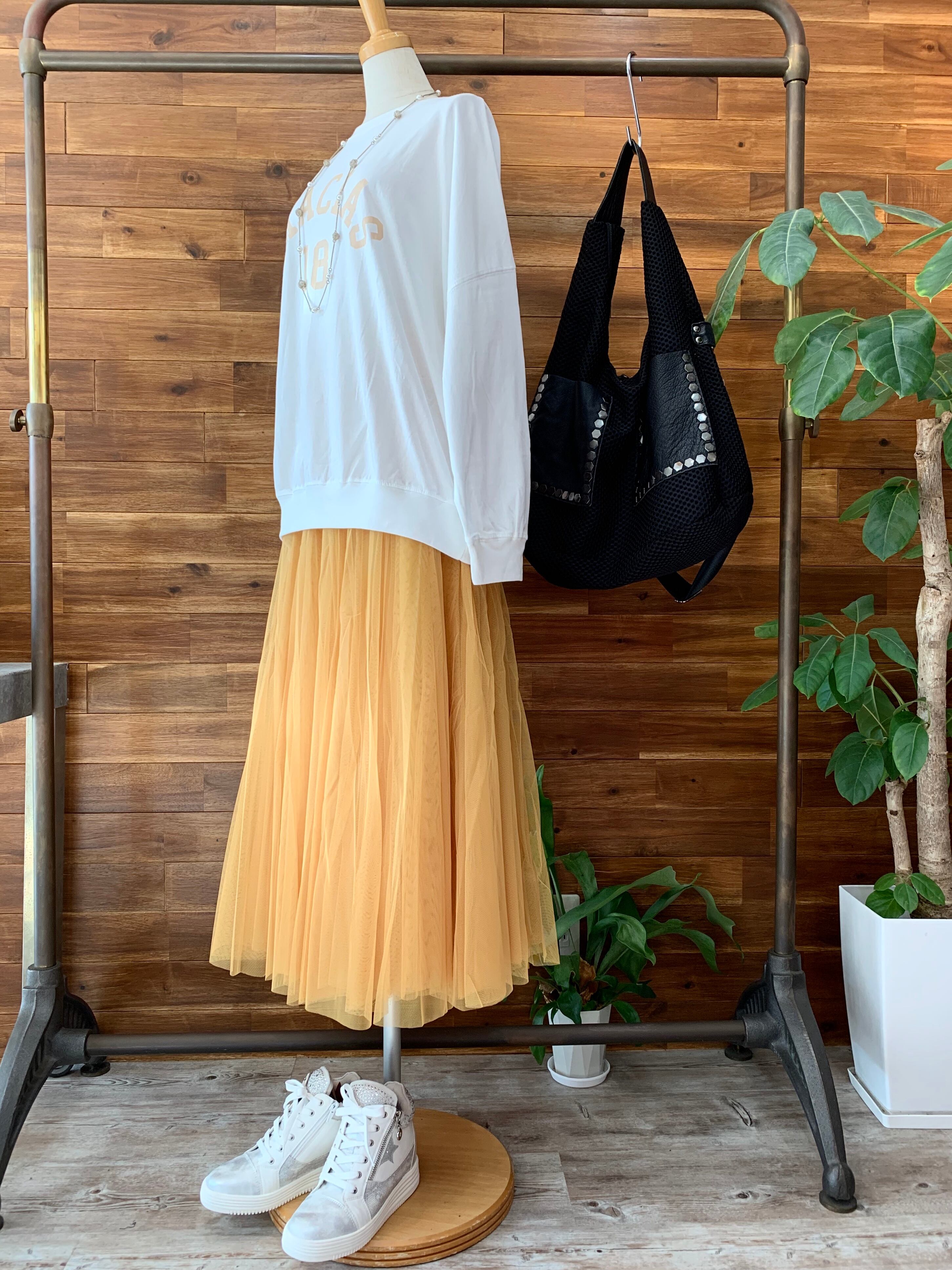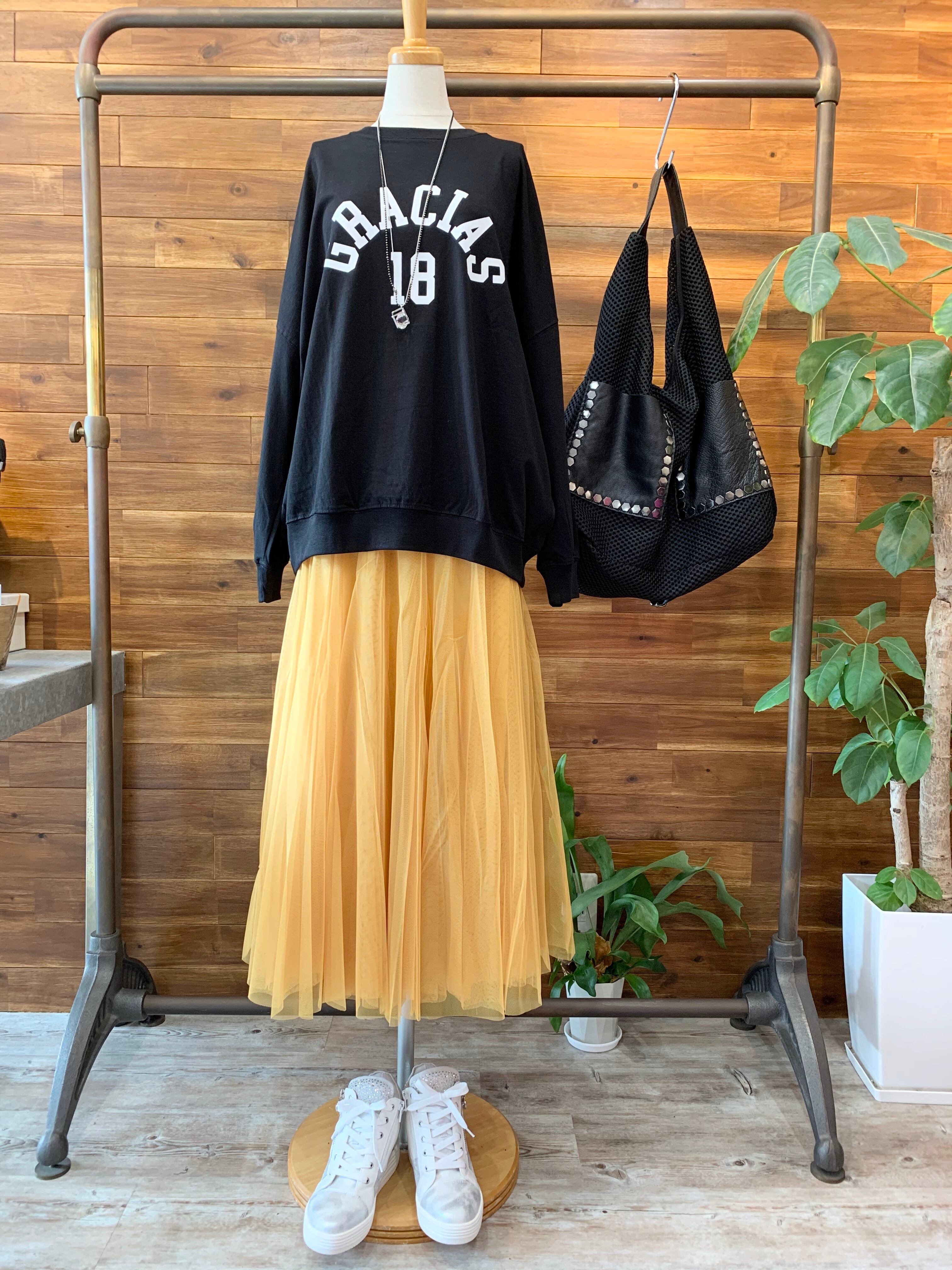 甘めになりがちなチュールスカートですが、スポーティなトップスやスニーカー合わせで、カジュアルに着崩すのがオススメコーディネート!
