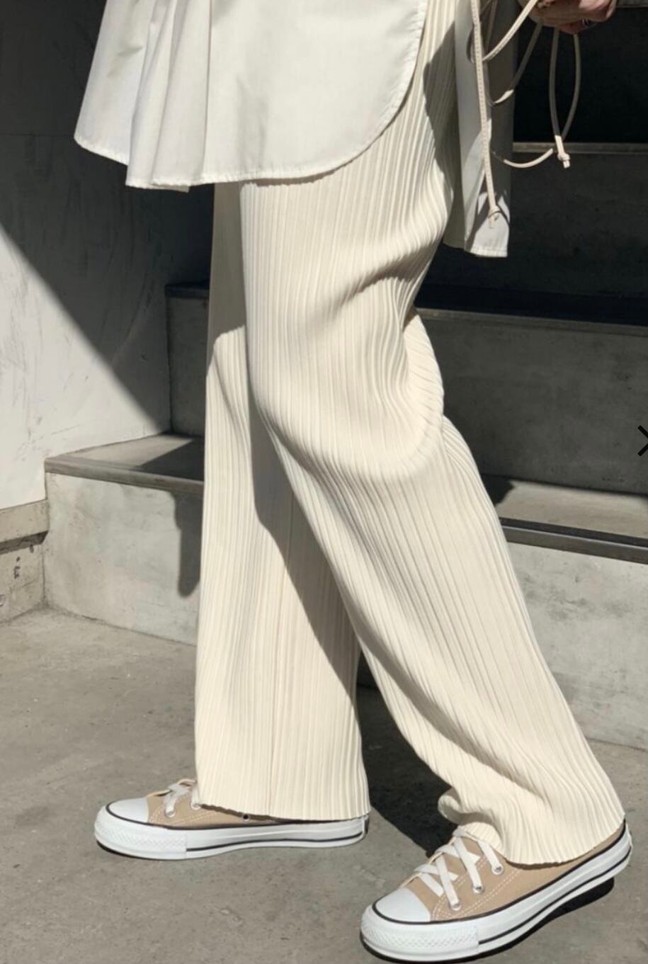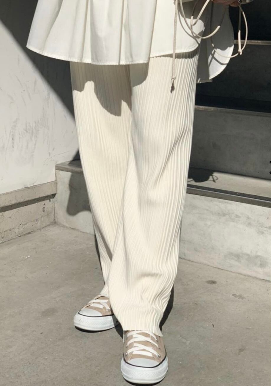 落ち感のあるプリーツ素材を使用し、パーカーやニット、ワンピースなどとのスタイリングにもぴったりです◎