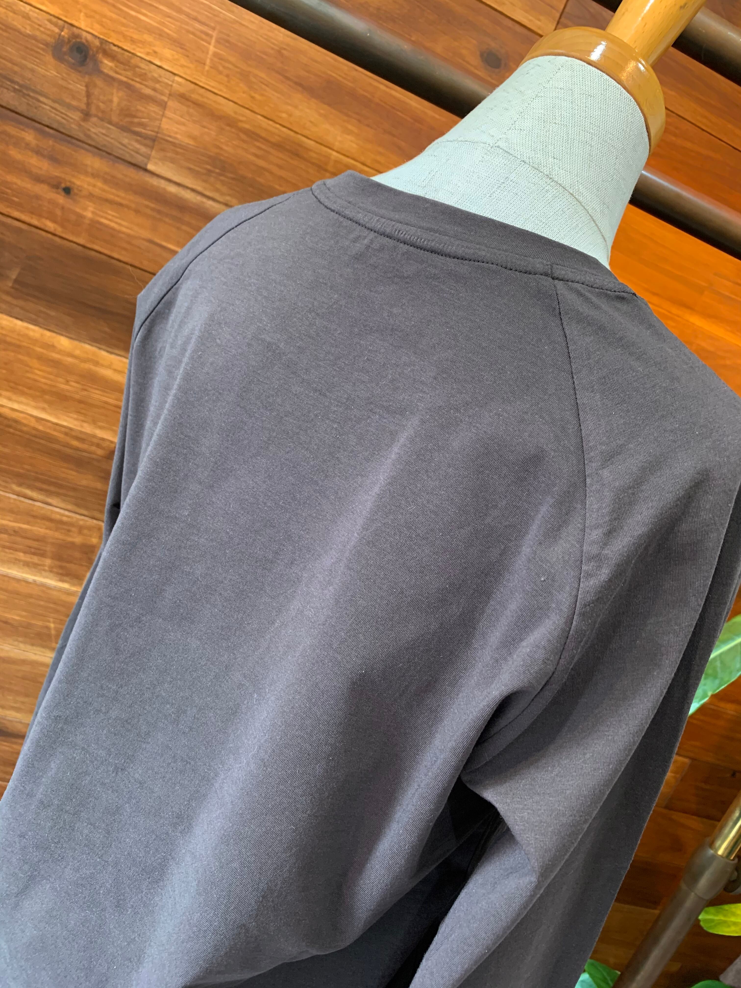 一見シンプルに見えますが、フロントはセットイン、後ろはラグラン切り替えの前後アシメトリーな袖付けが、さりげなくオシャレです♫
