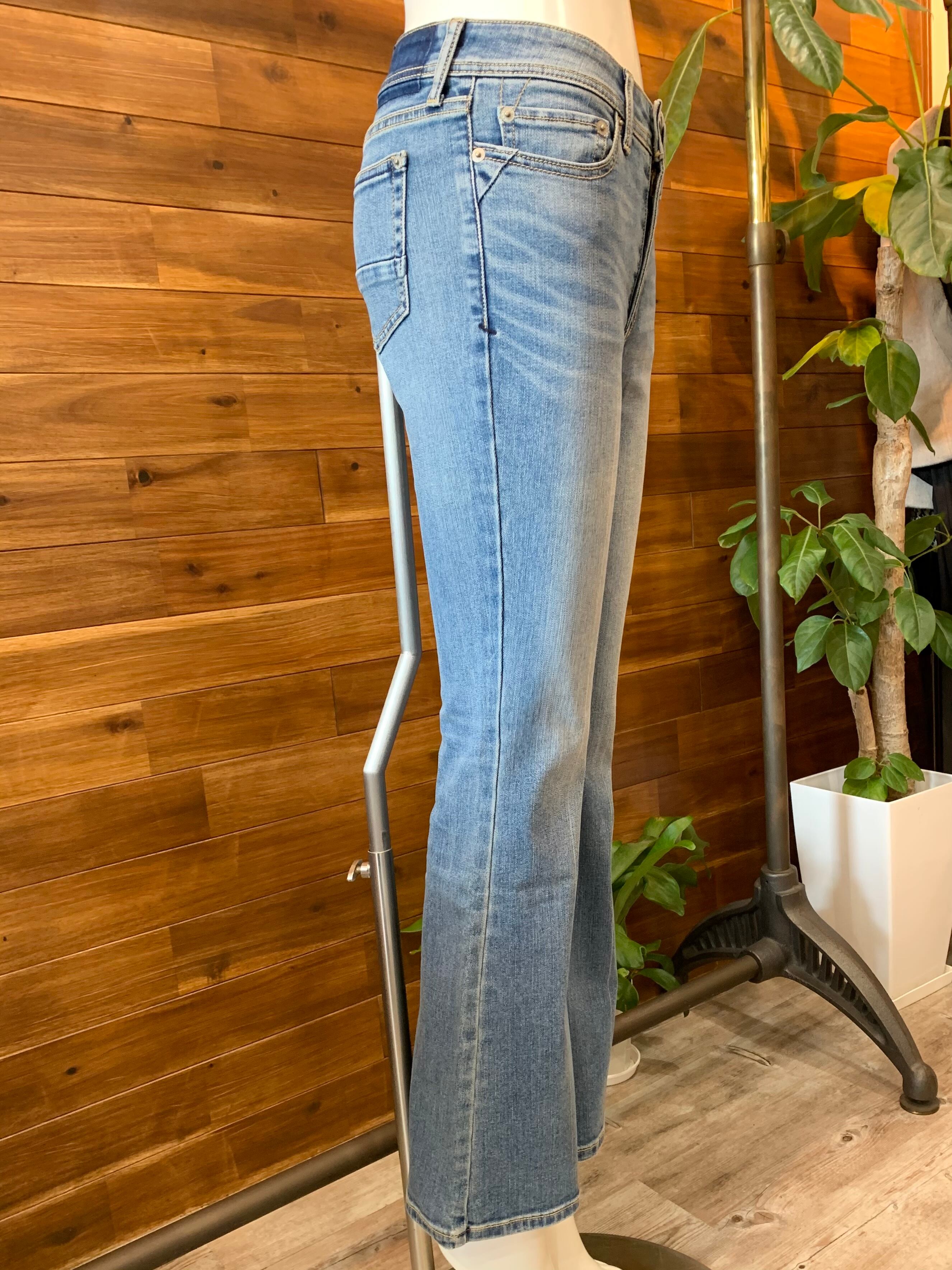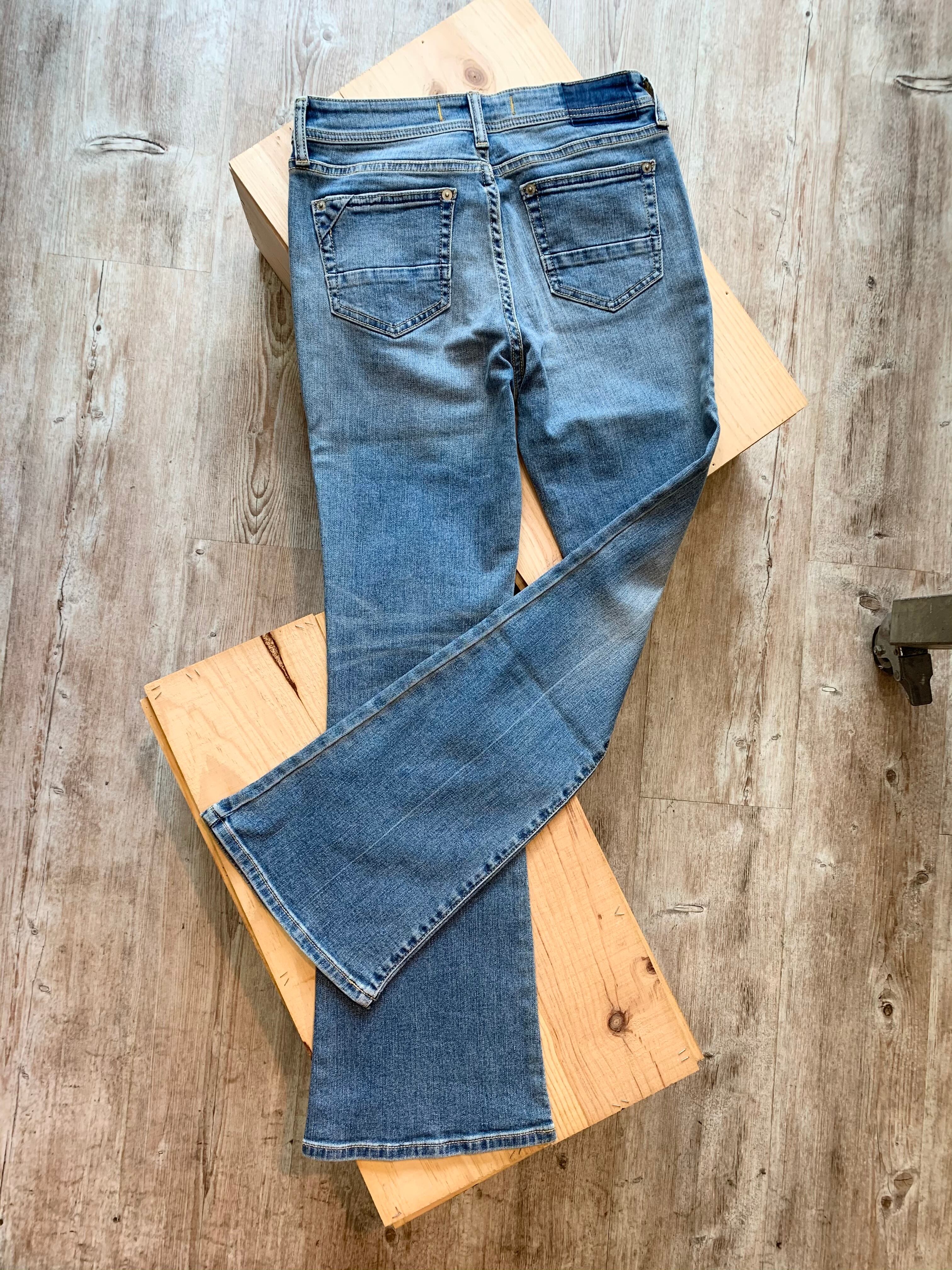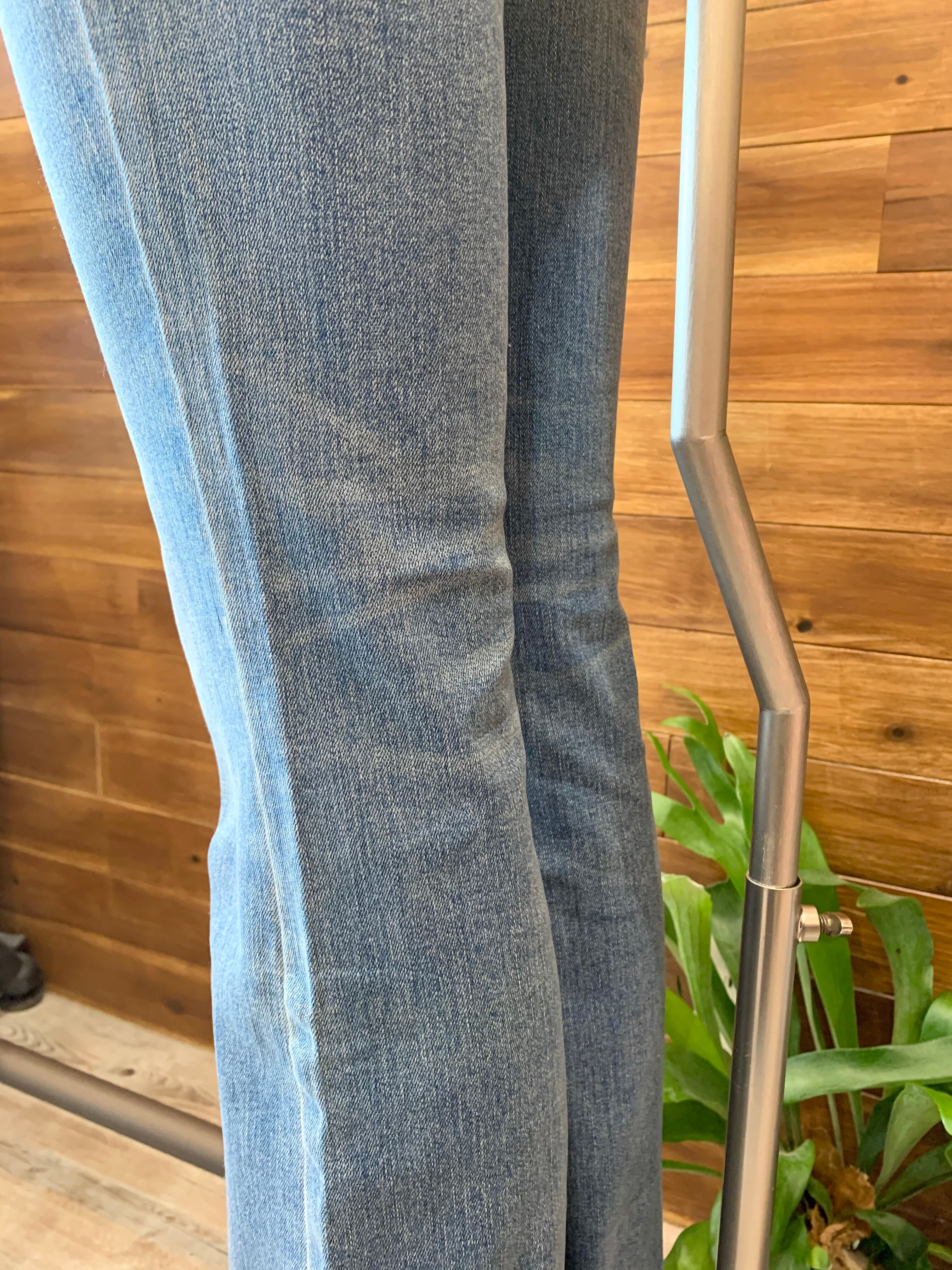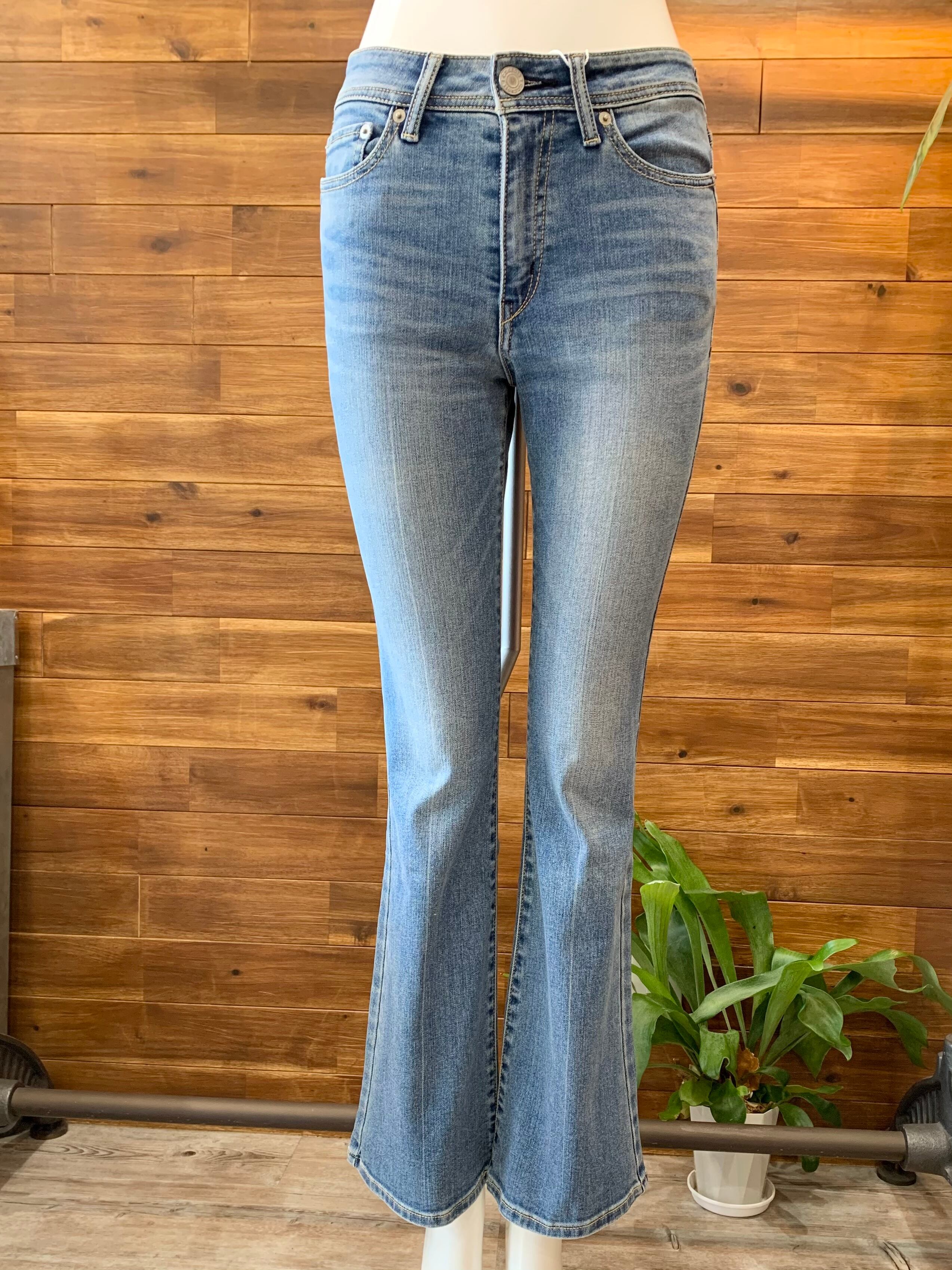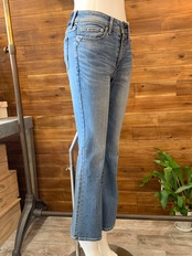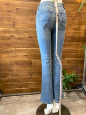 高めに設定したひざ位置や、計算された緩やかに広がるフレア分量で、脚長効果抜群のフレアシルエットのデニム♪