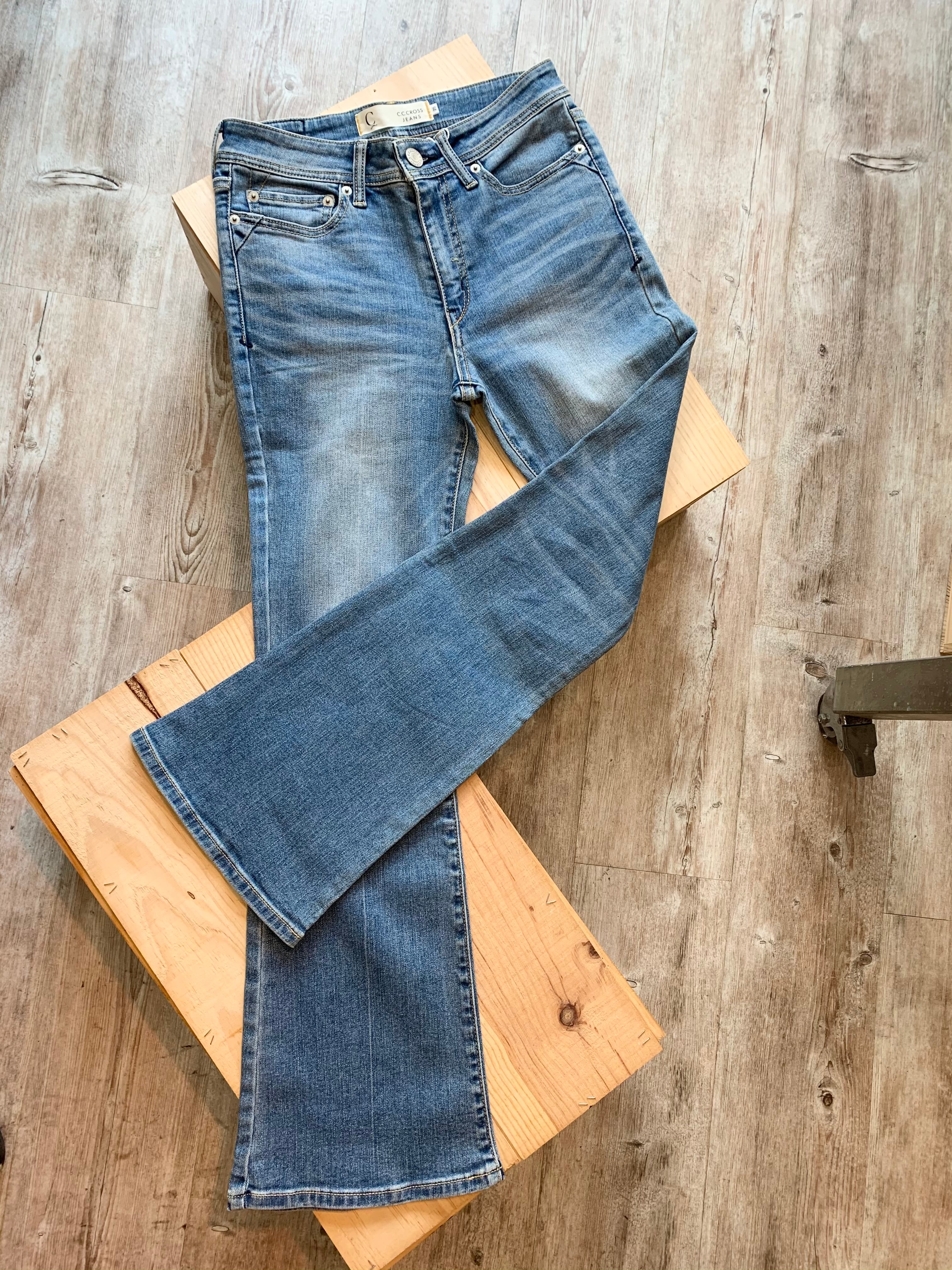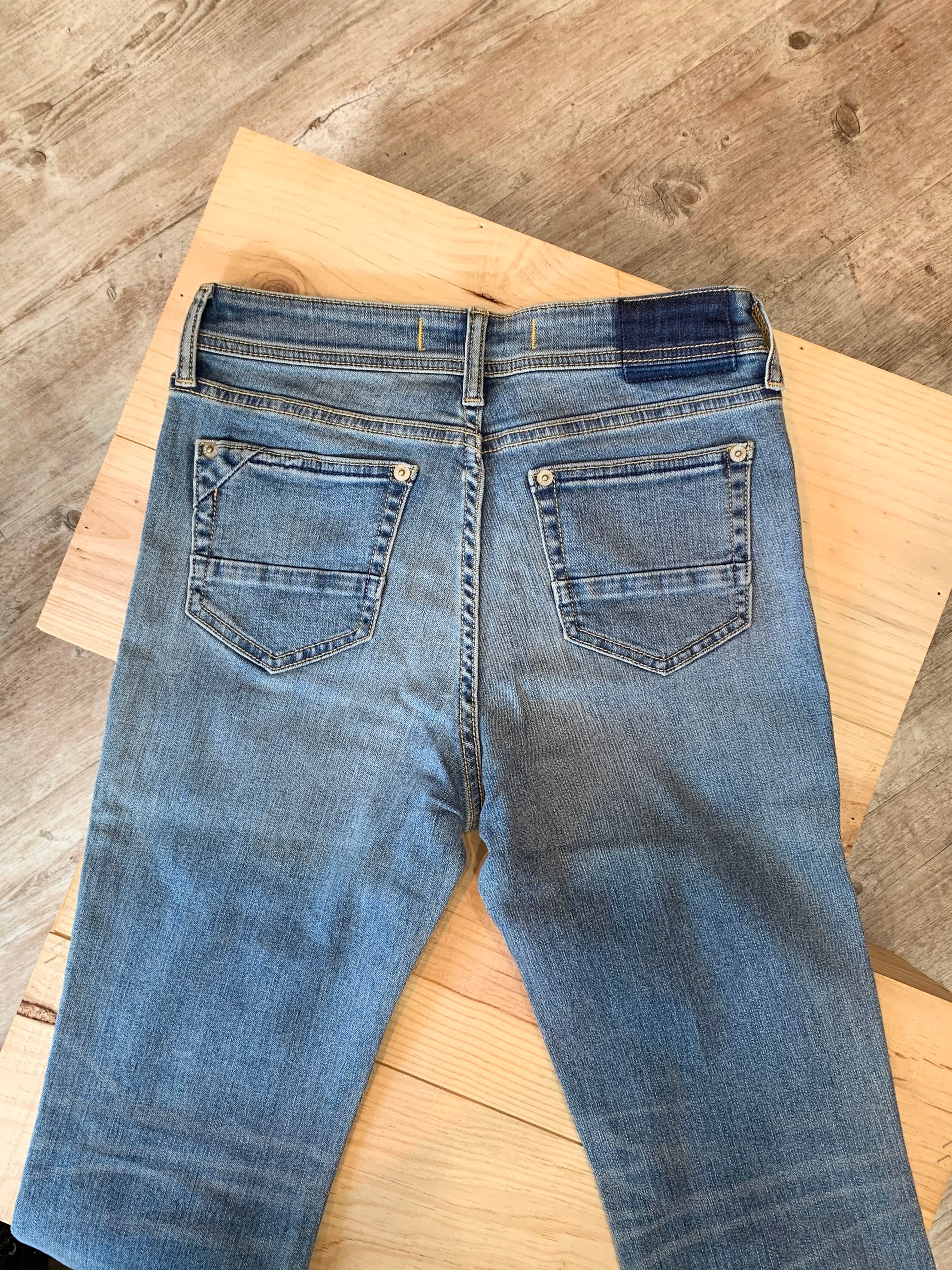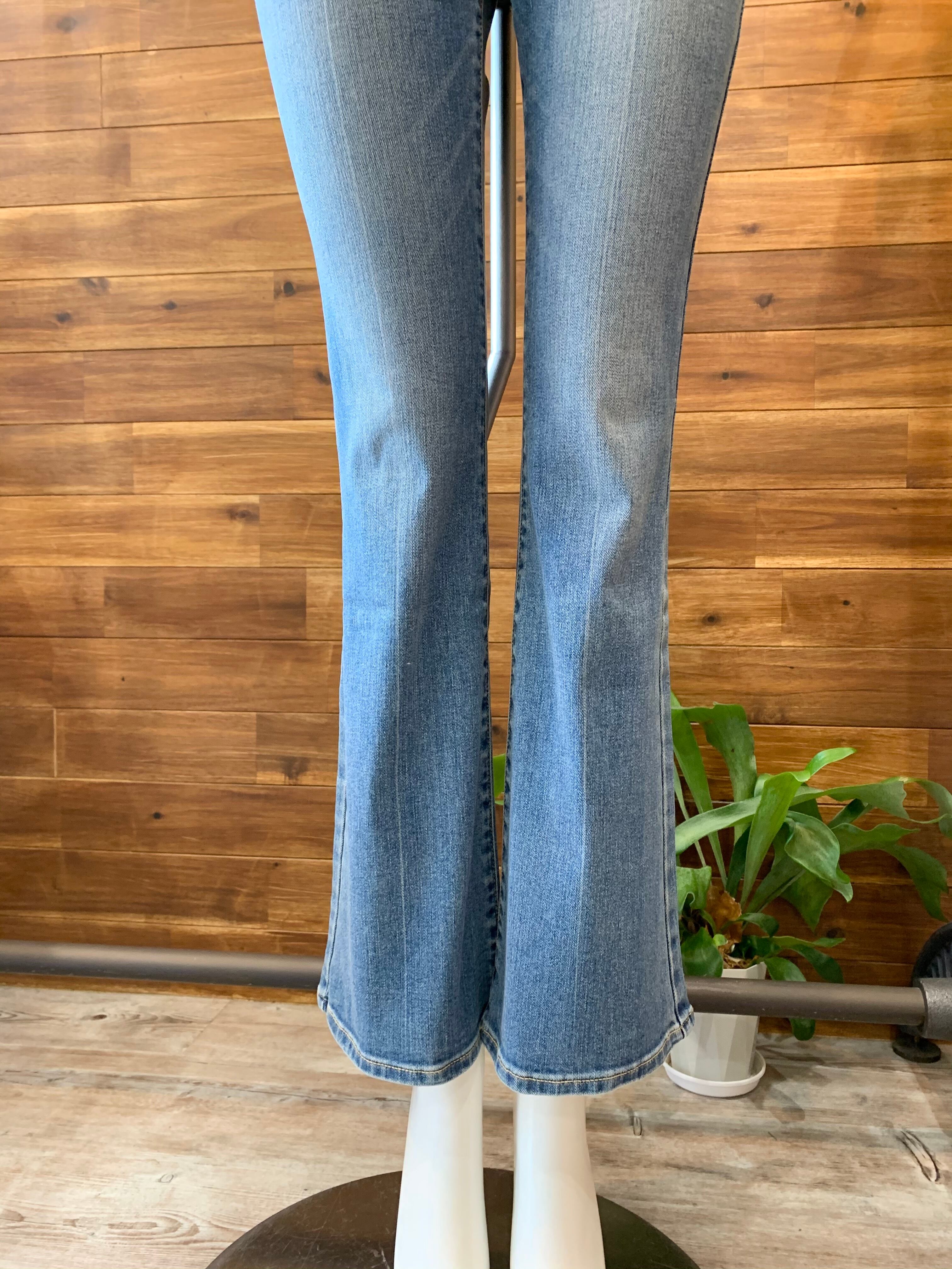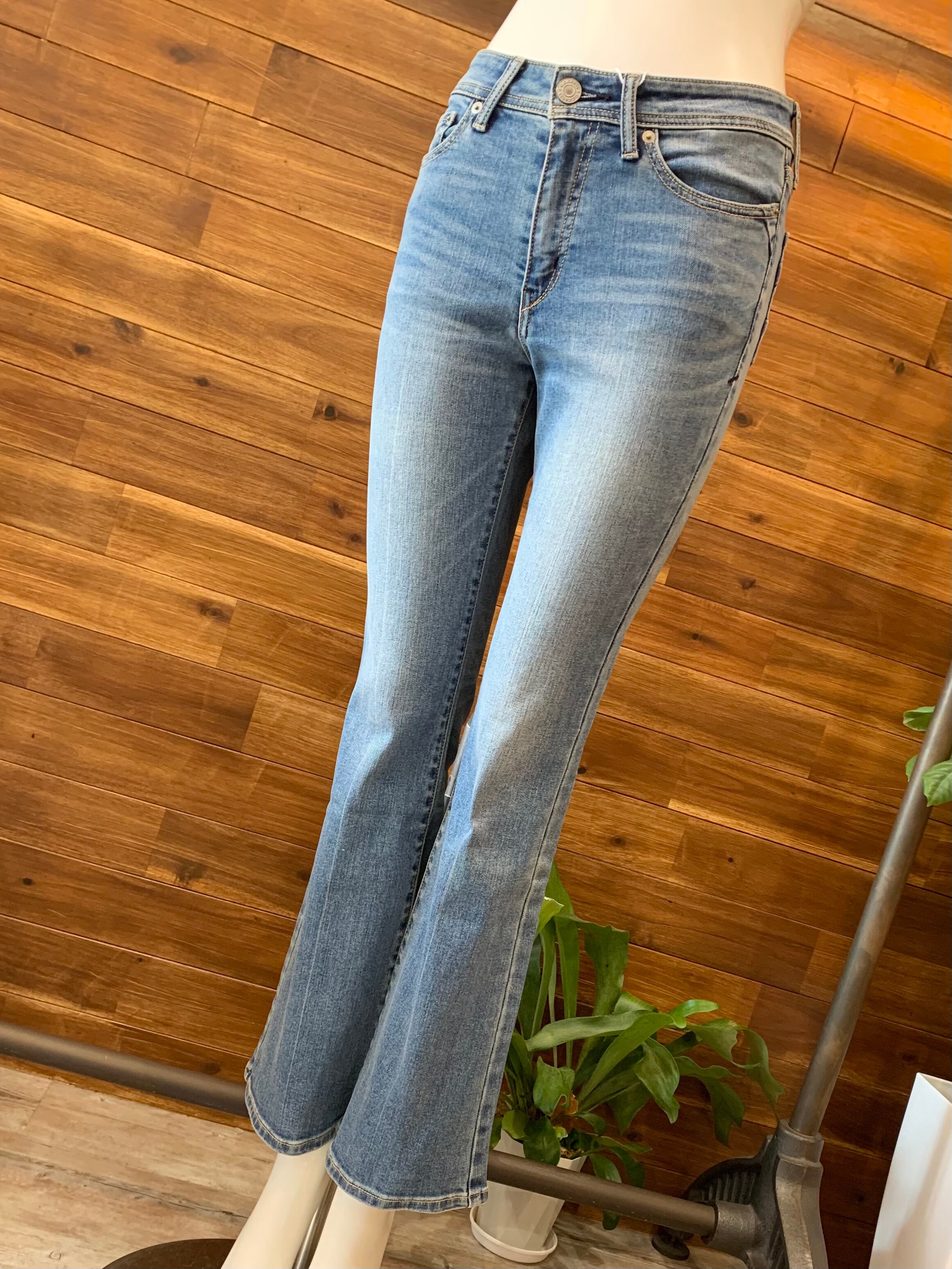 高めに設定したひざ位置や、計算された緩やかに広がるフレア分量で、脚長効果抜群のフレアシルエットのデニム♪