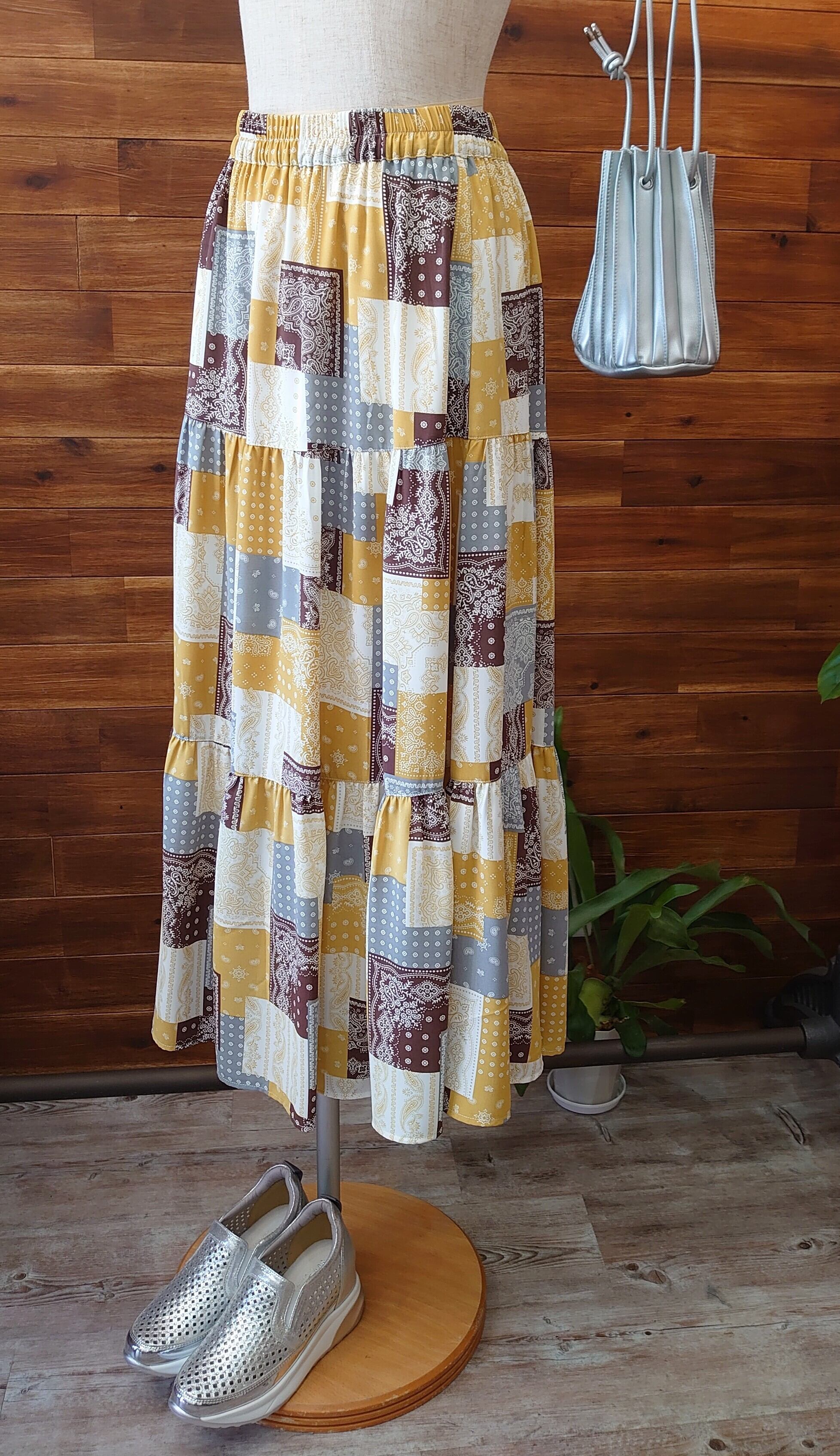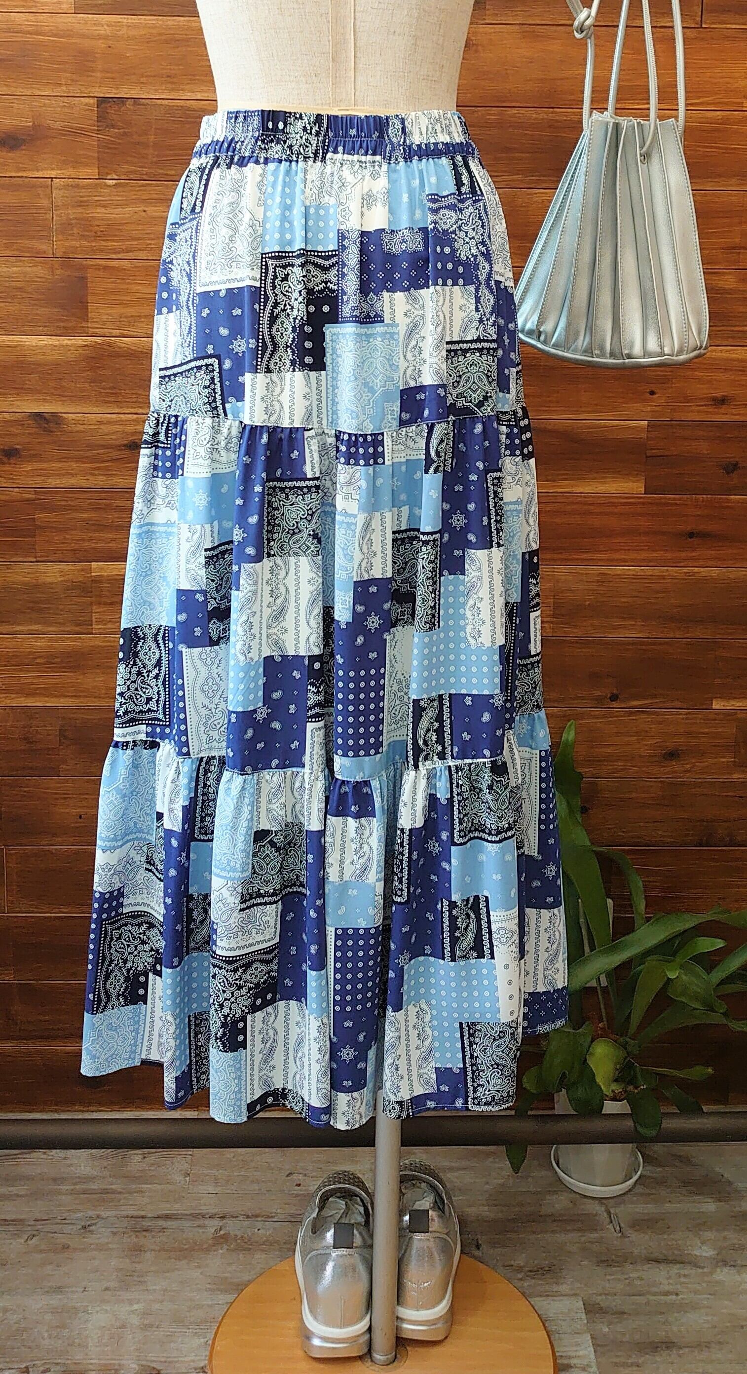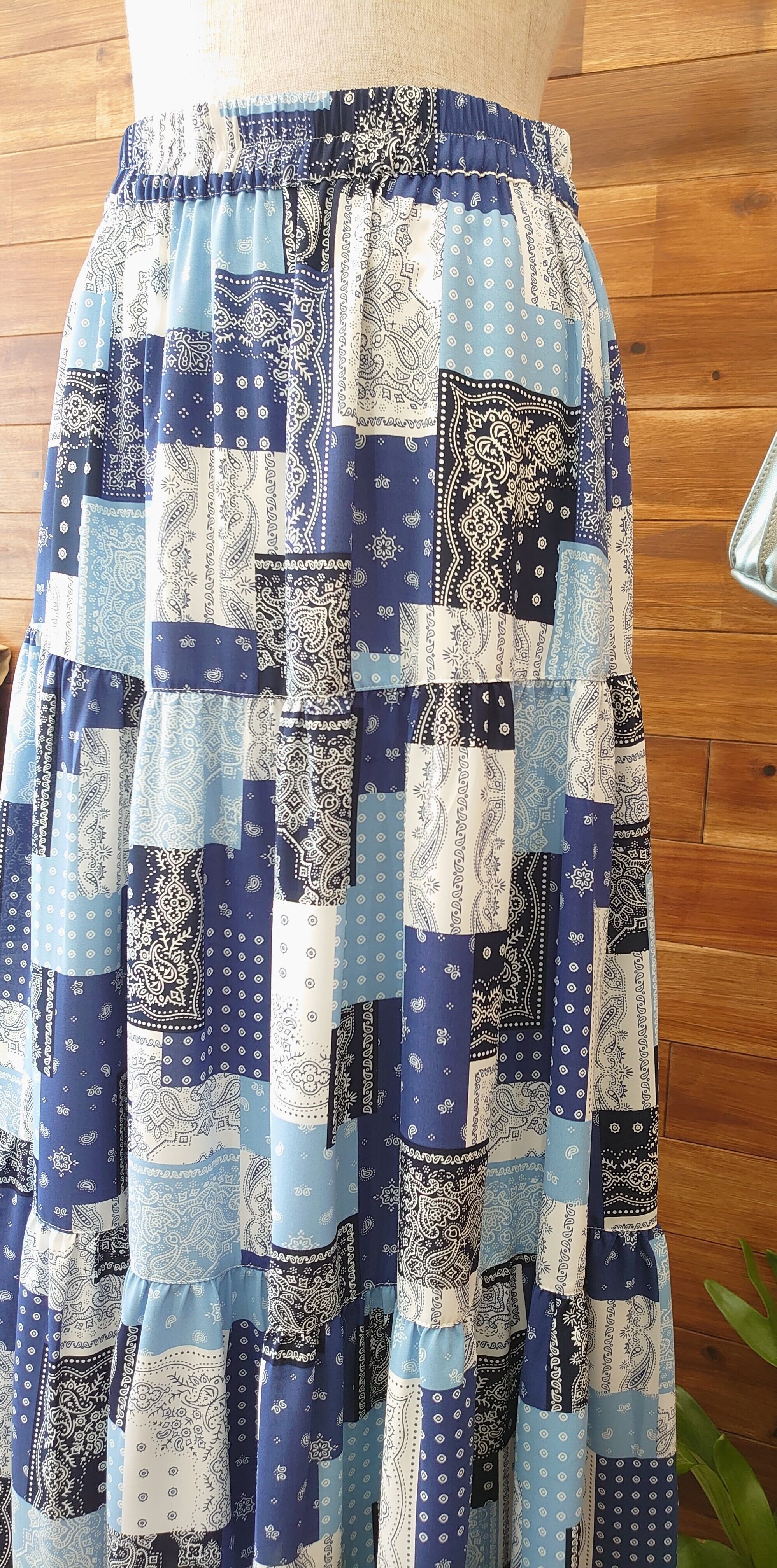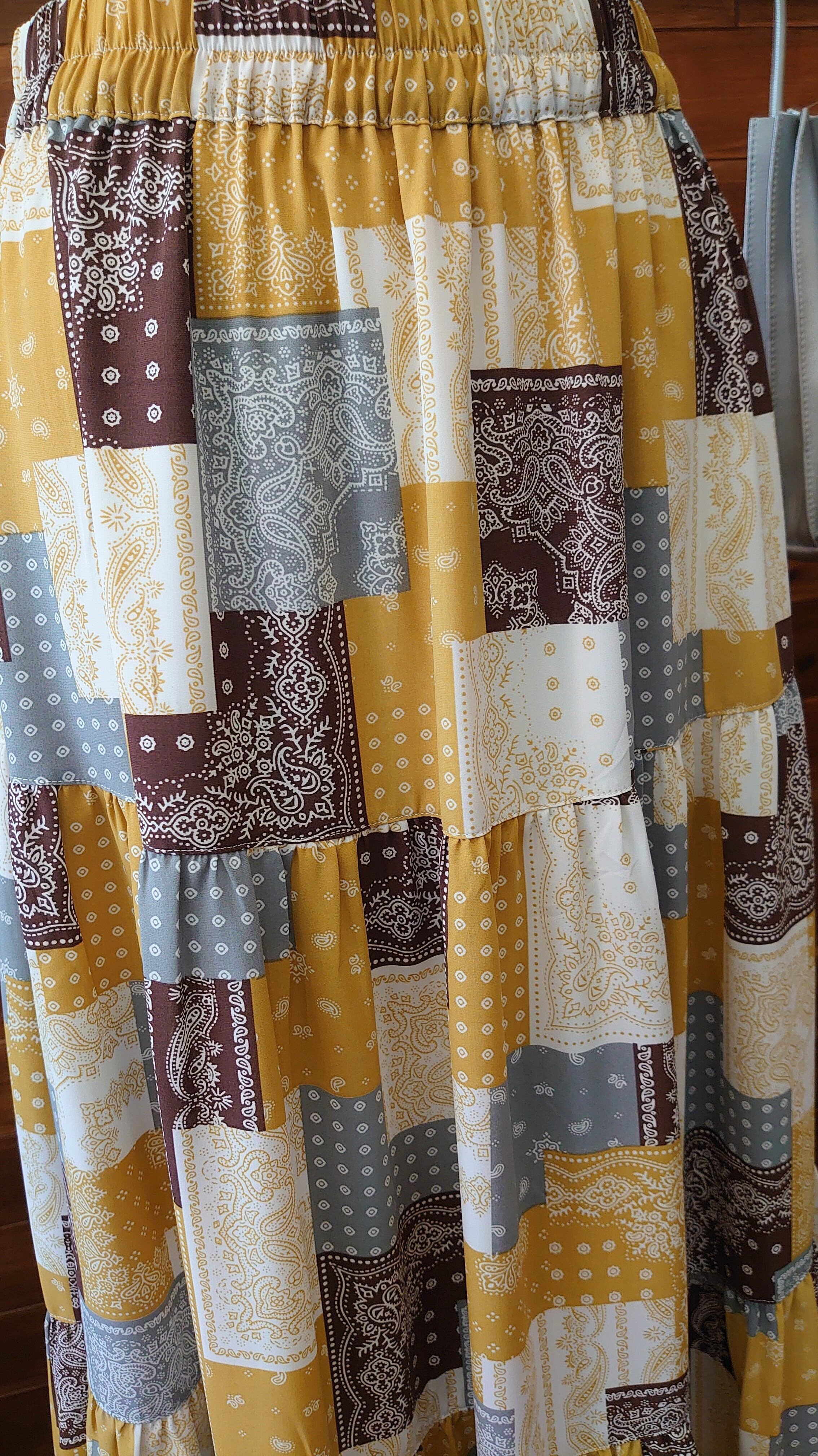ペイズリー柄のバンダナをパッチワークしたような夏らしいデザインに、切り替えのギャザーがとっても可愛いティアードスカート♥️