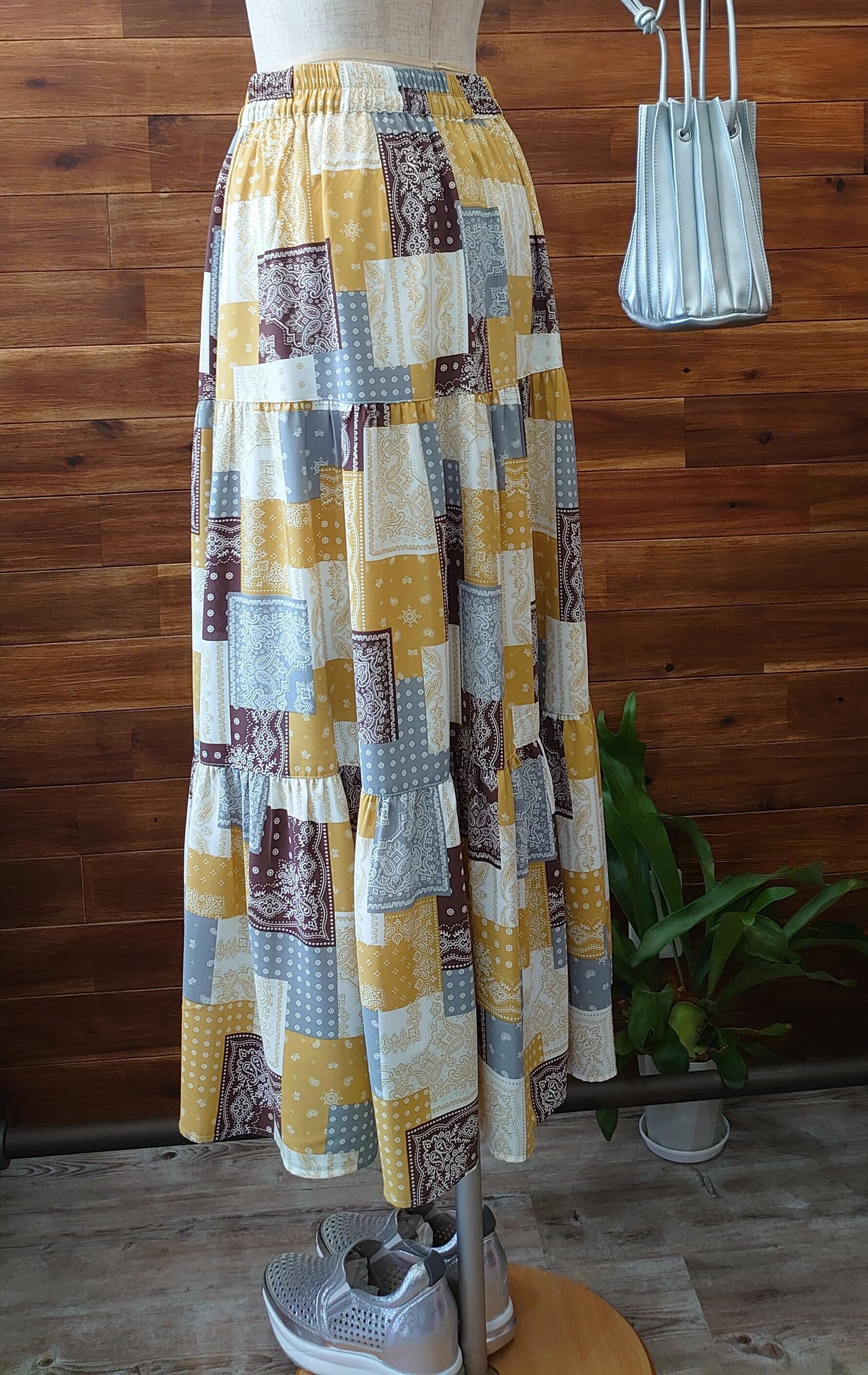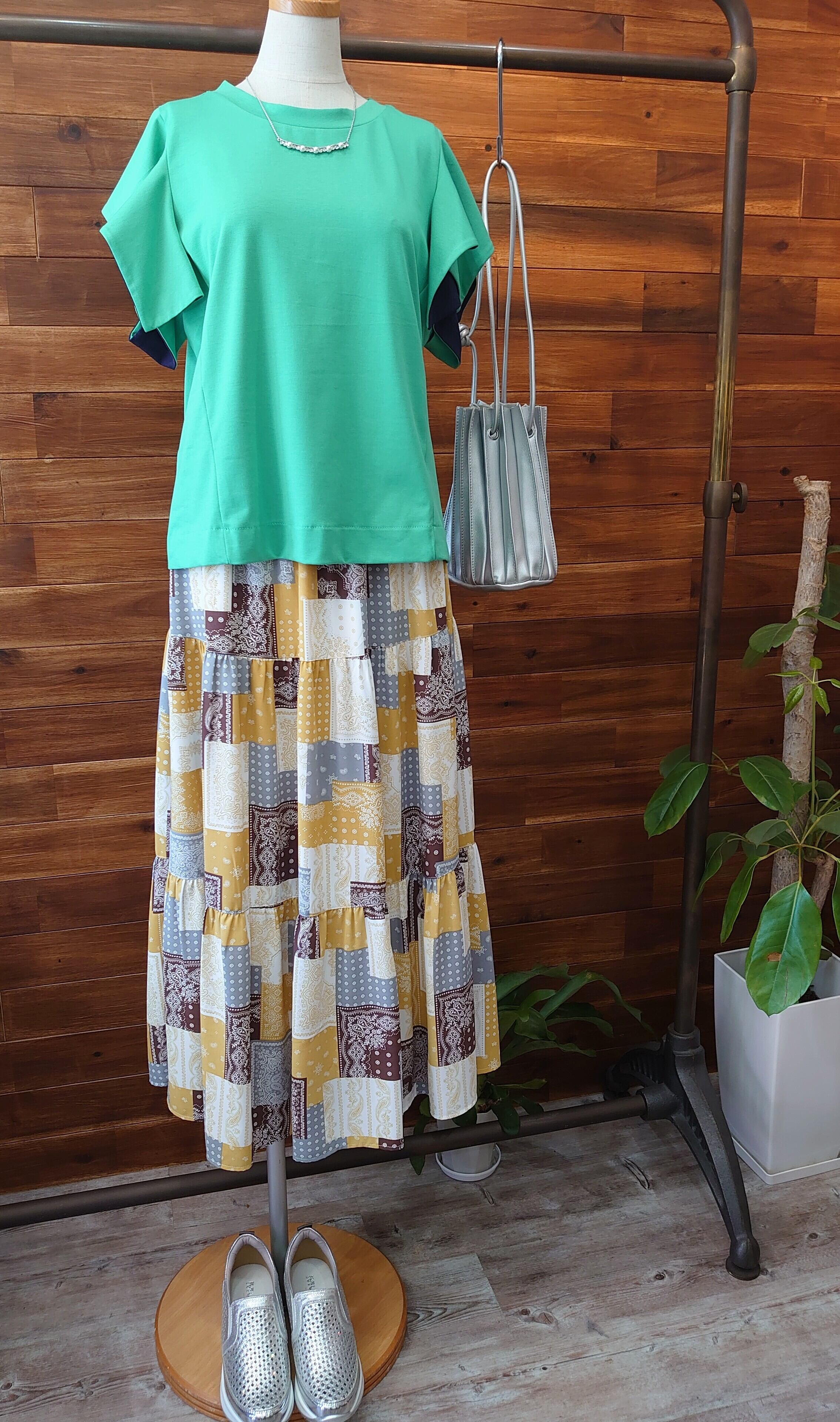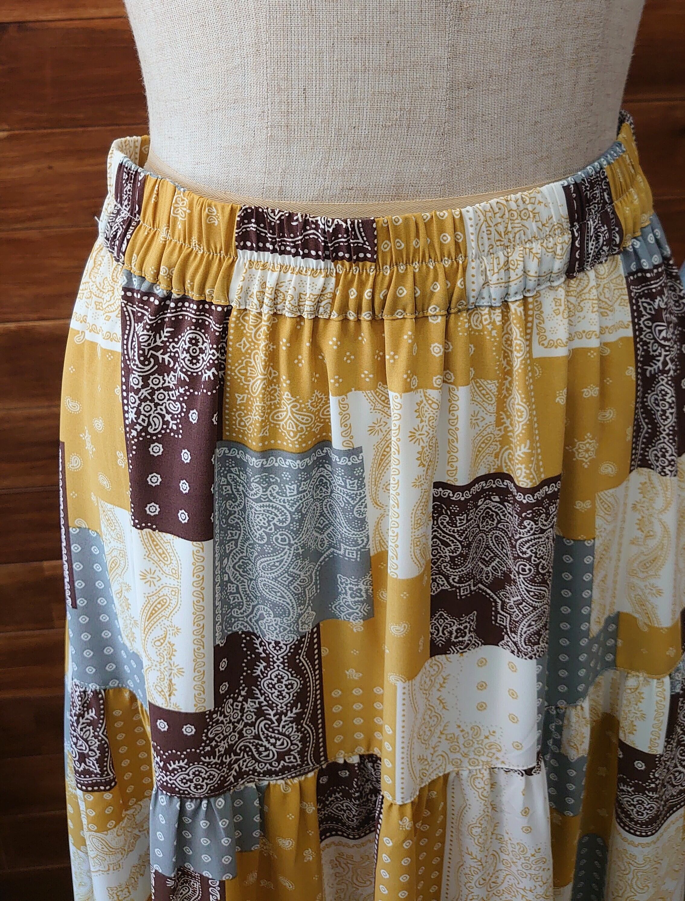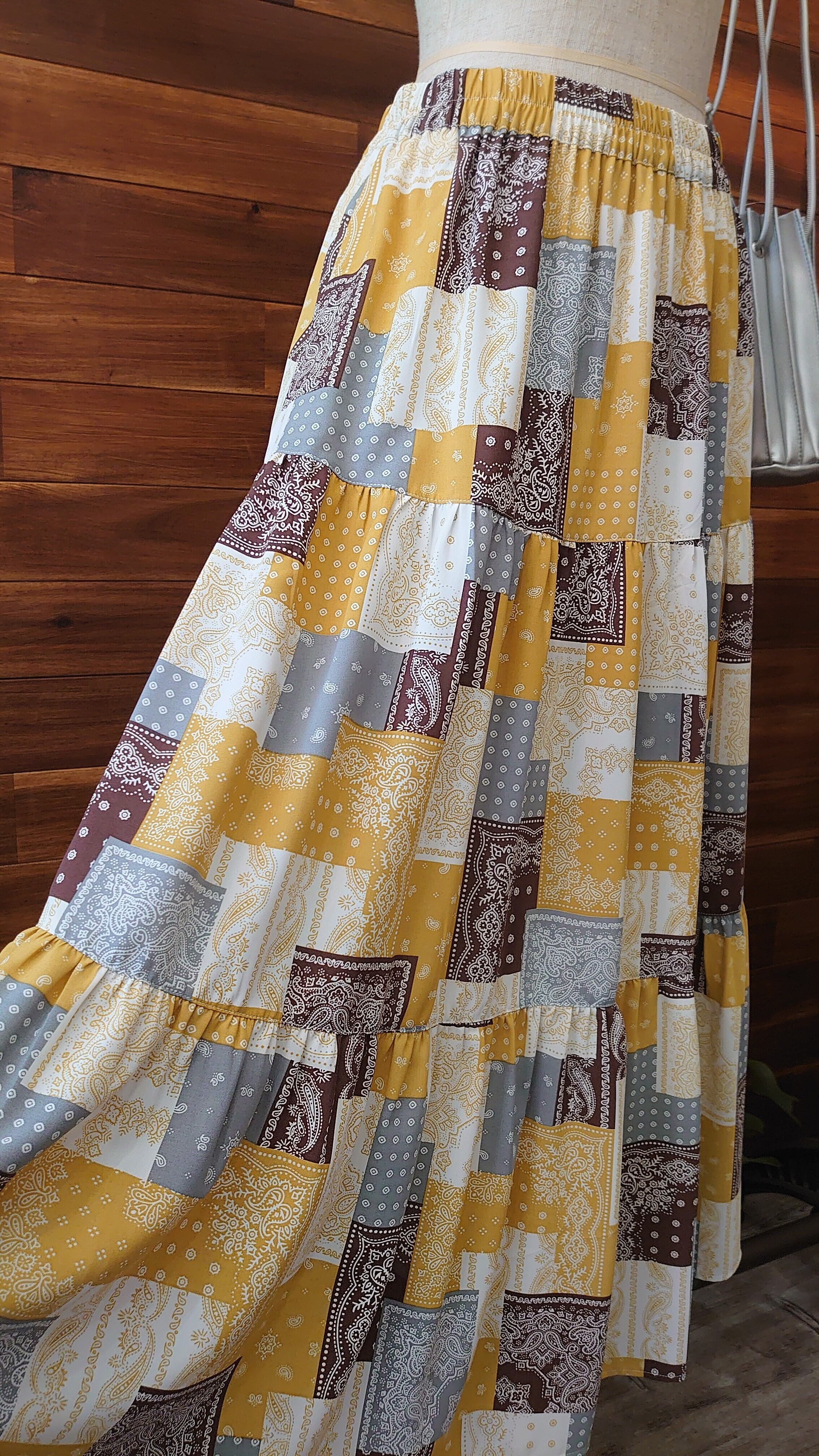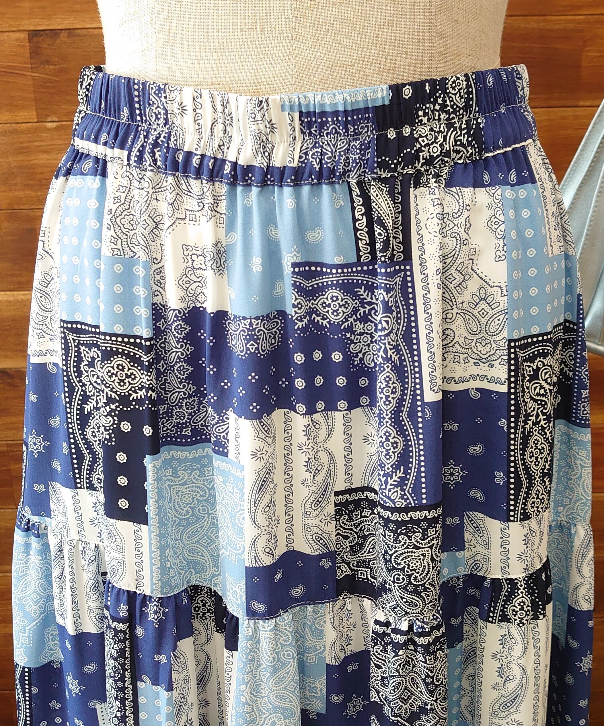ペイズリー柄のバンダナをパッチワークしたような夏らしいデザインに、切り替えのギャザーがとっても可愛いティアードスカート♥️