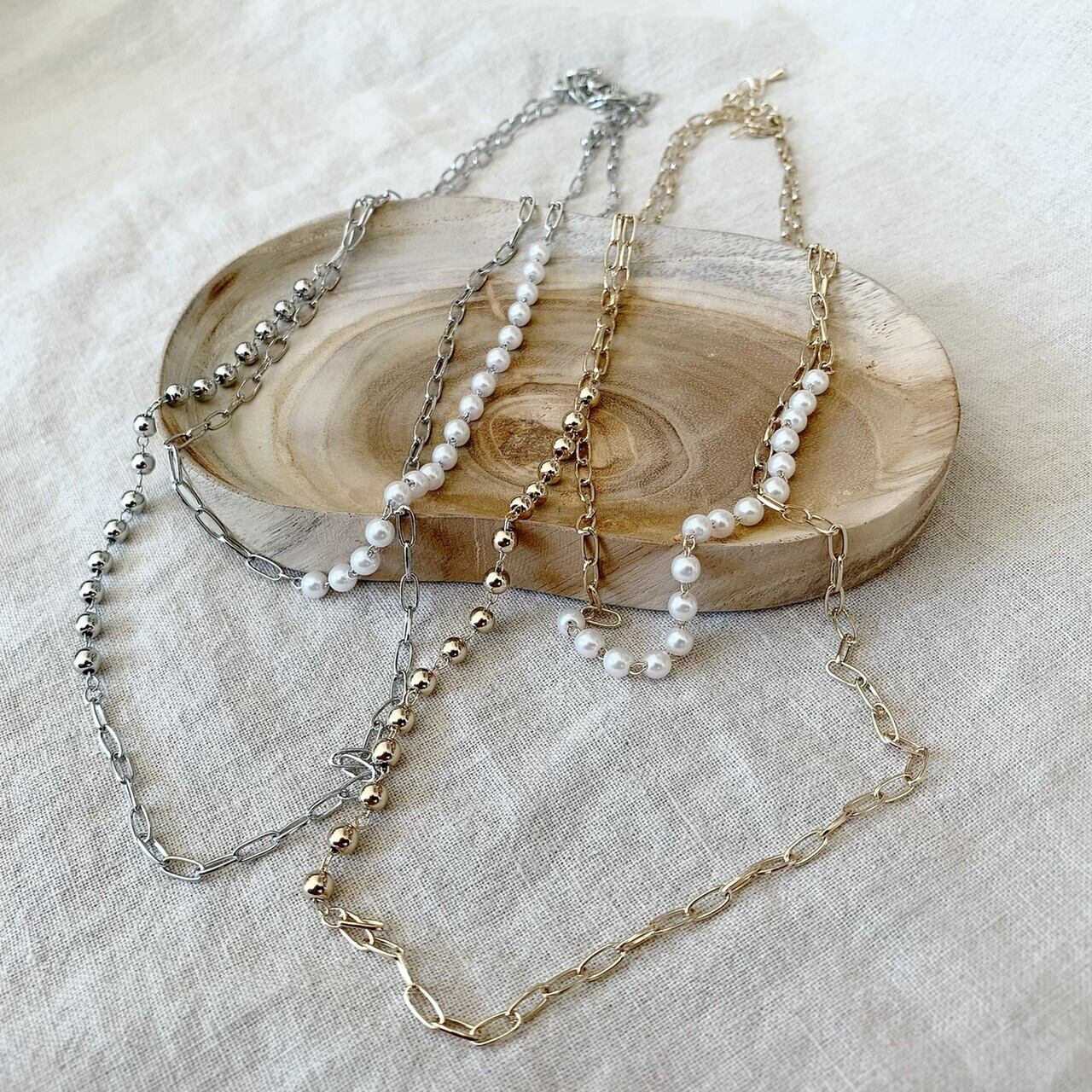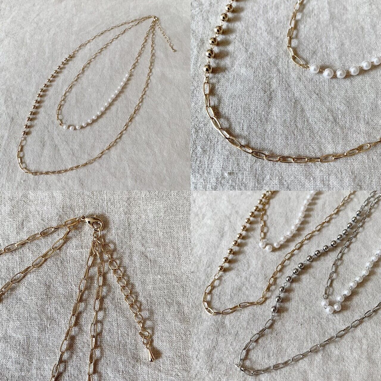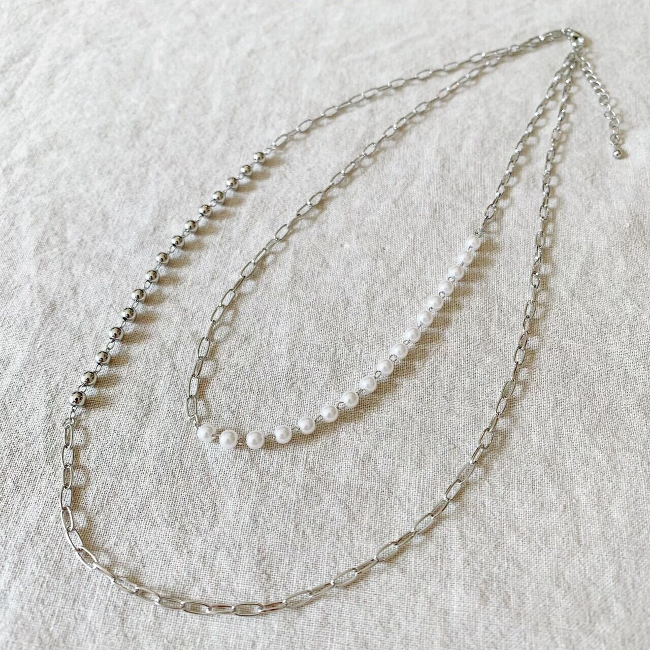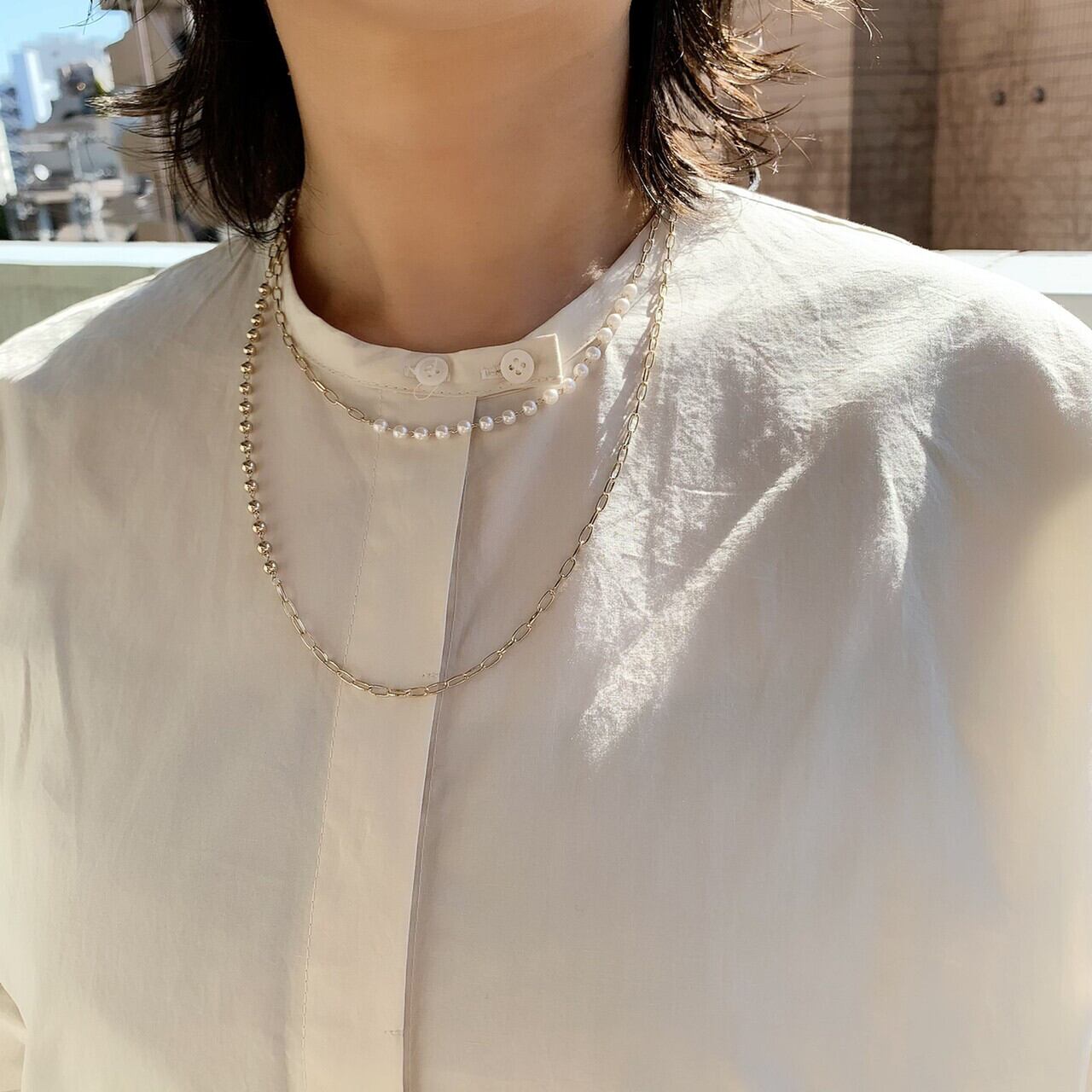 樹脂パールとボールチェーンが左右非対称に胸元に添い、抜け感のあるチェーンとのコンビがデザインに奥深さを表現する、2連レイヤードネックレス♡