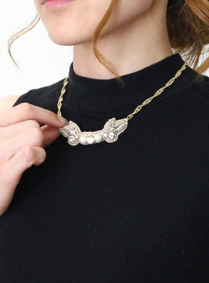 ビジューとパールがデザインされたネックレスは、見た目よりも軽くてストレスフリーです。