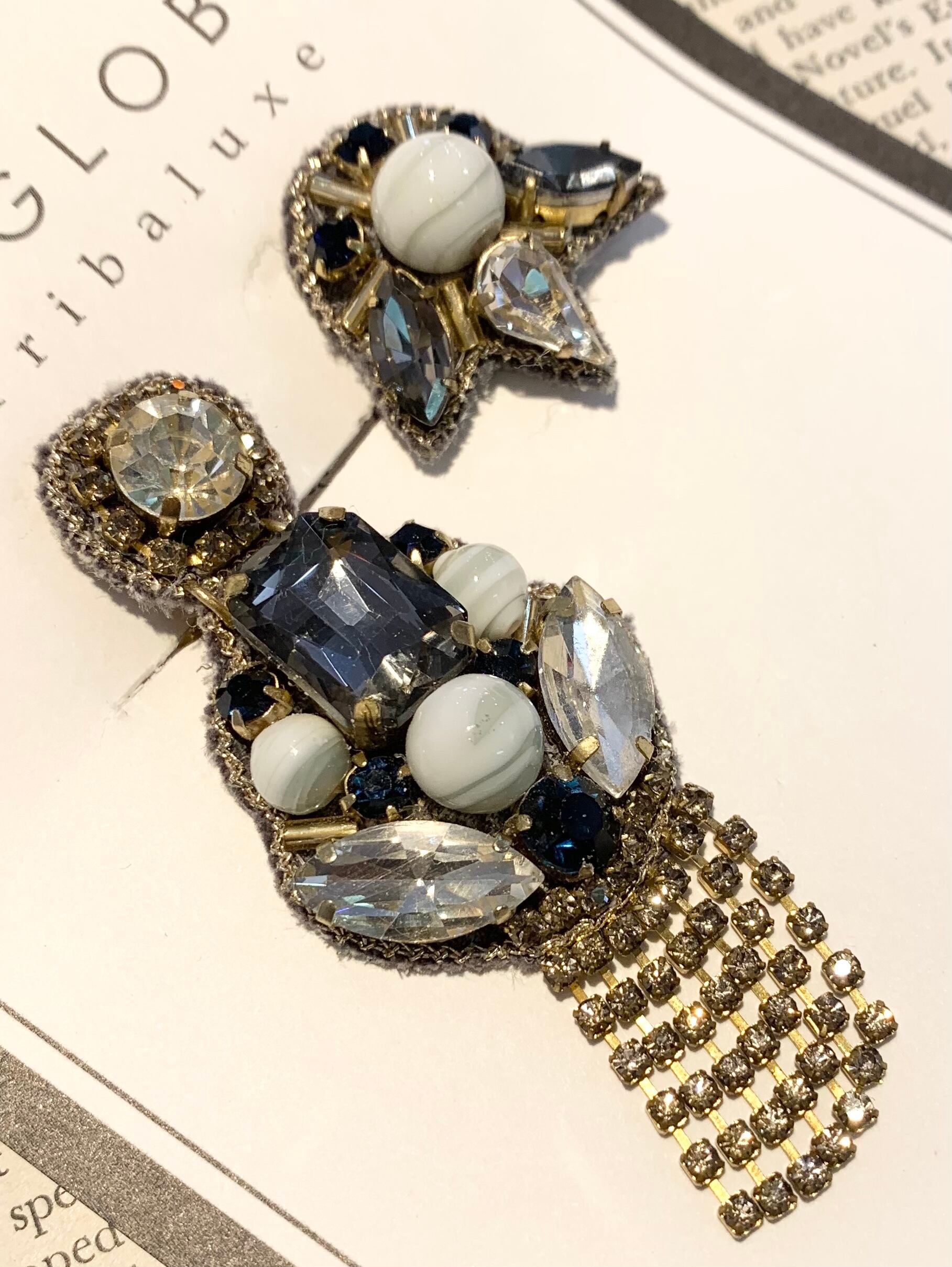 ビジュー刺繍xラインストーンアシンメトリーイヤリング