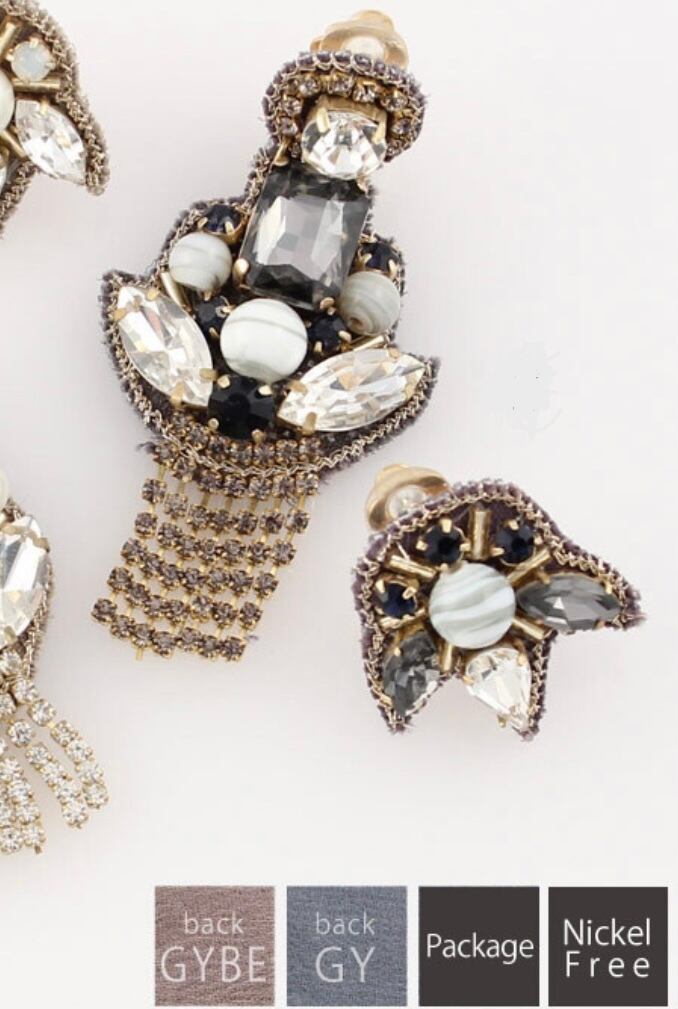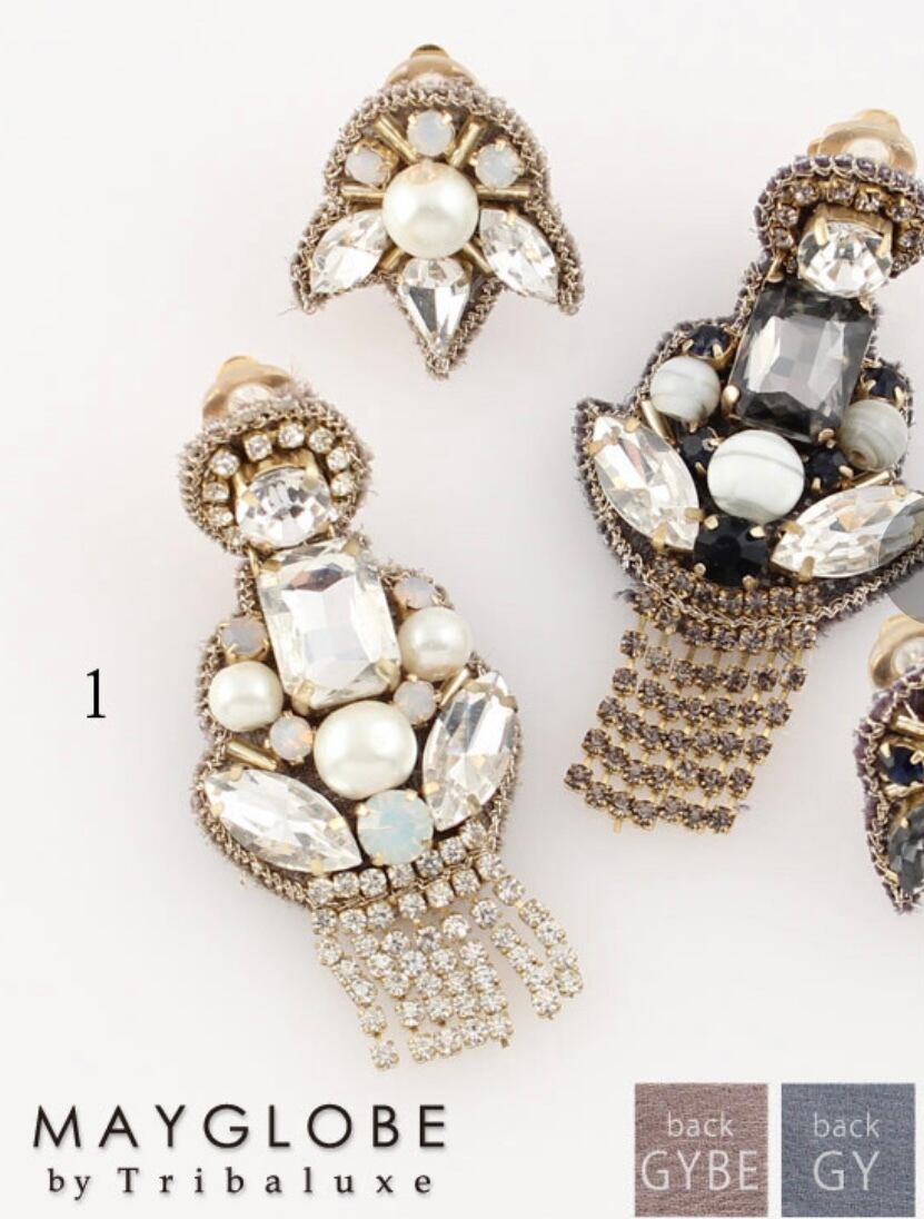 MAYGLOBE by Tribaluxe (メイグローブバイトライバラクス)のビジュー刺繍モチーフとラインストーンのアシンメトリーイヤリングです。