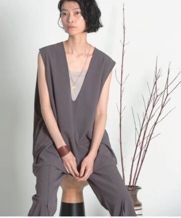 深めのVネックで顔周りはスッキリとした大人っぽい印象に。