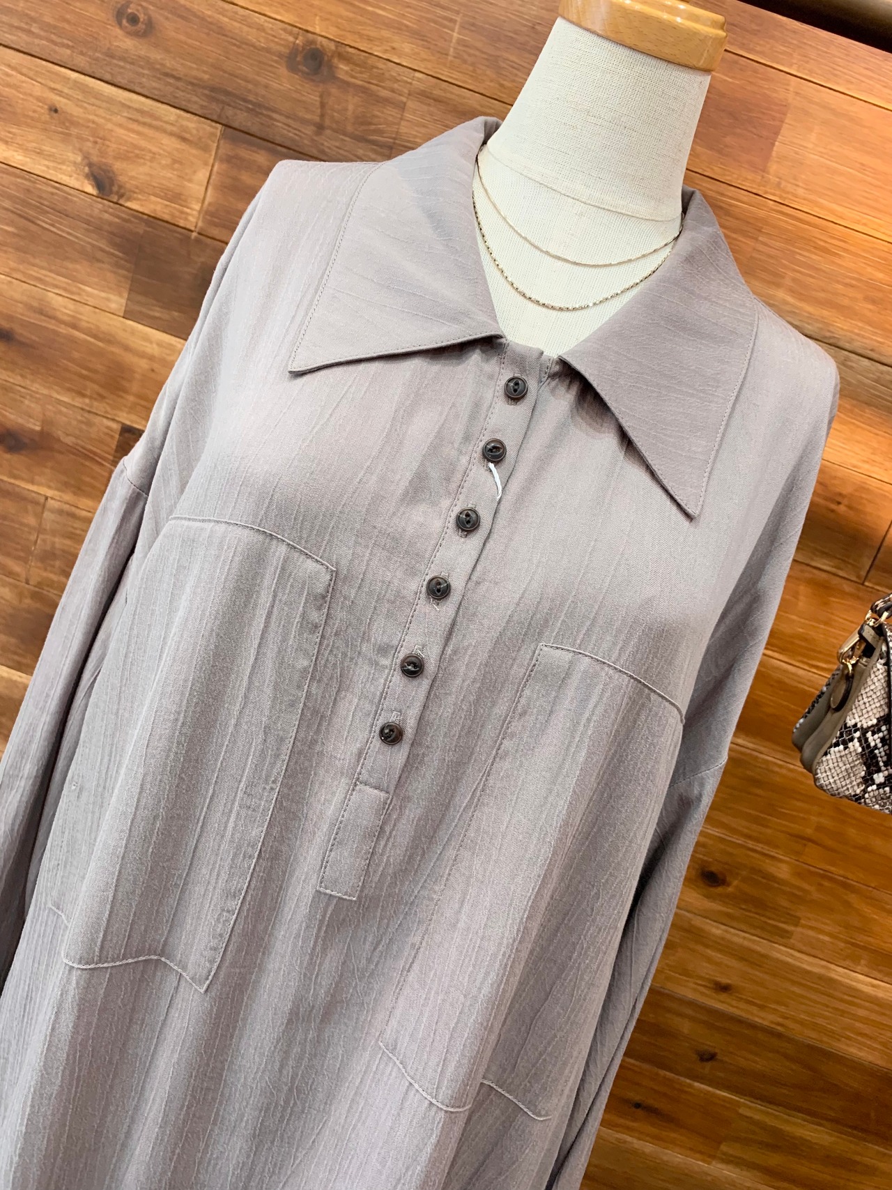 トレンドのビッグカラーに小さなボタン、両胸の大きめのパッチポケットがデザインのポイントです♡