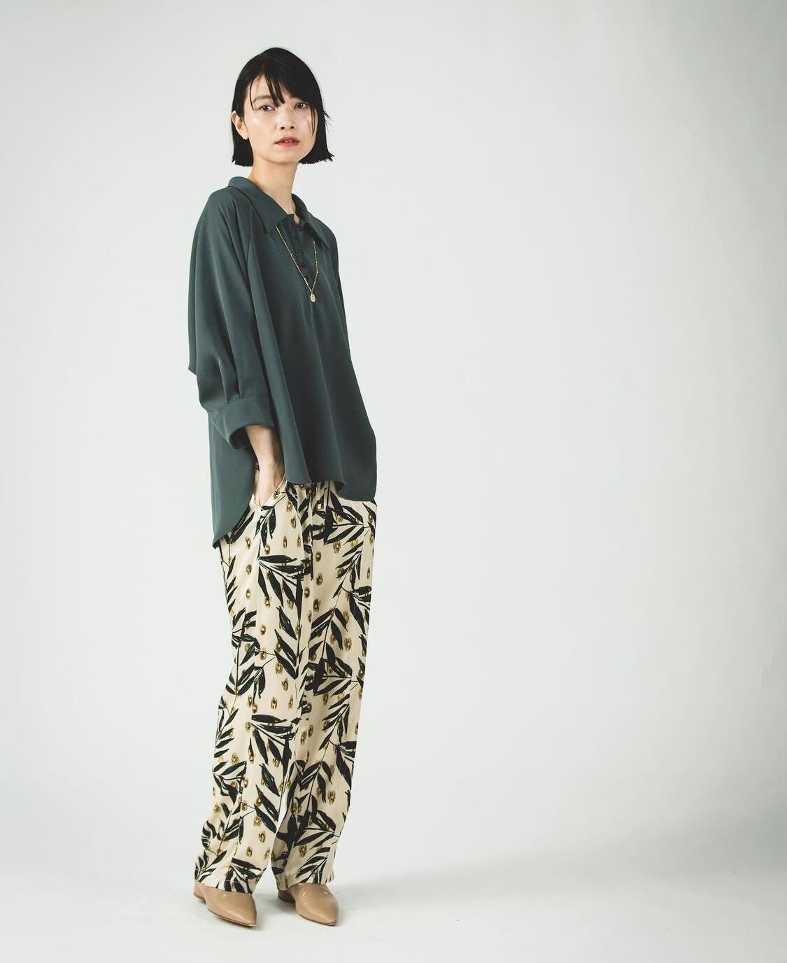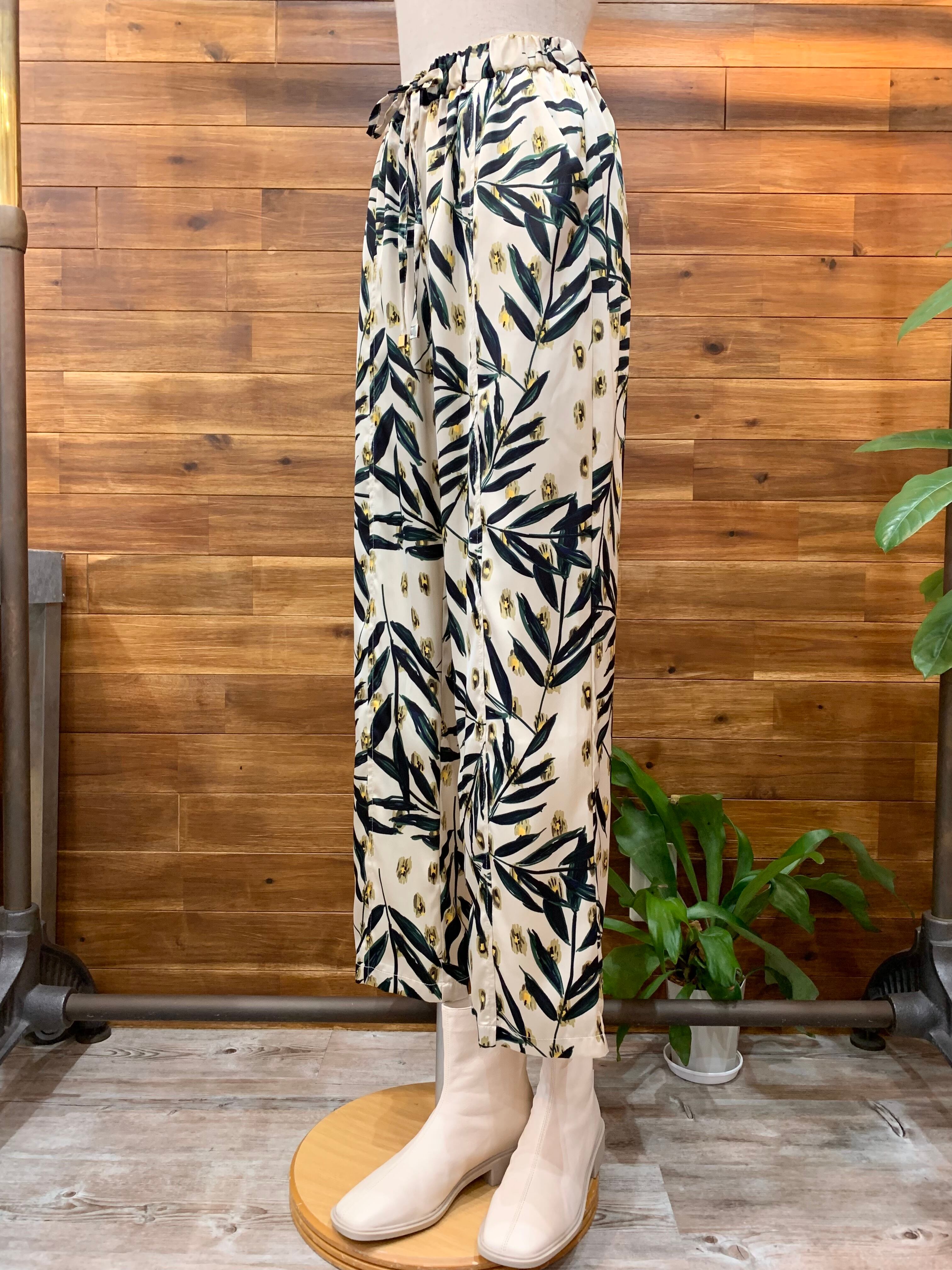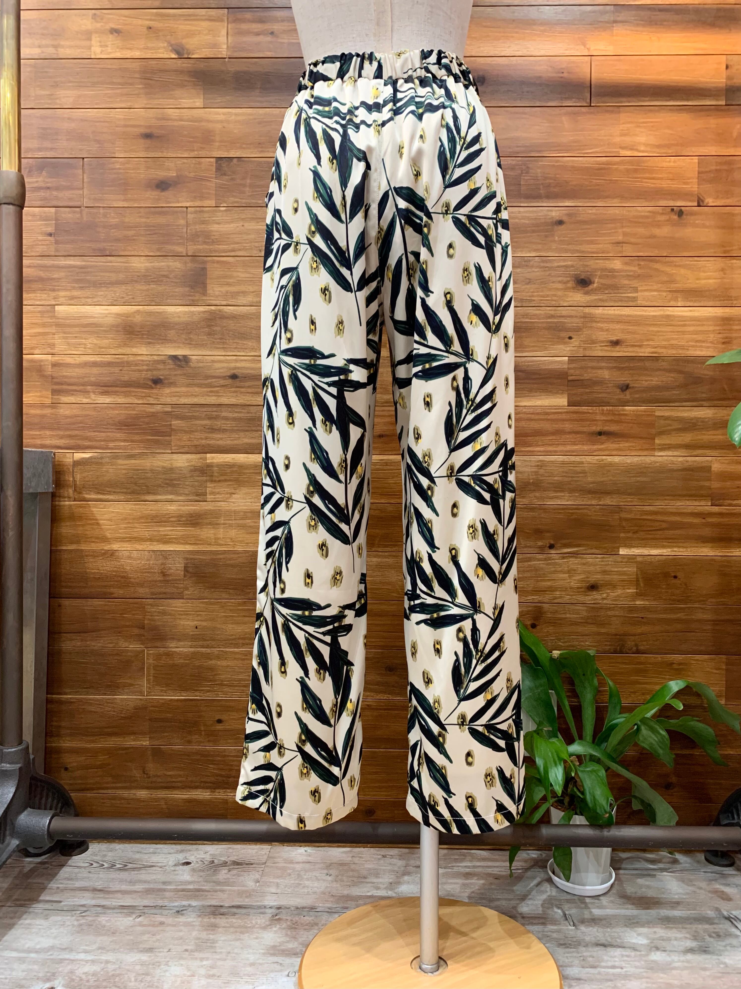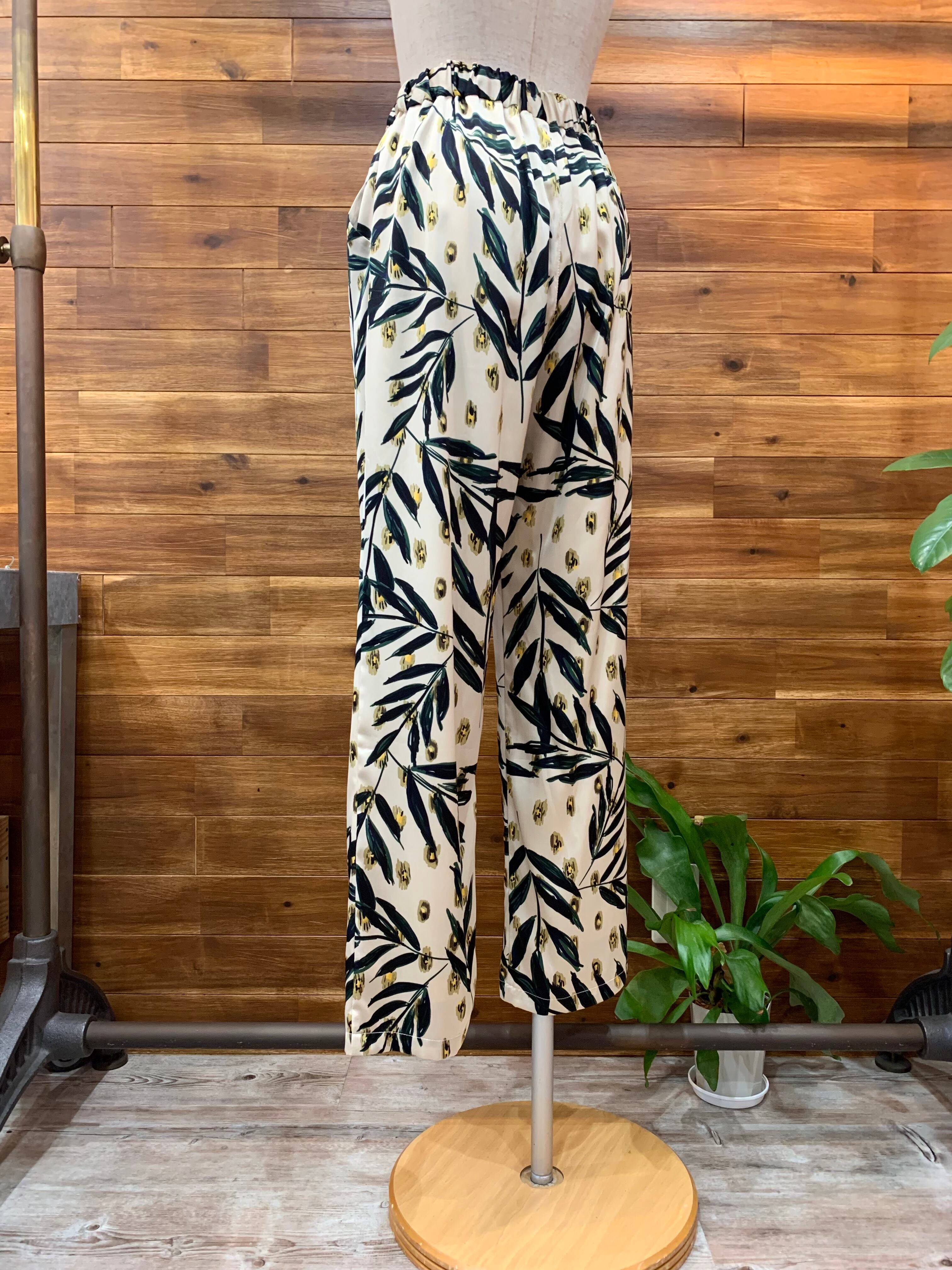大きめのリーフ柄が華やかで個性的なイージーパンツ。