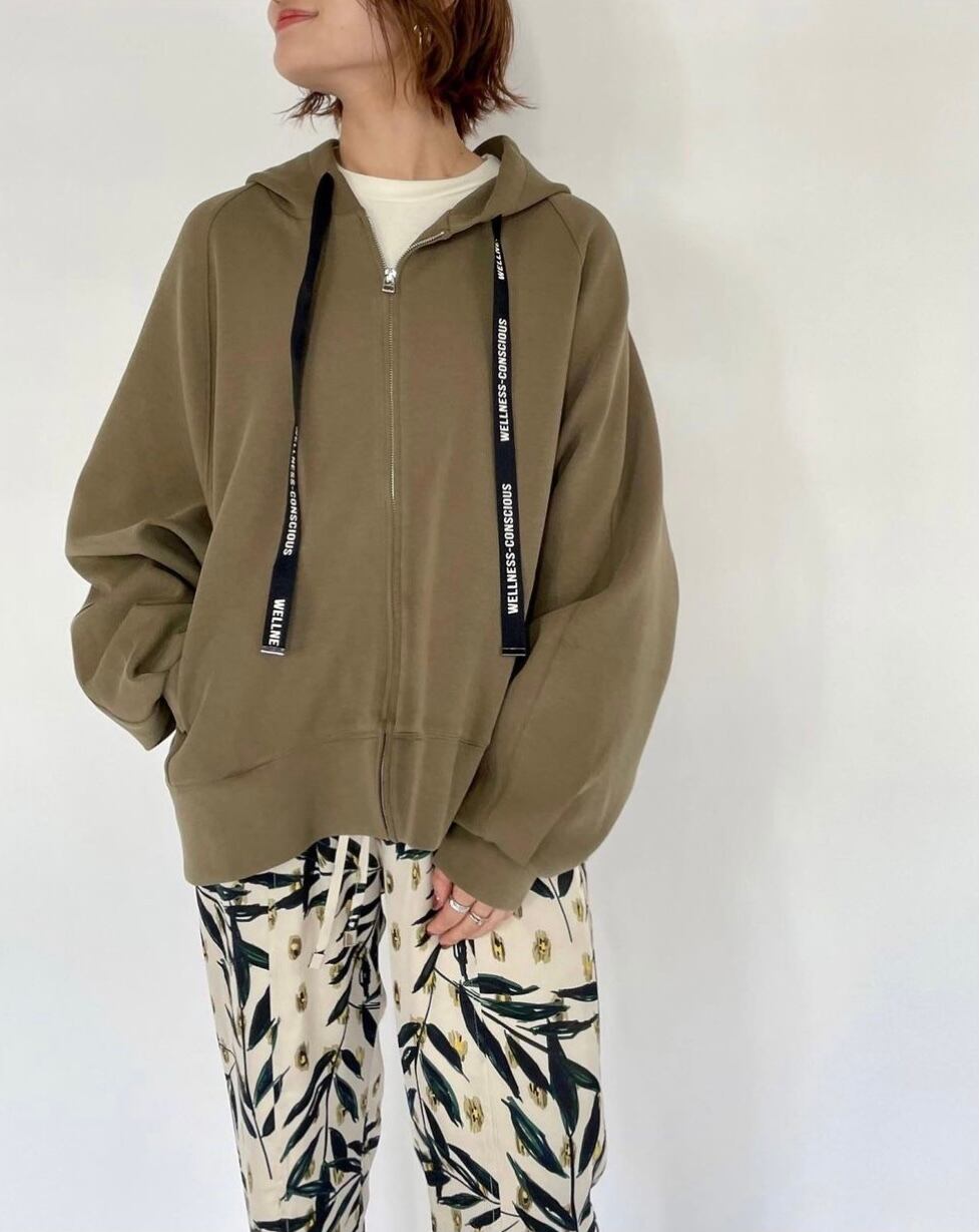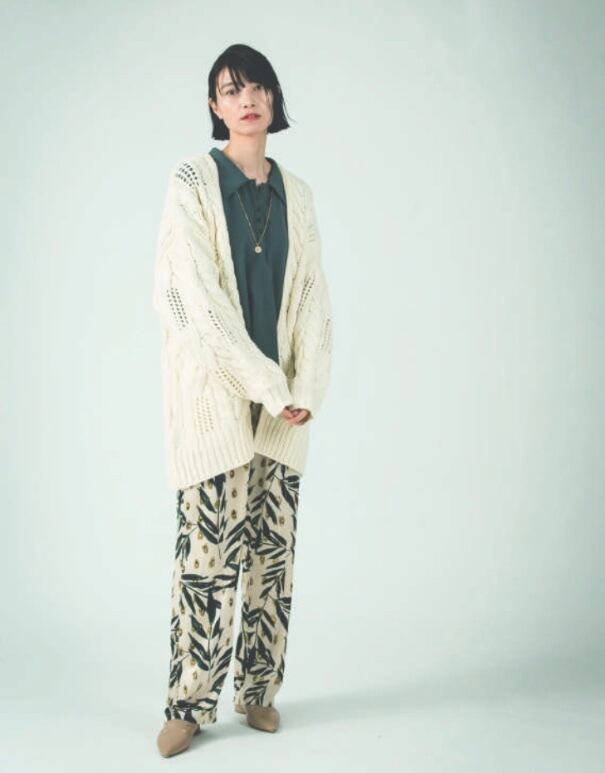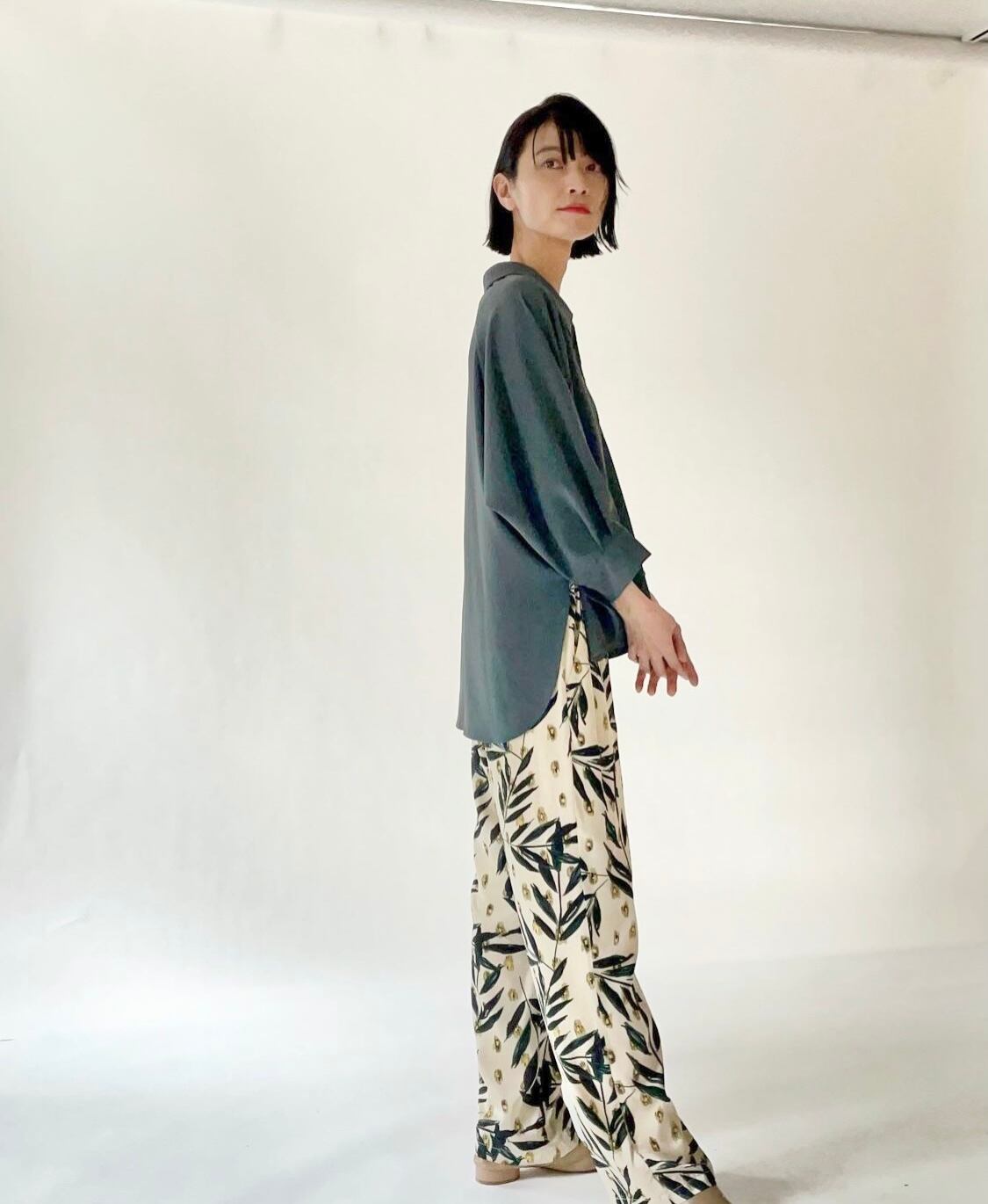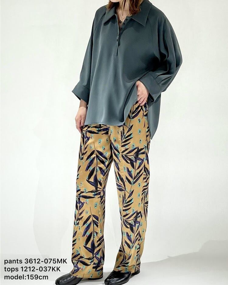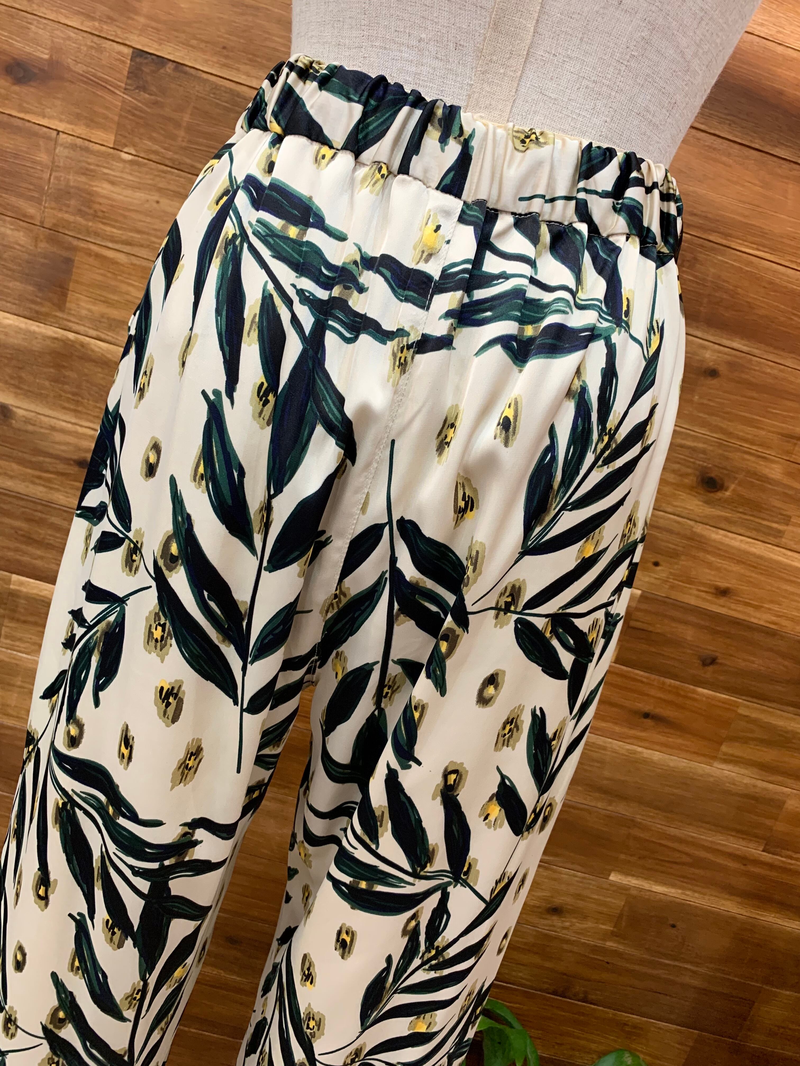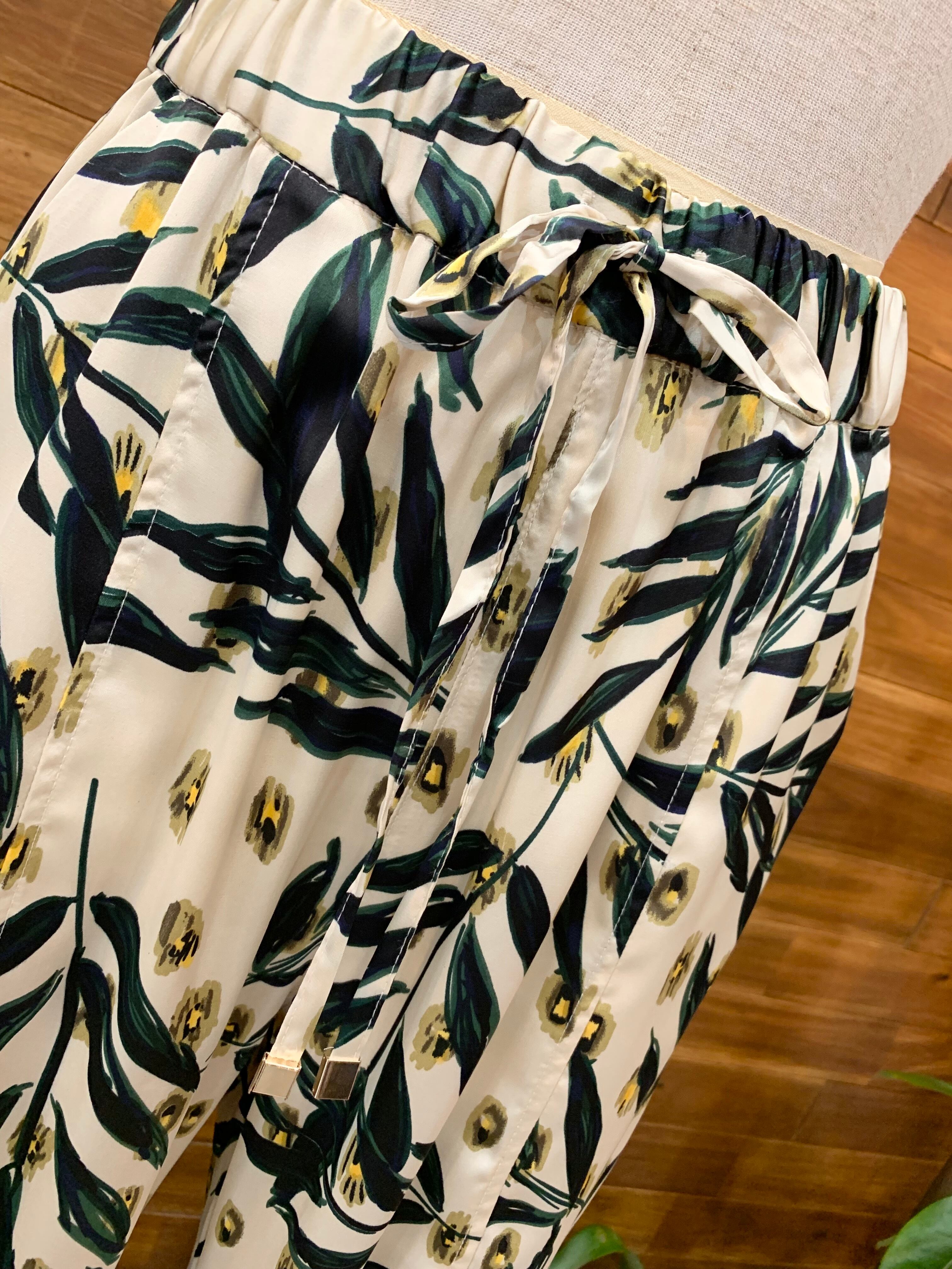 大きめのリーフ柄が華やかで個性的なイージーパンツ。