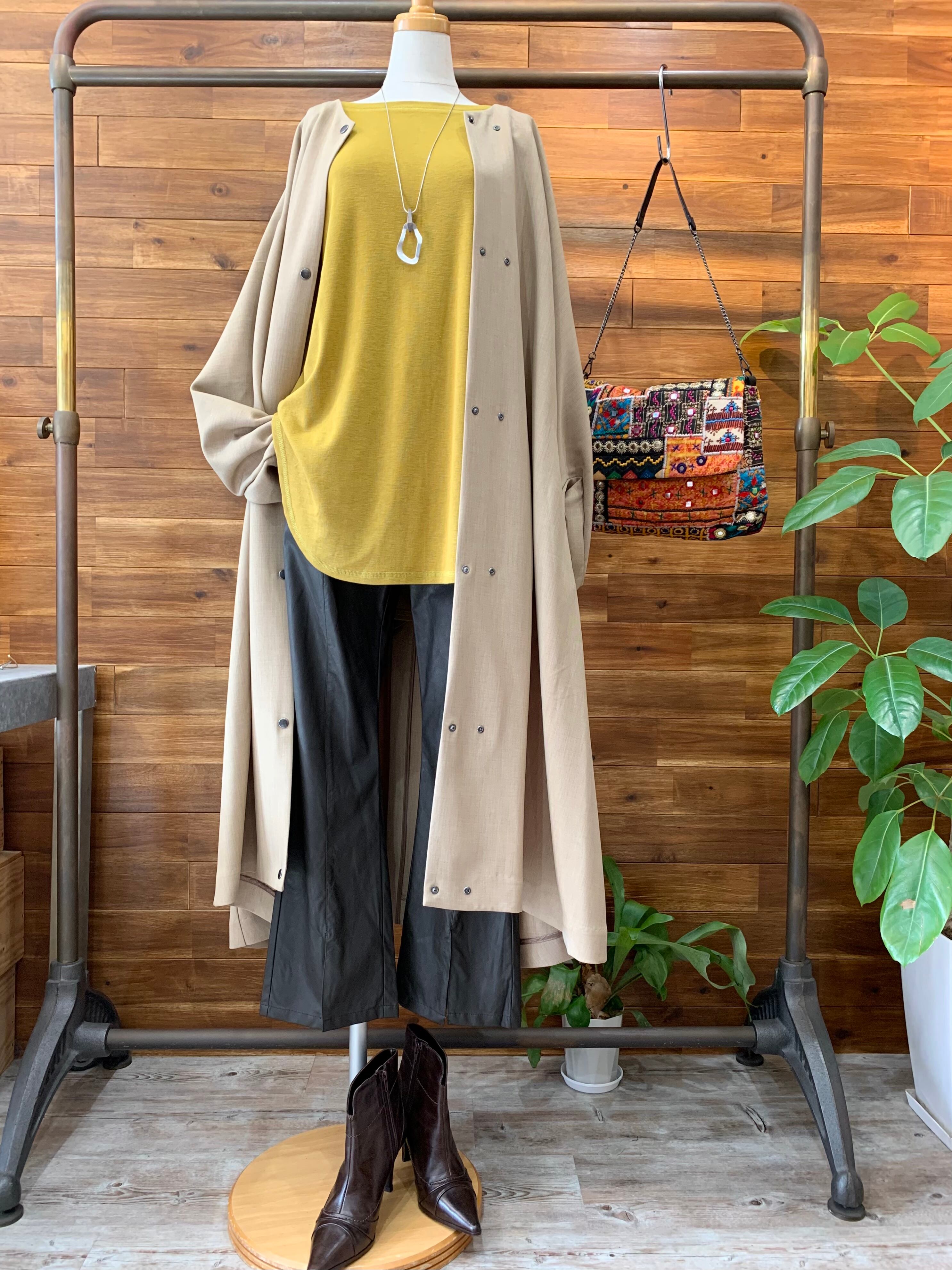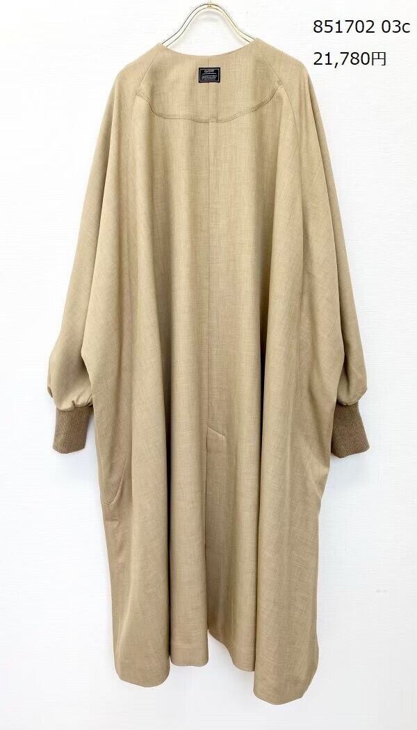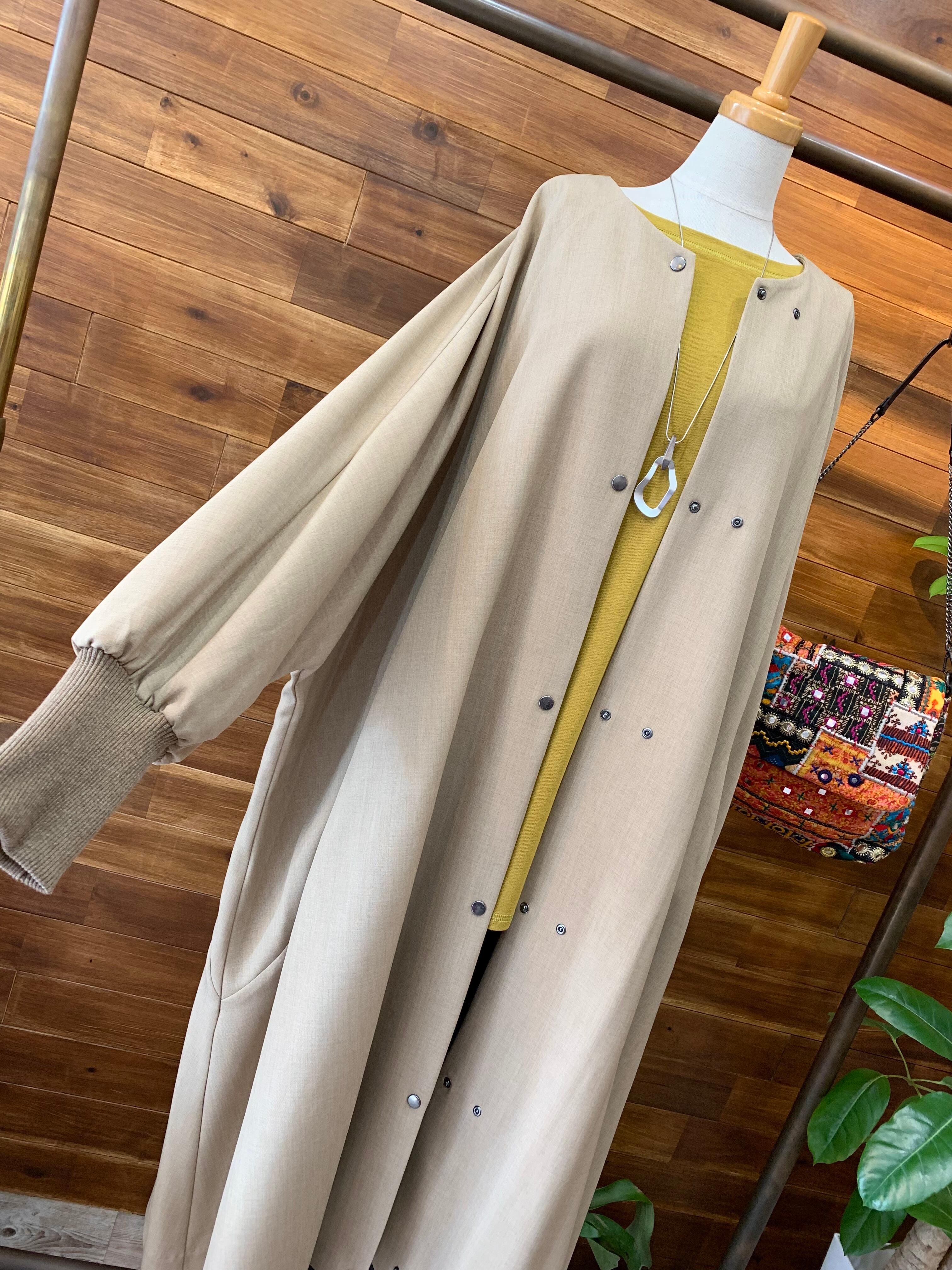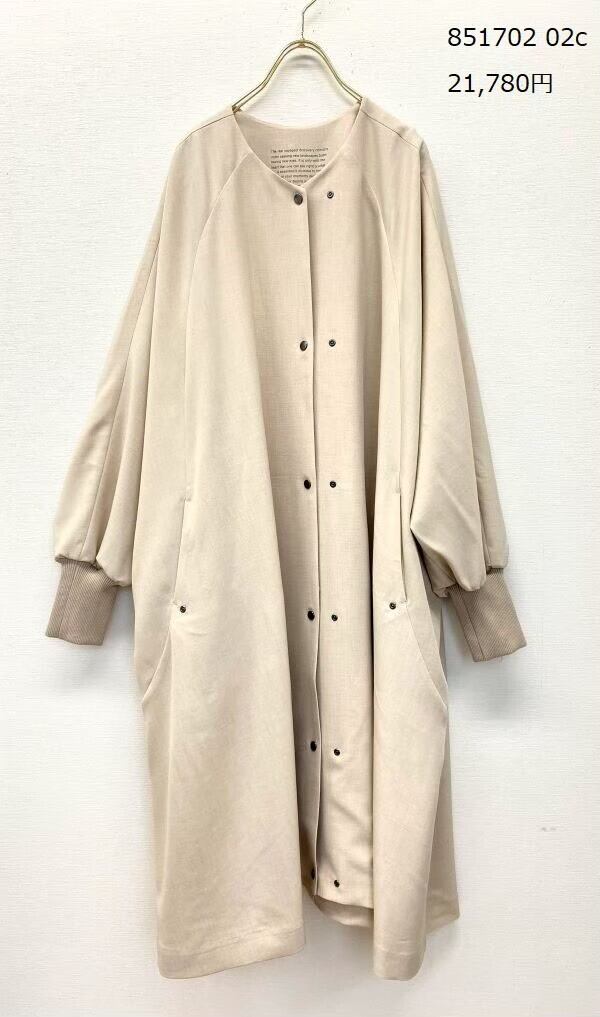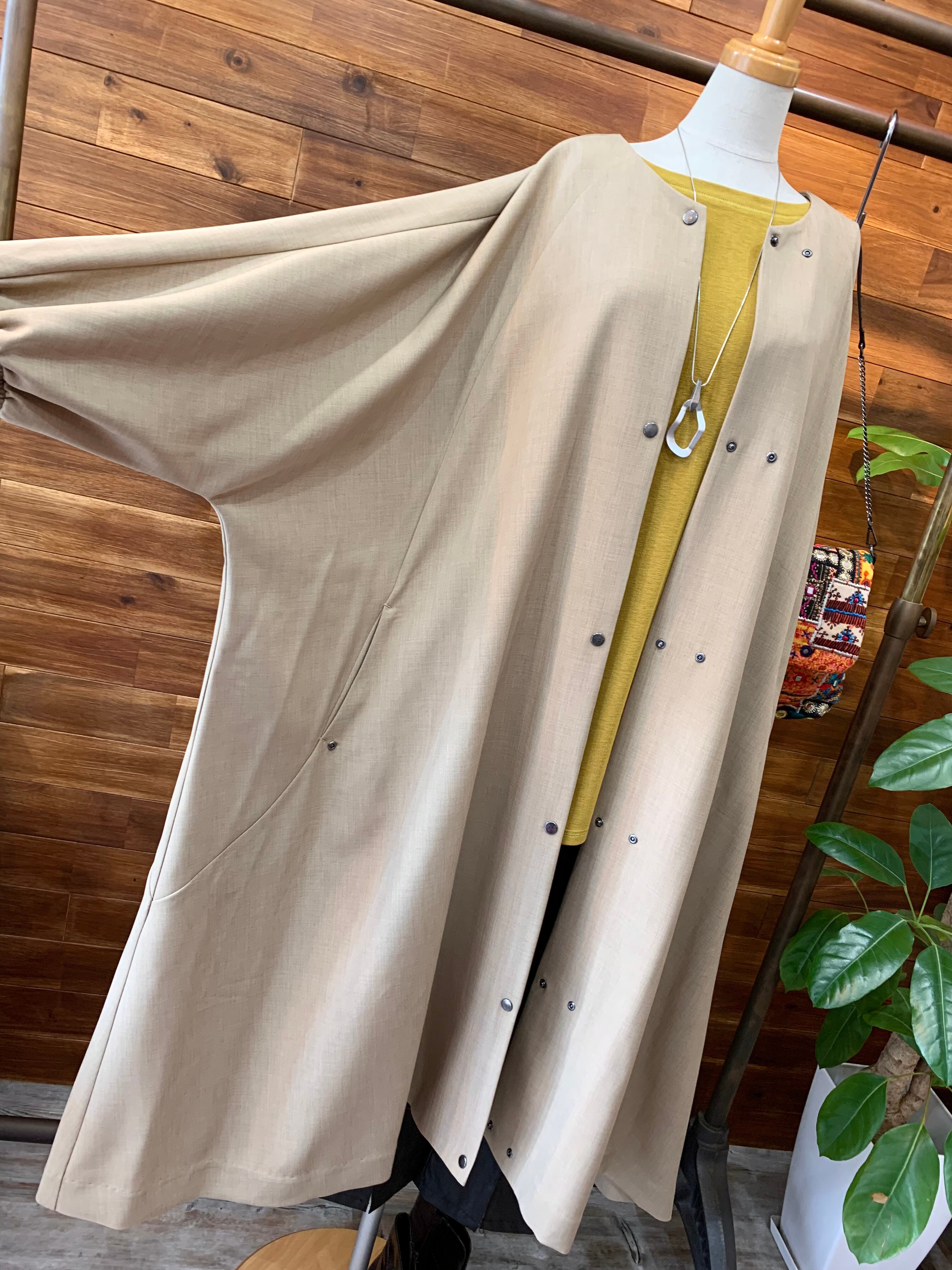 シンプルなノーカラーデザインにたっぷりとしたシルエット、しっかり長めのレングスで、インに着る物を選ばずカッコよく決まる、イチオシのライトコートです♪