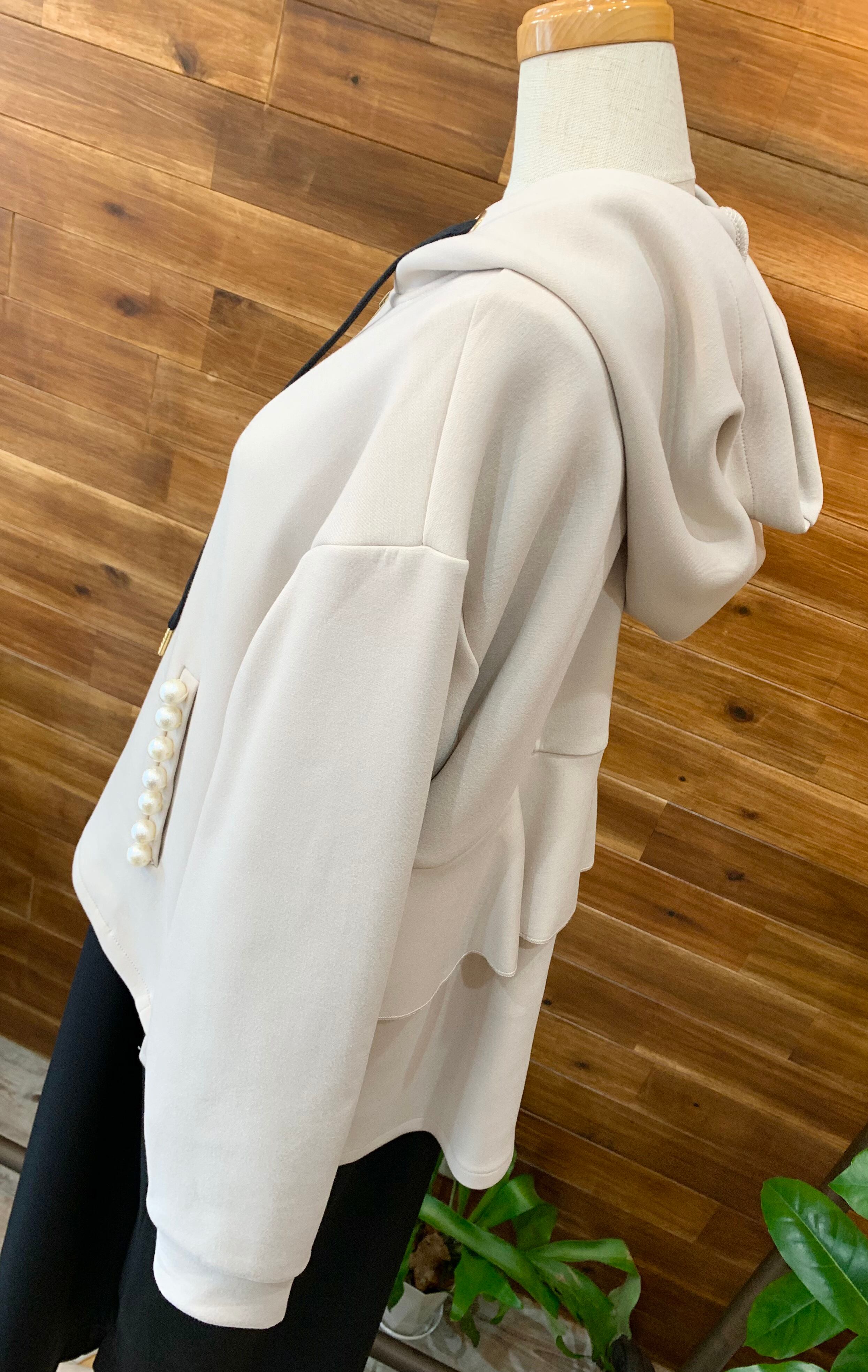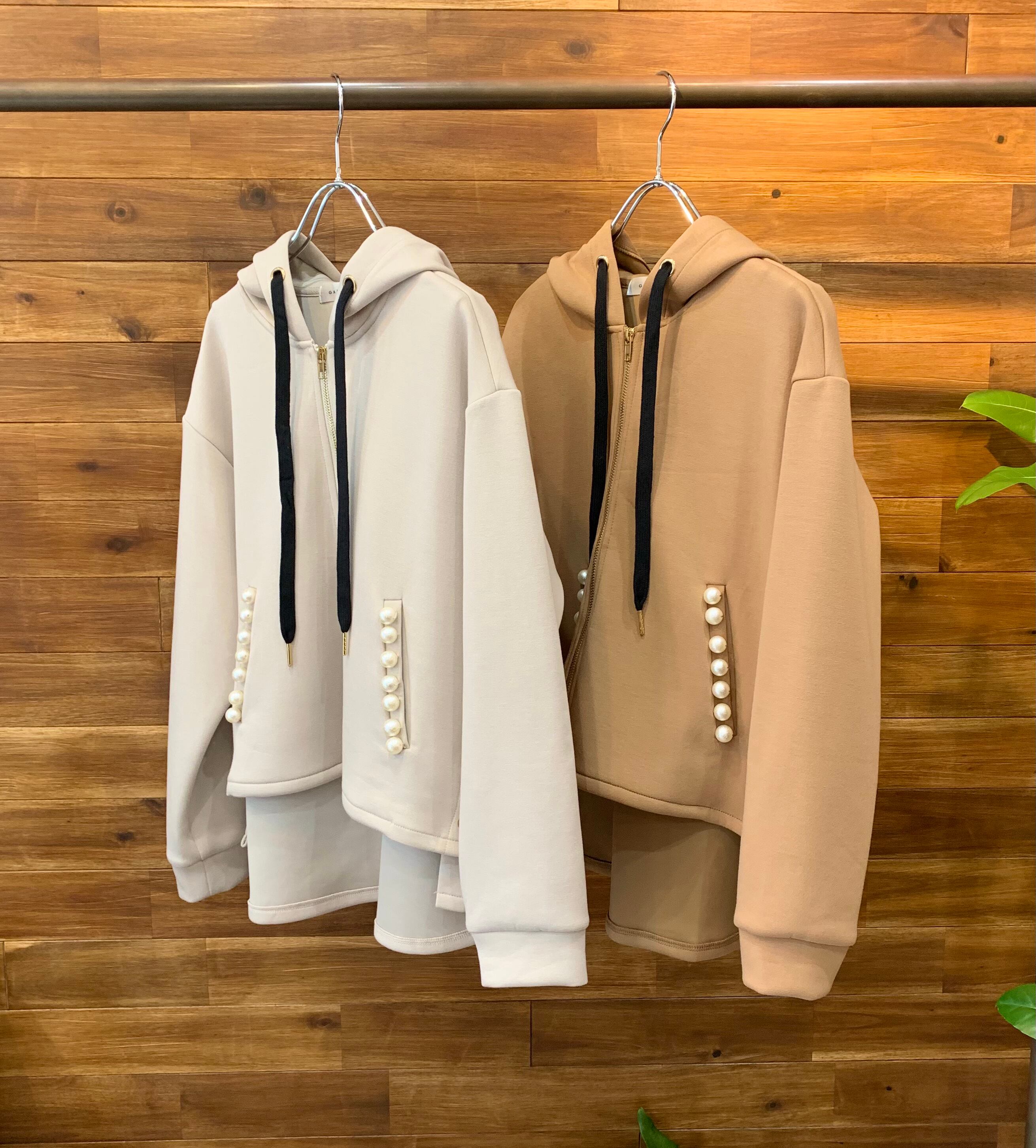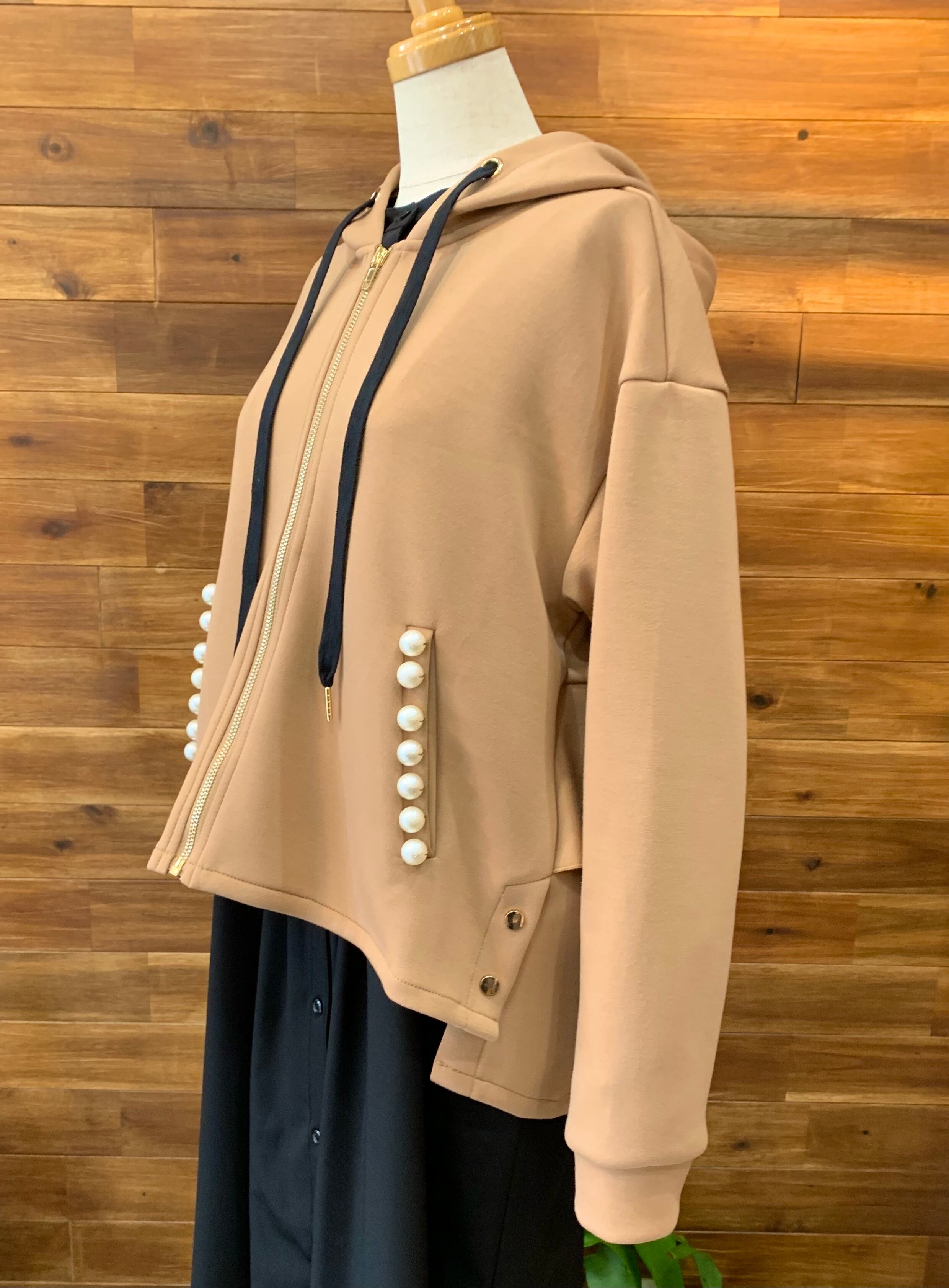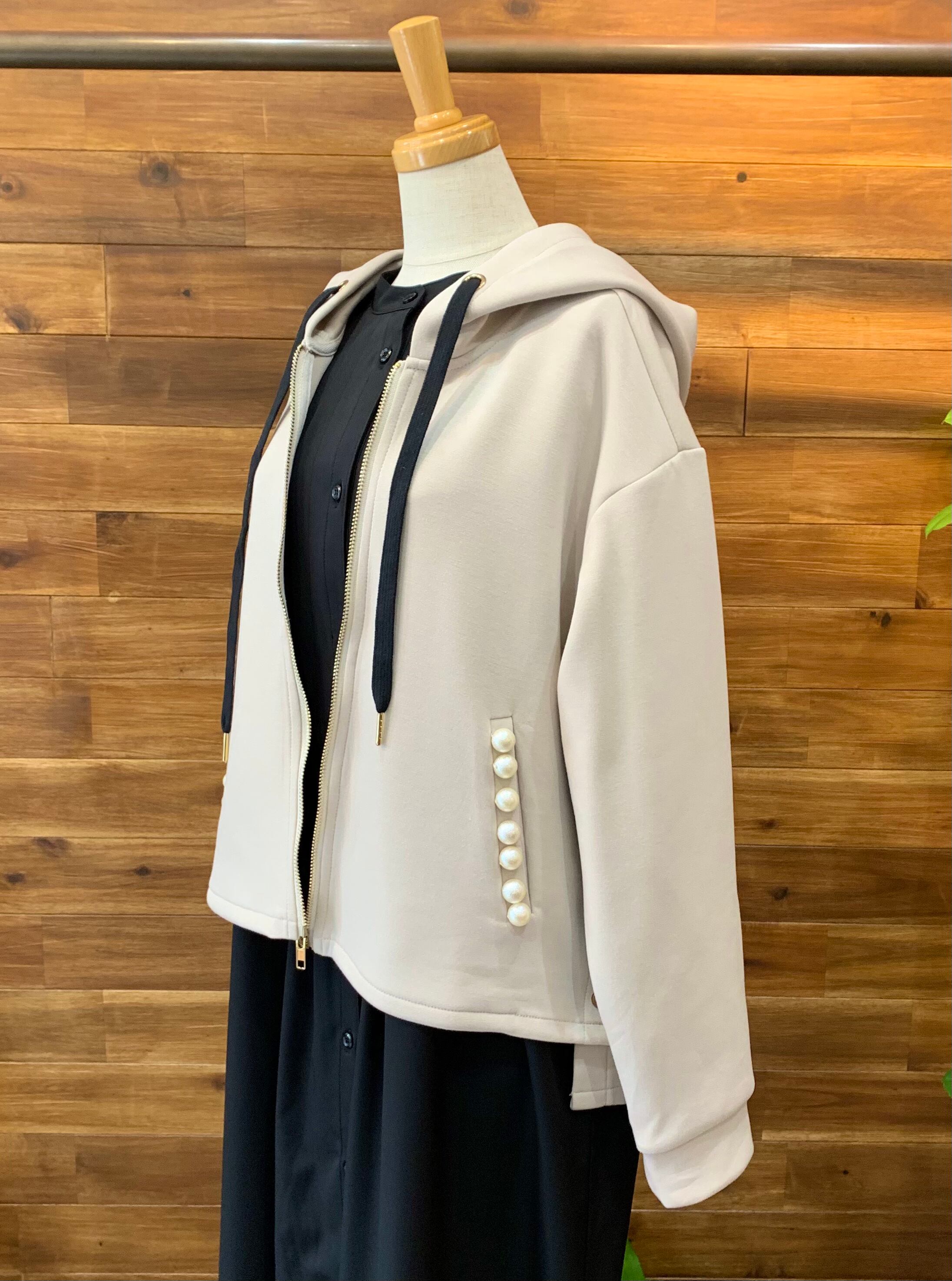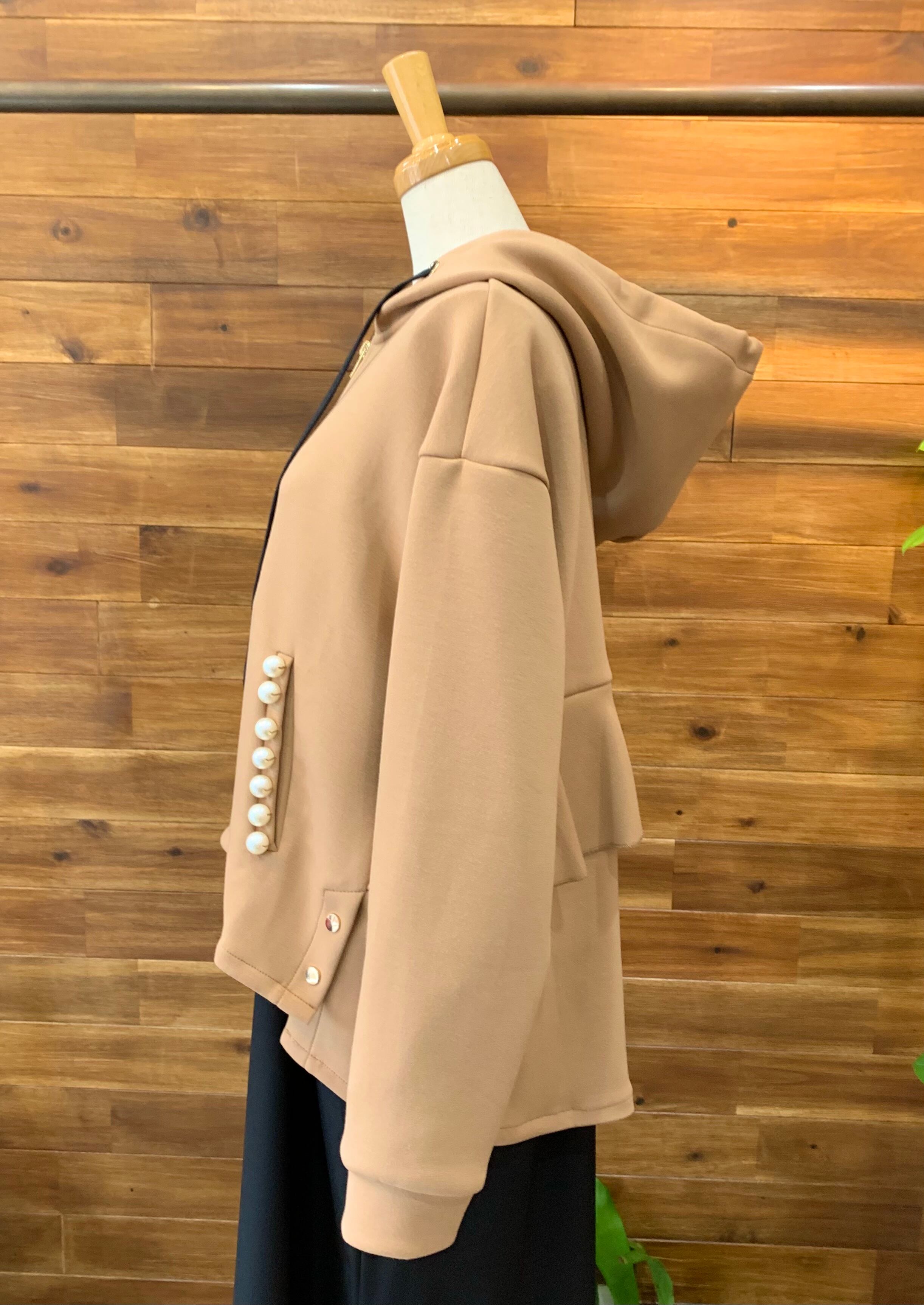 フードにブラックの紐、ゴールドのジッパー、サイドにゴールドのスナップボタン。