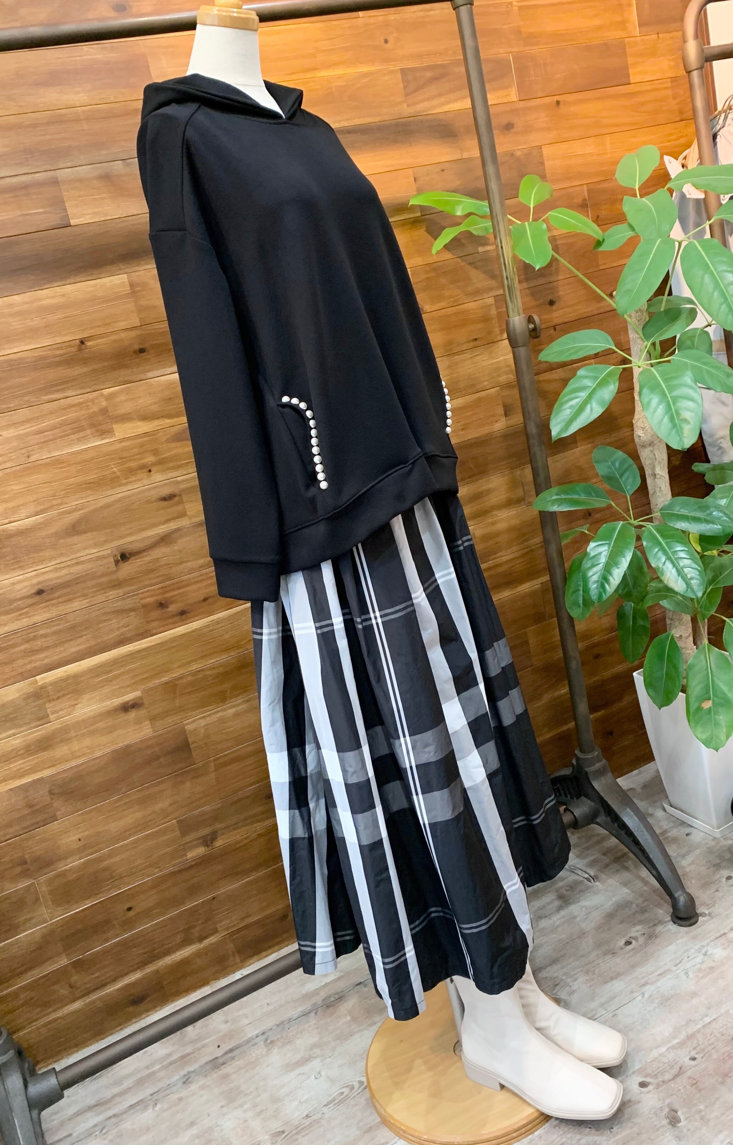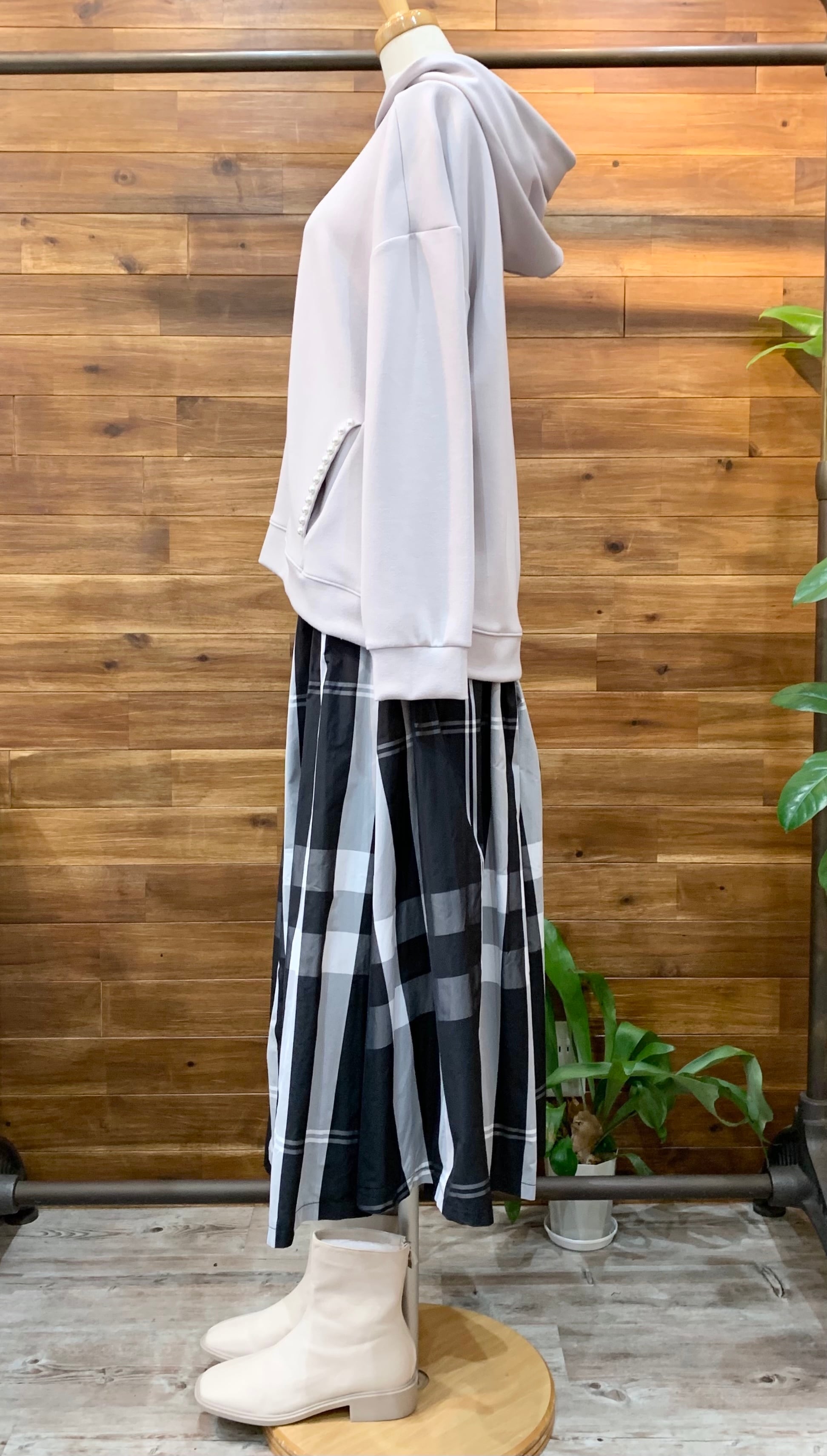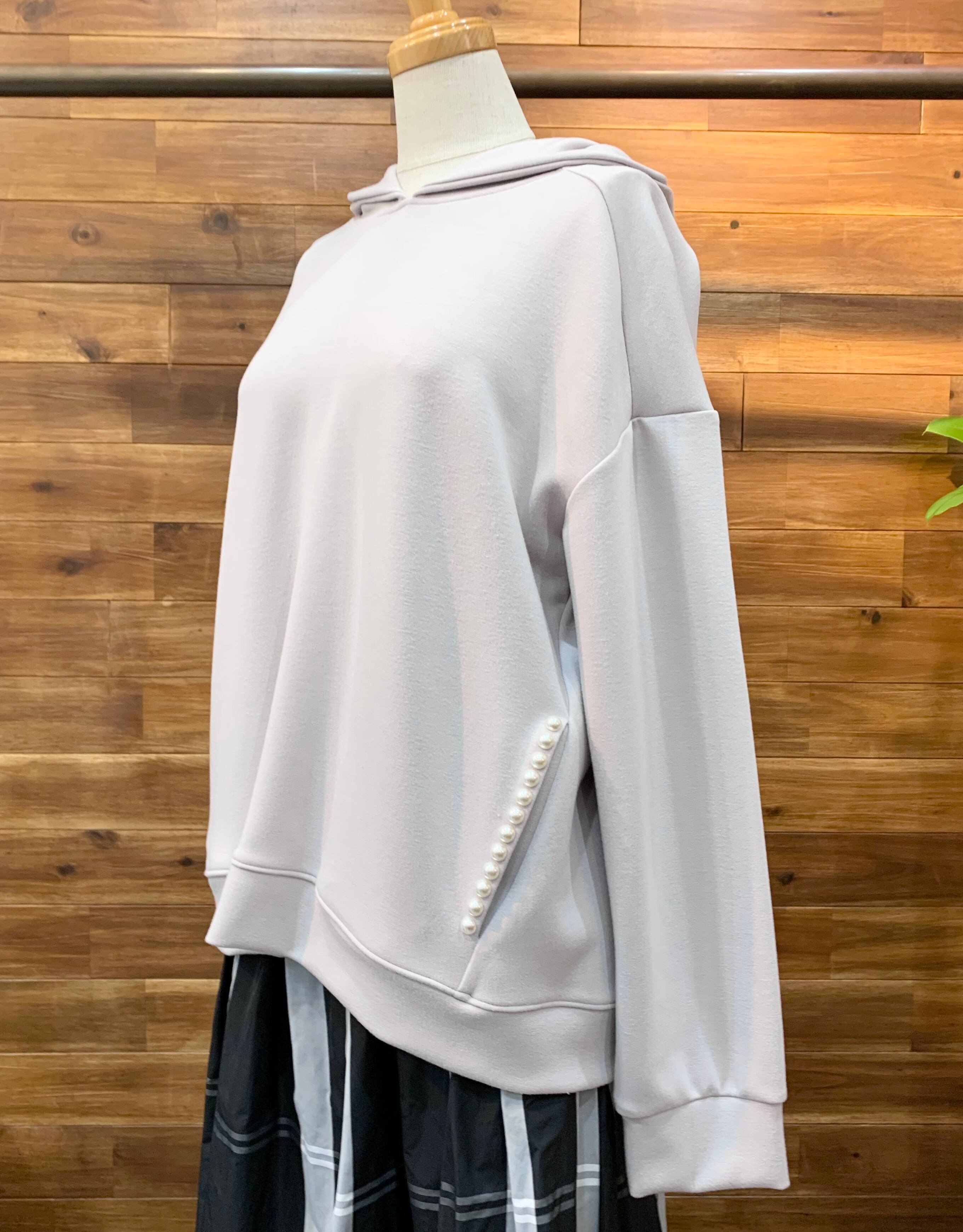 前サイドに斜めに入った切り替えにポケットがあり、パール飾りがなんとも可愛いパーカーです♪