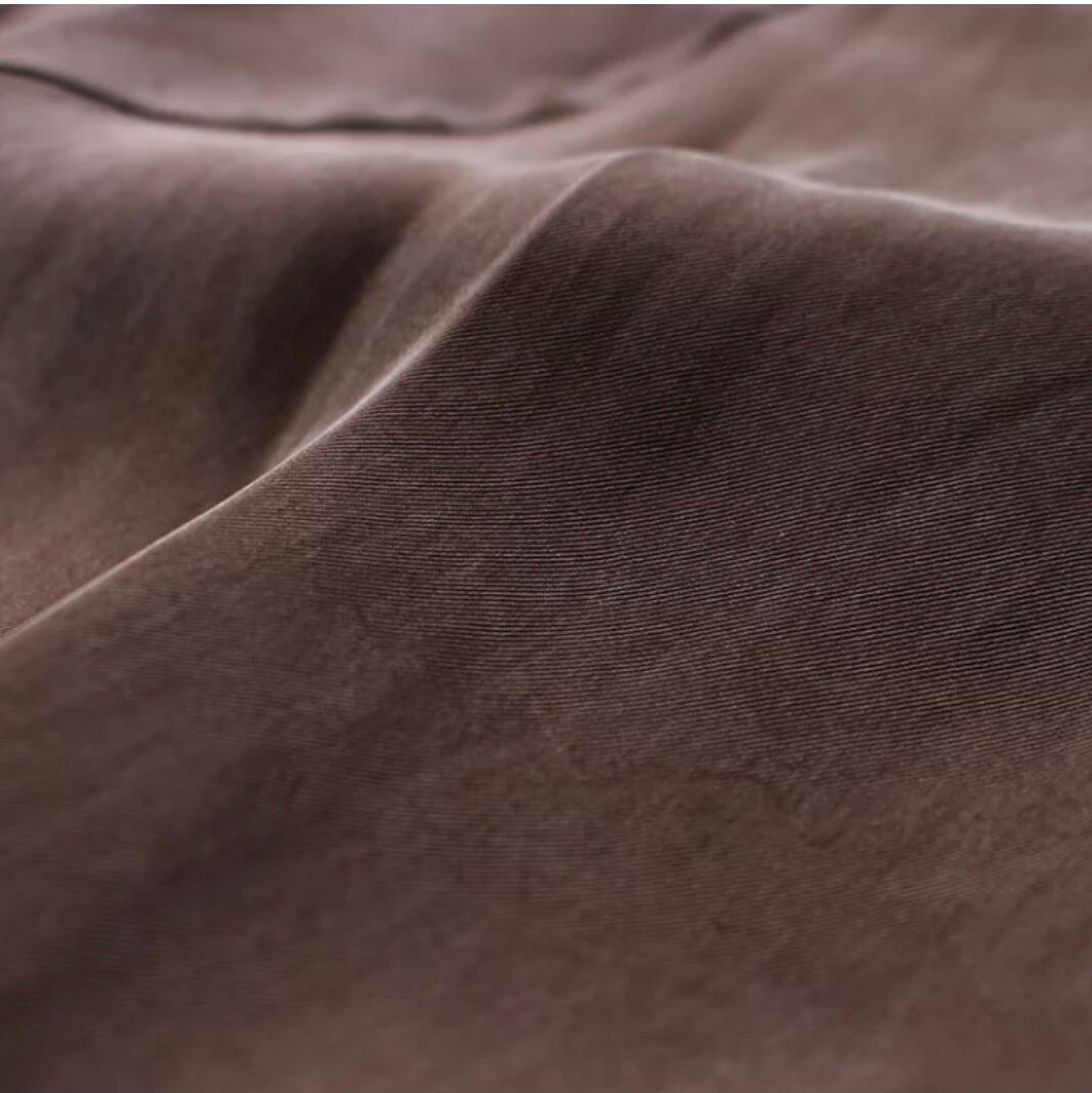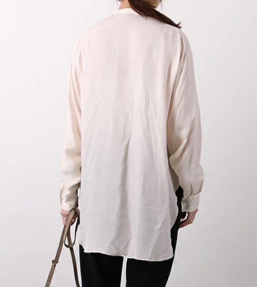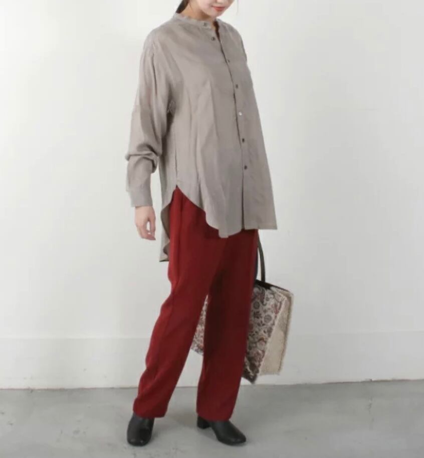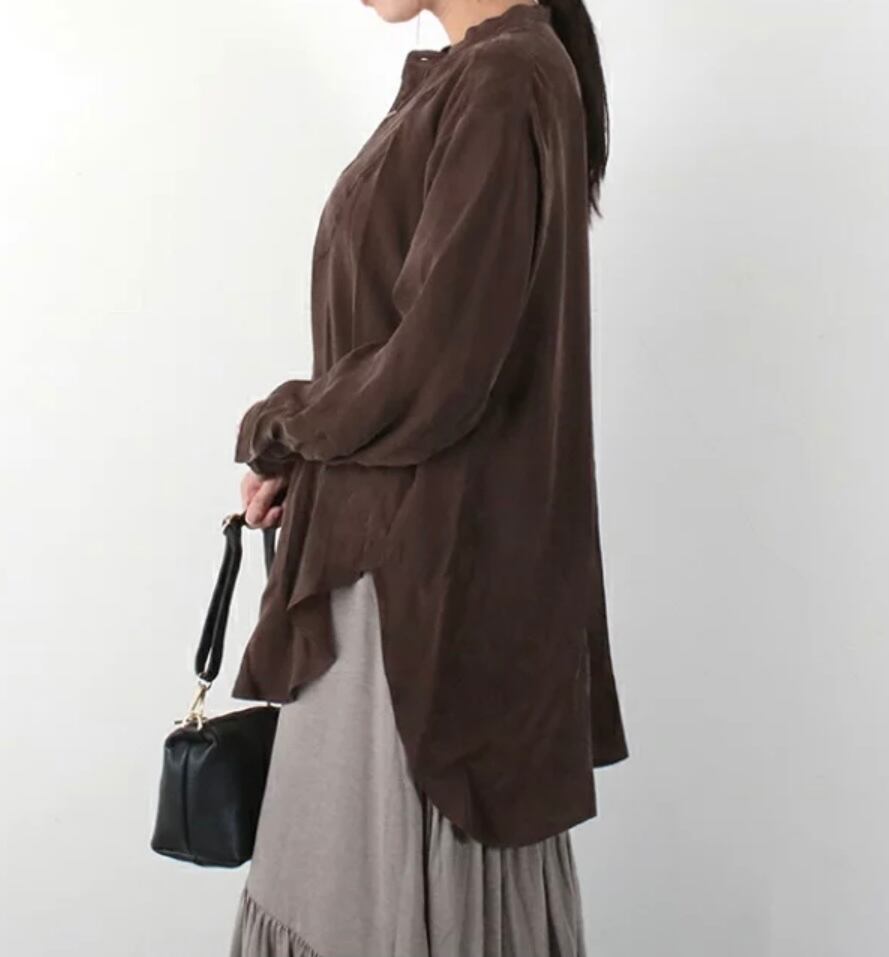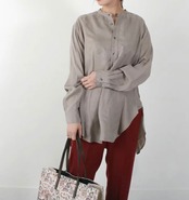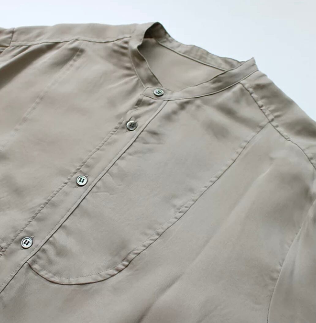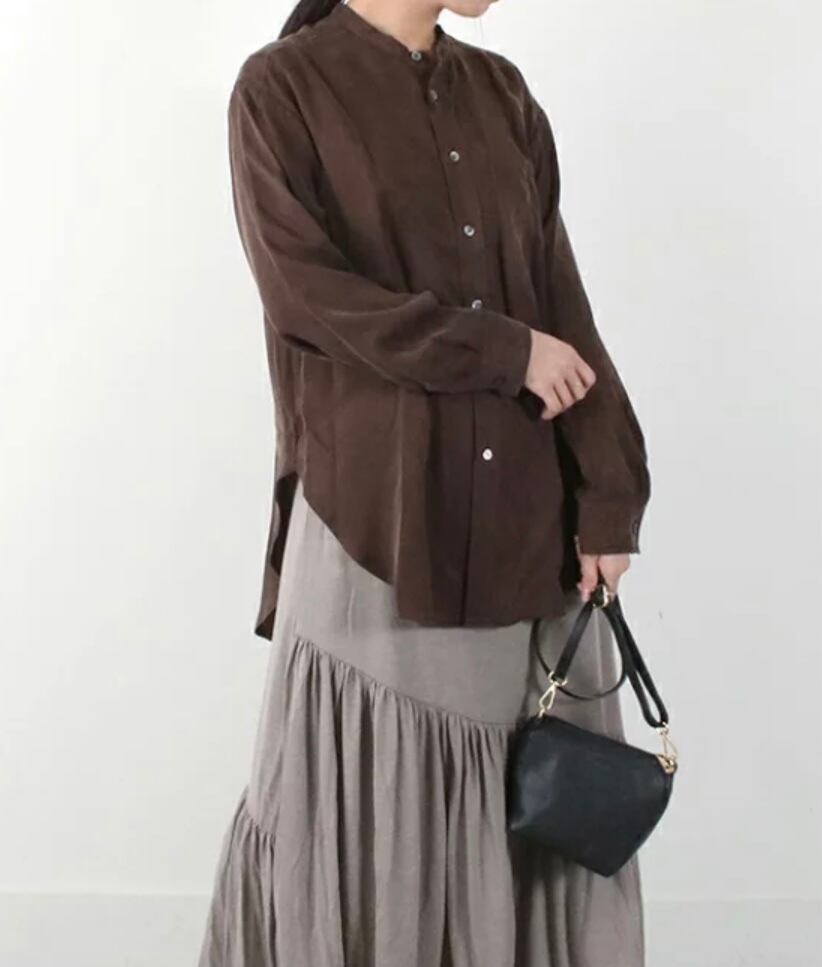 サスティナブルの典型、キュプラ100%使用したブラウスは、光沢のあるキュプラを微起毛させて、鈍く独特のくすみ感を出しています。