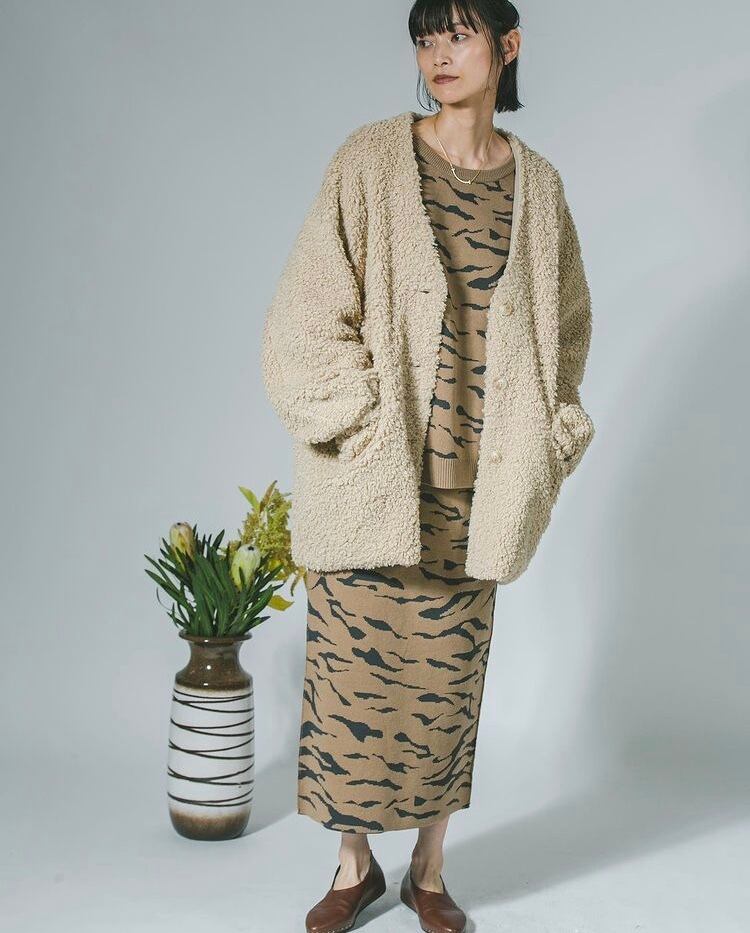 オーバーサイズのゆったりシルエットですが、ノーカラーのVネックの襟元ですっきりとした印象に。