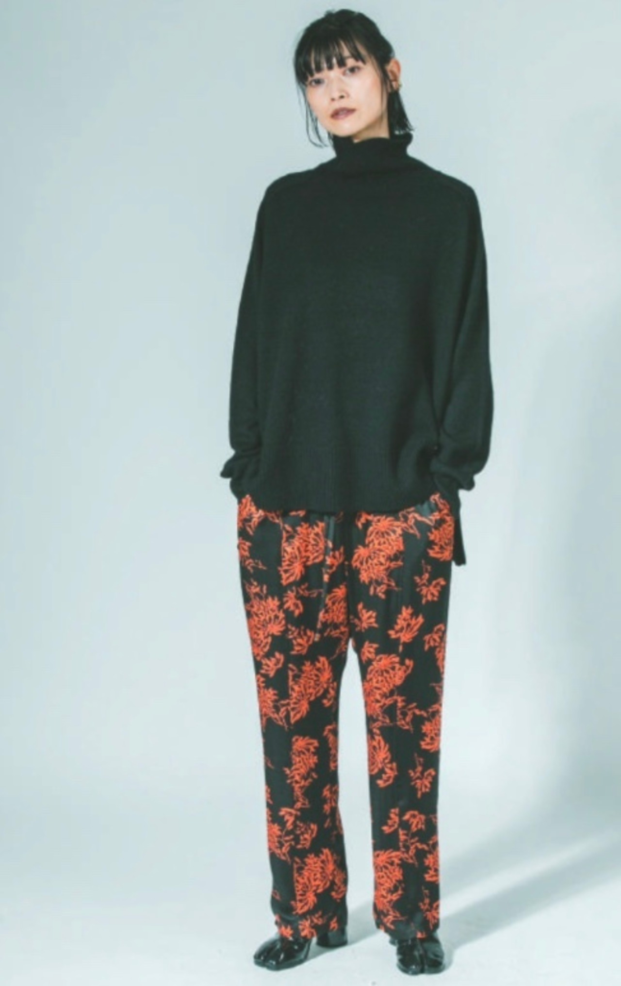少し光沢感のあるブラックに朱赤のフラワープリントが、モードな雰囲気でカッコイイです◎