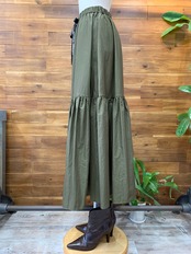光沢感とハリ感のある素材で、カジュアルな中に華やかな雰囲気のあるティアードスカート♪
