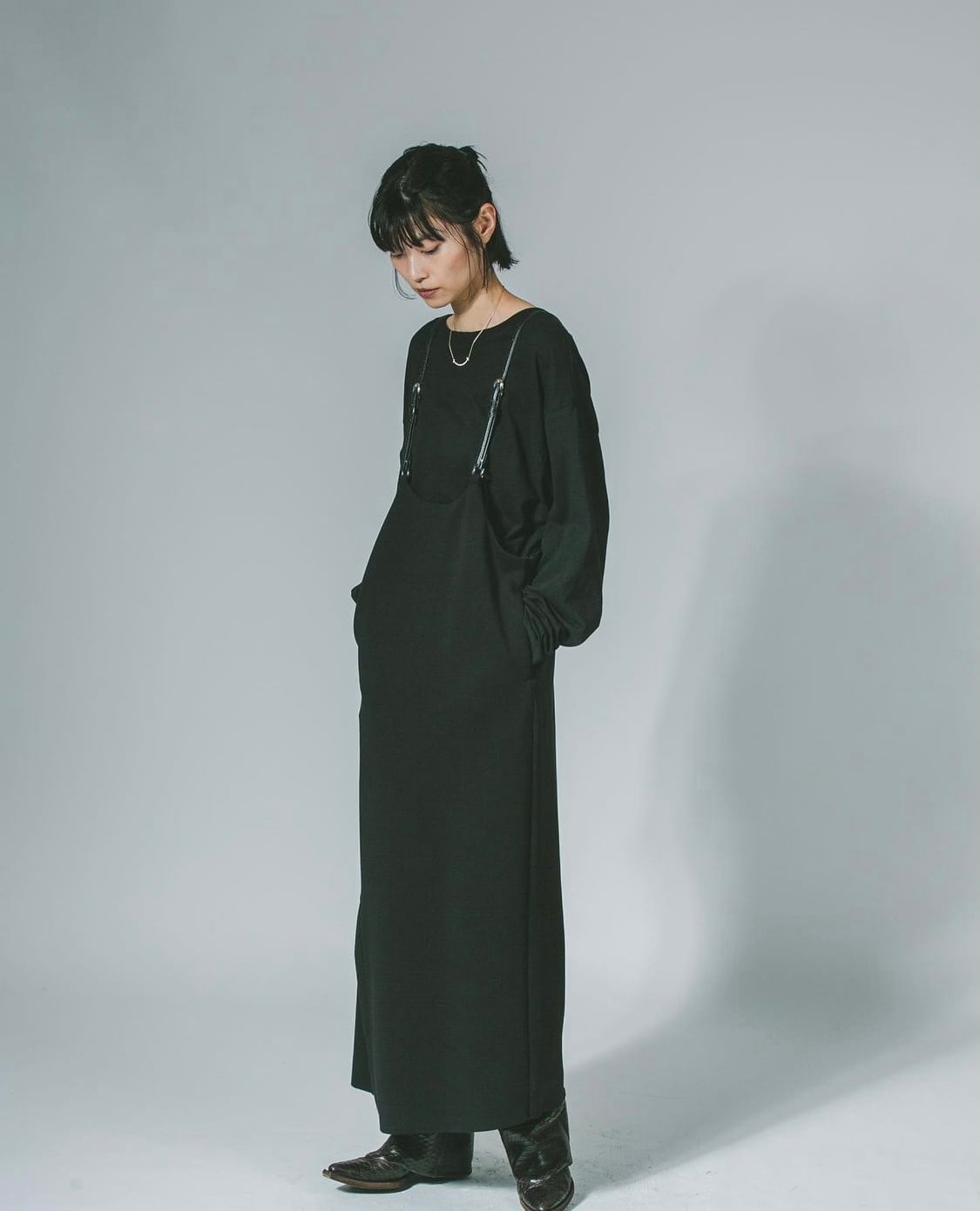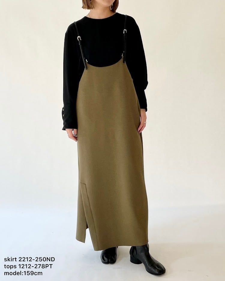 ストレートなシルエットに、右サイドにアシメトリーに入った深めのスリットで、スッキリとした印象のサスペンダー付きスカート♪