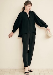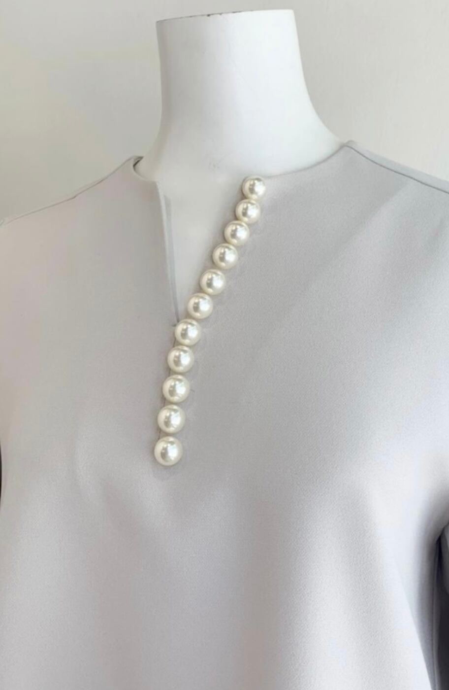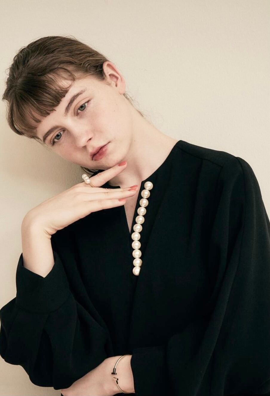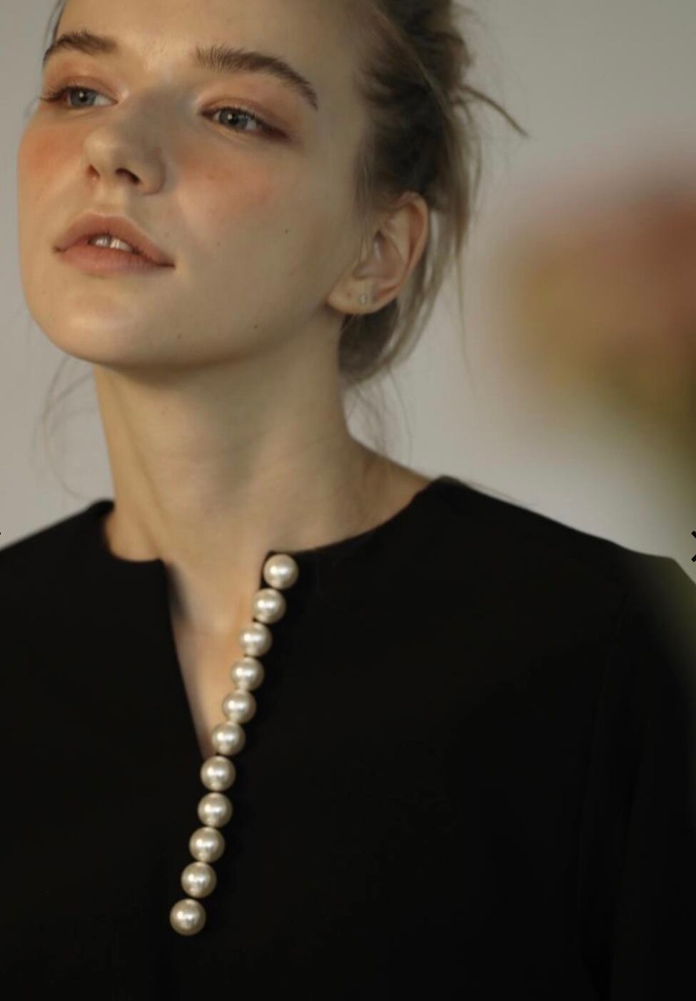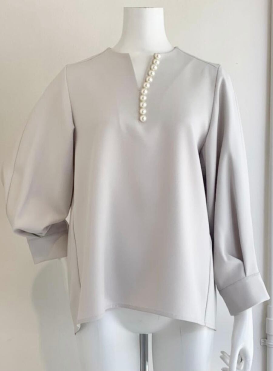 キーネックのサイドに並んだパールがアクセントの、アクセサリーいらずの華やかブラウス♪