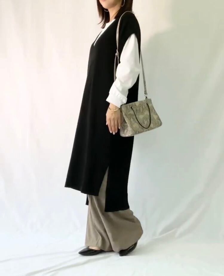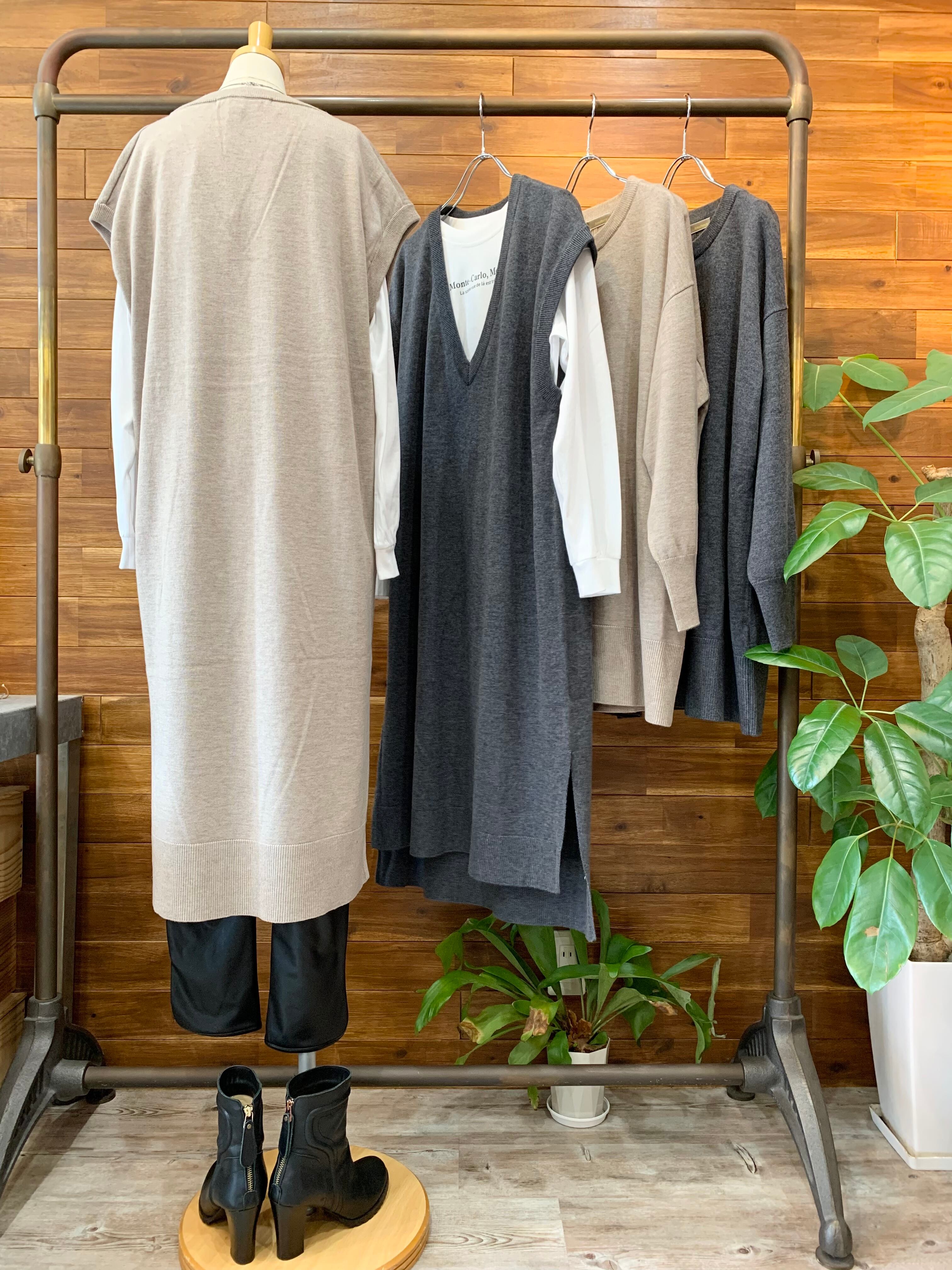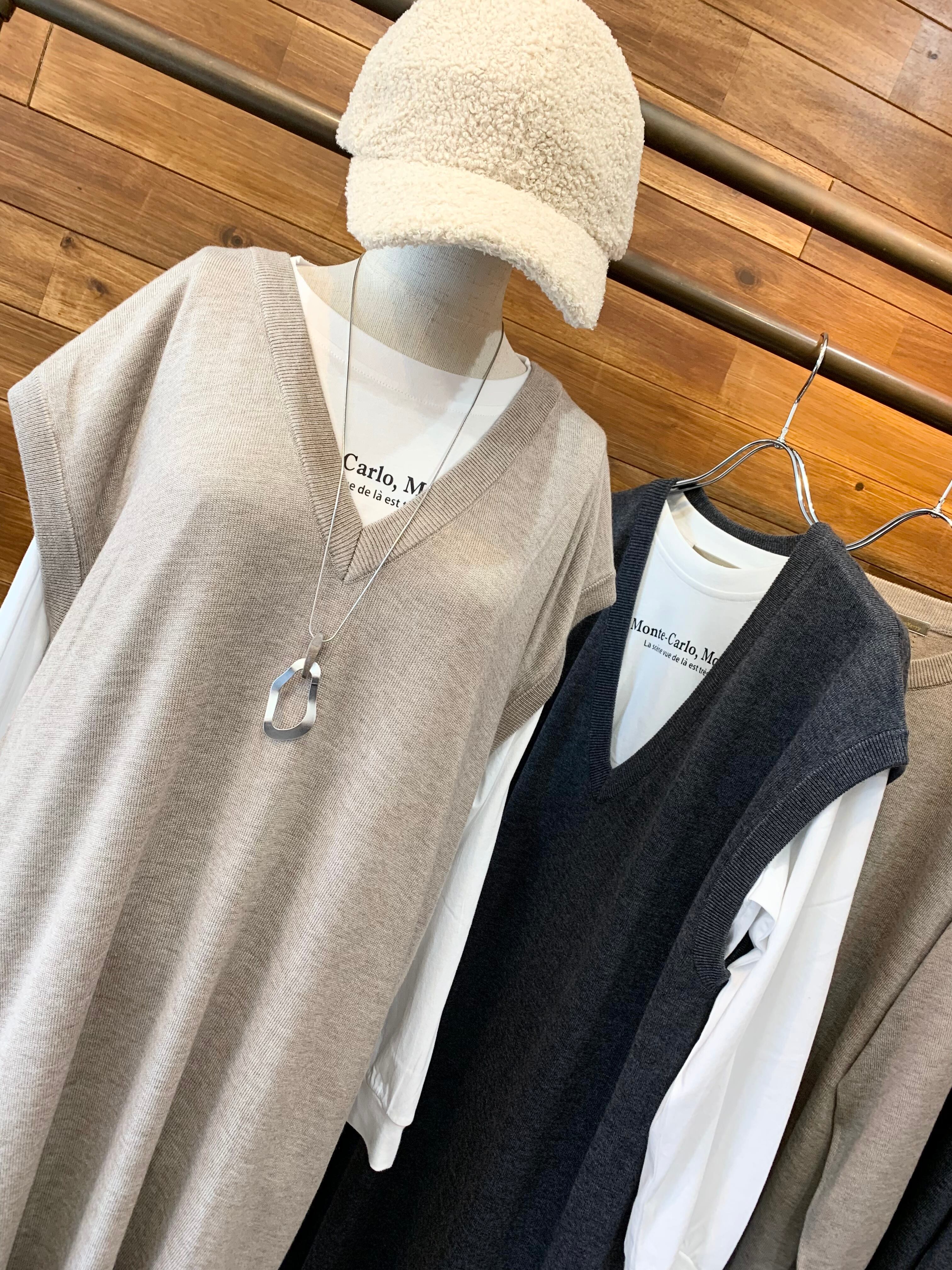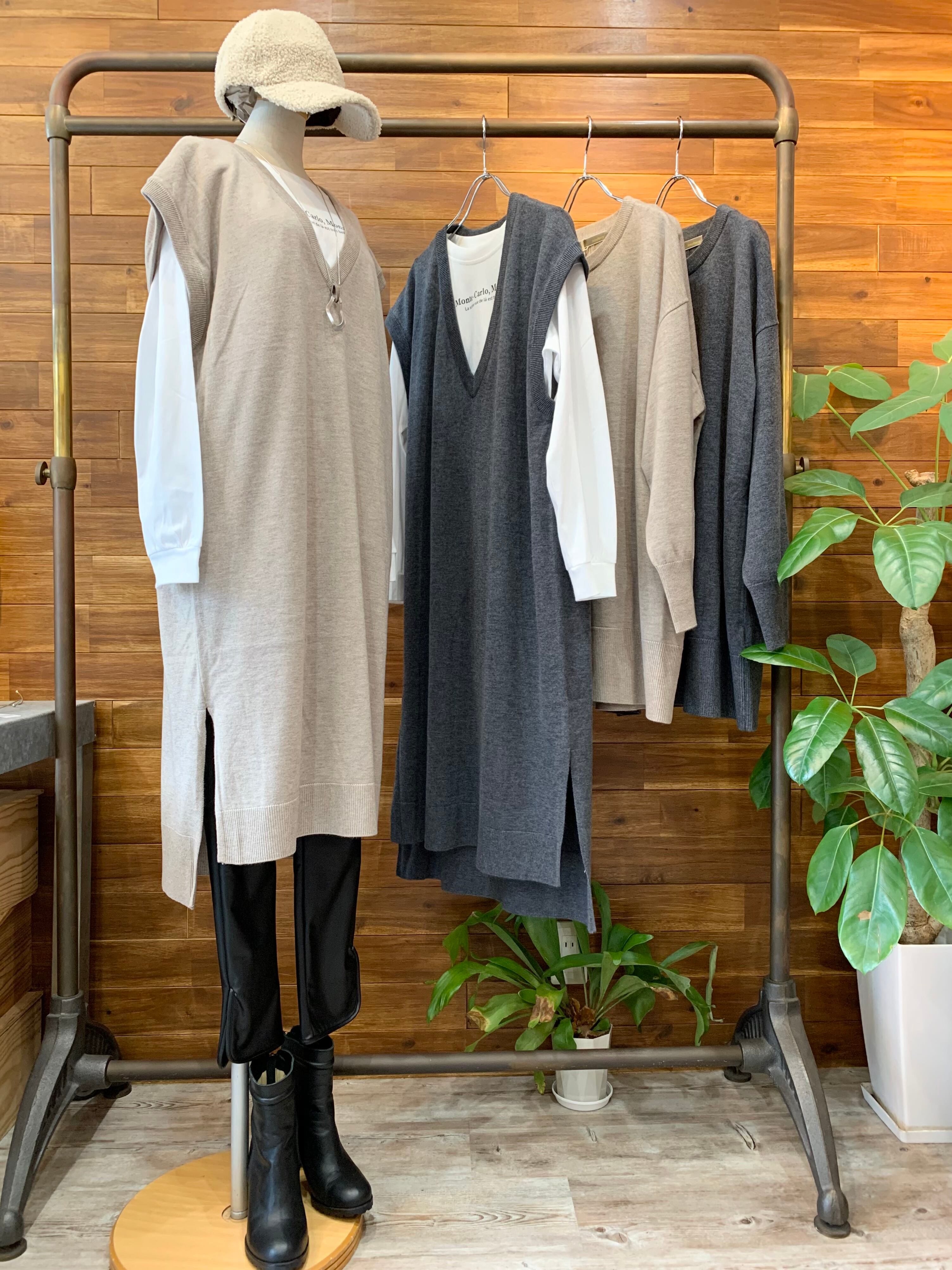 ニットベストは、シャツワンピースやトレンドのプリントパンツ、カジュアルにデニム合わせにもオススメです。