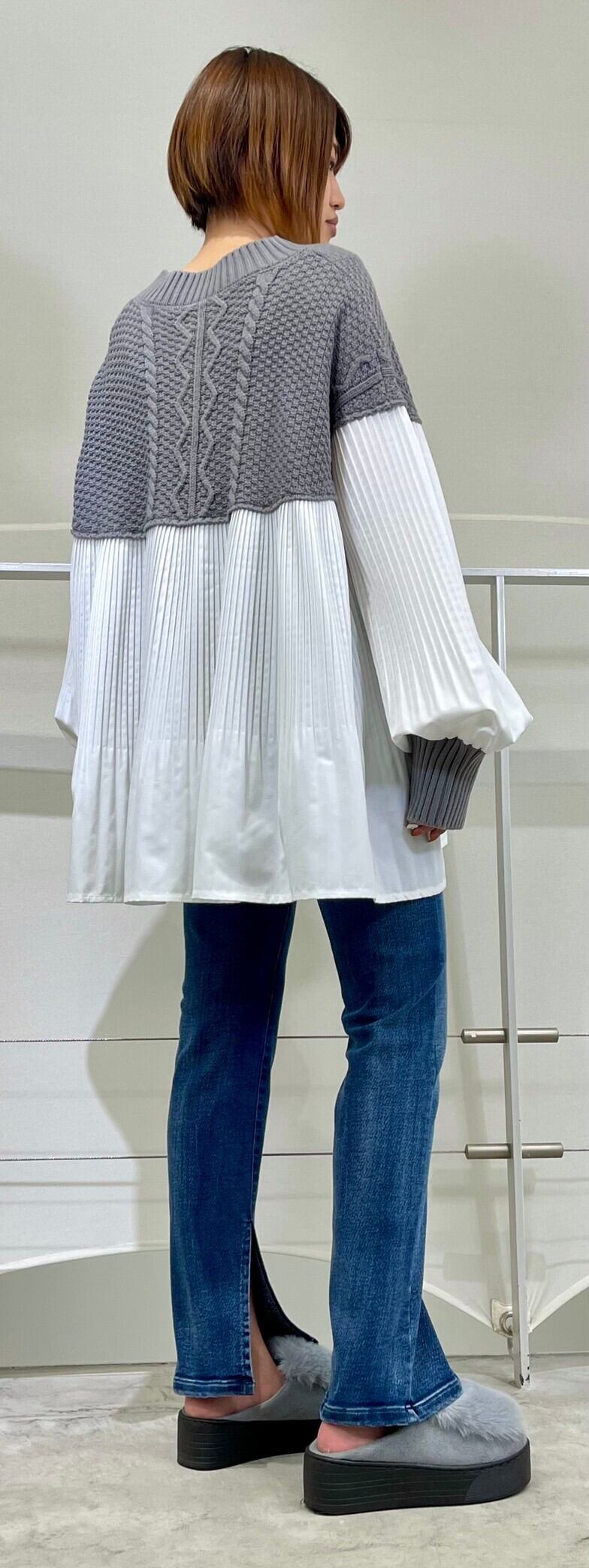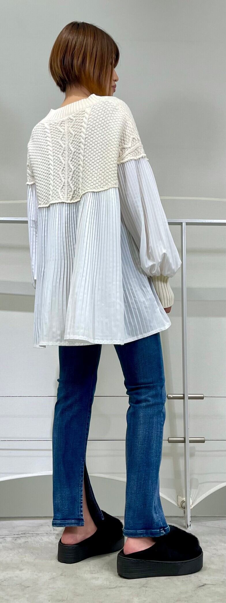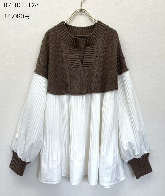 ニットとプリーツのドッキングデザインが、フェミニンでカジュアル、大人可愛い印象のブラウス♪