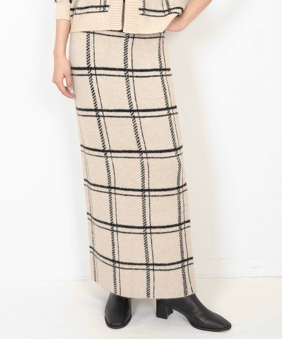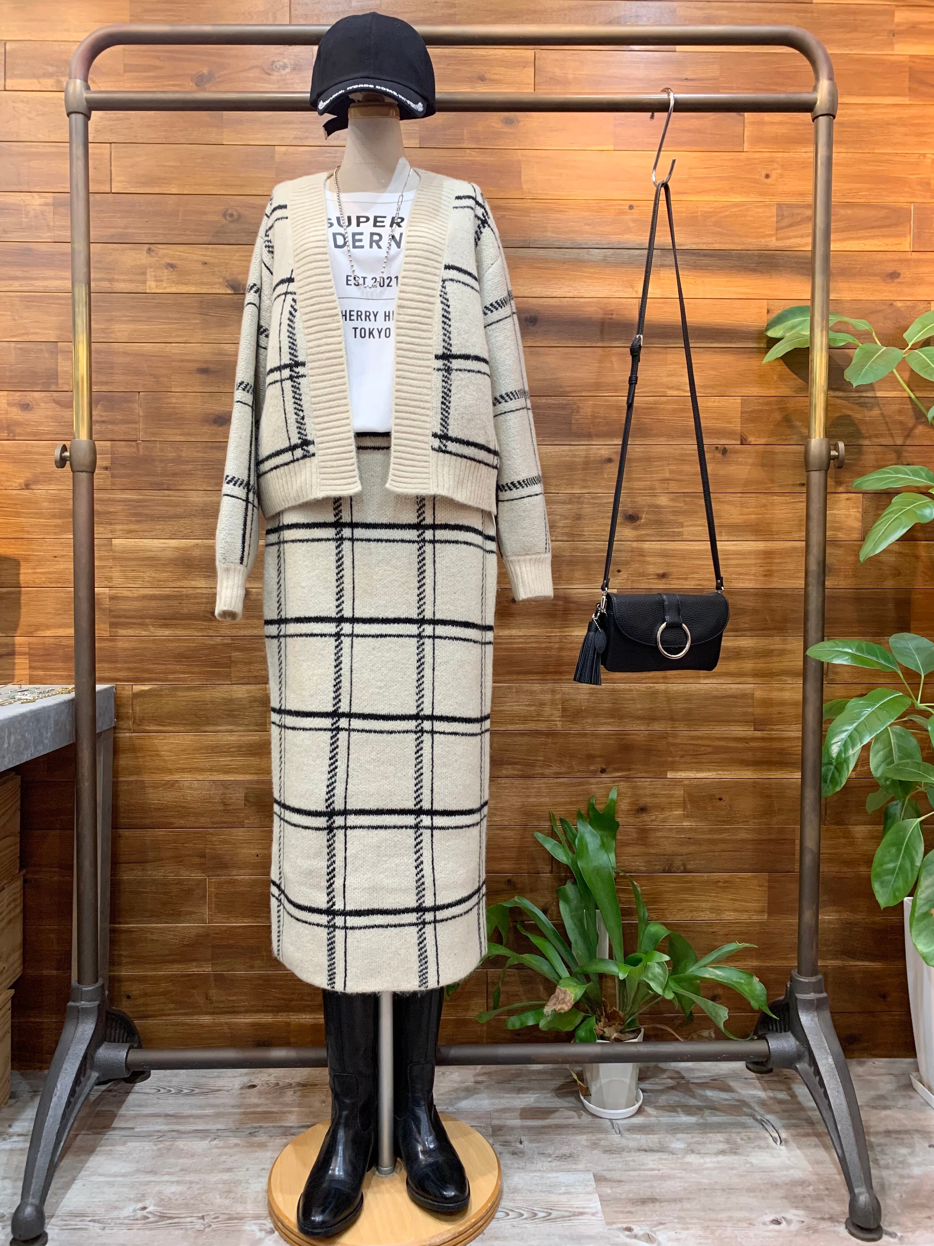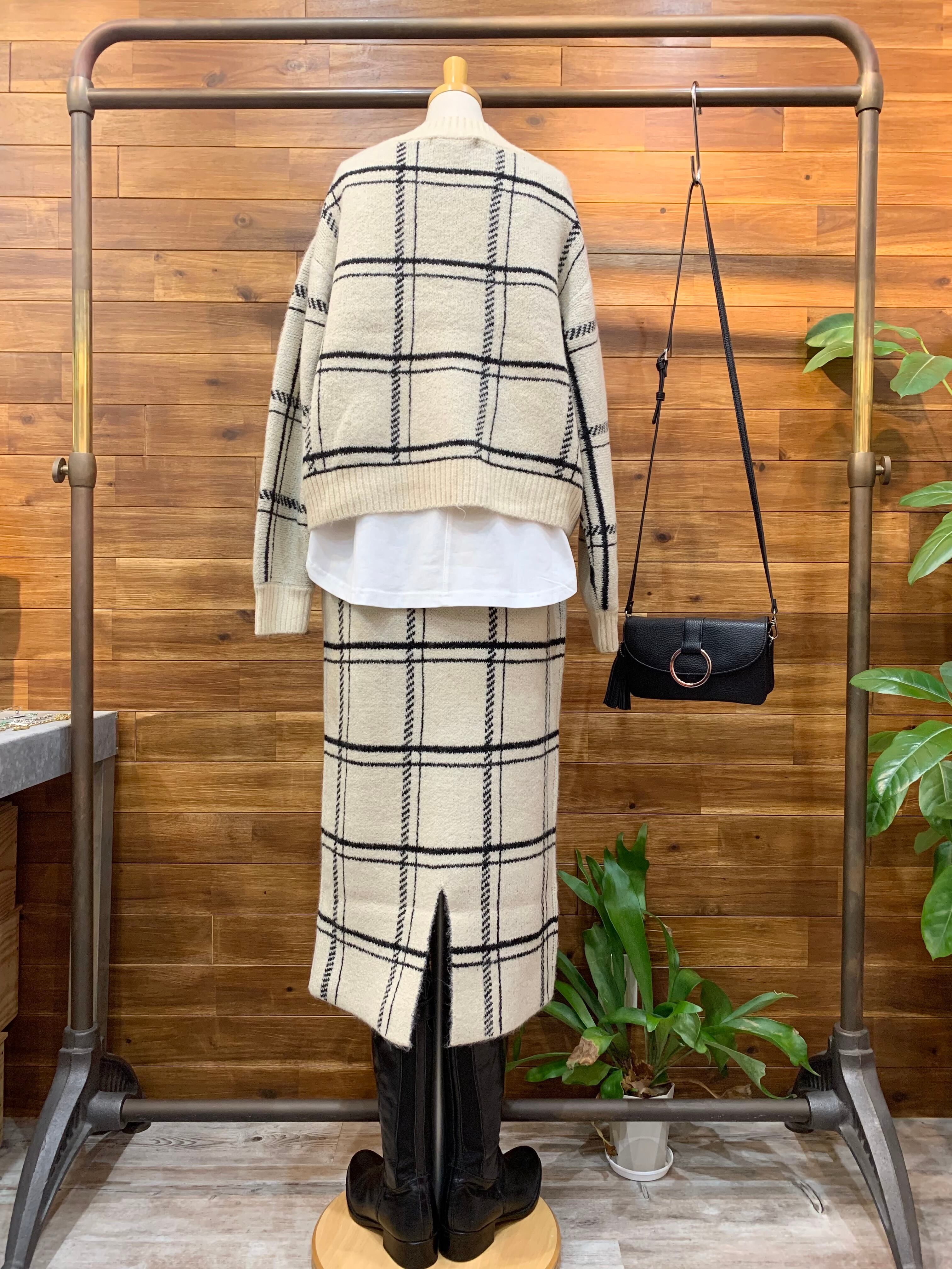 チェック柄のカーディガンとお揃いのニットタイトスカート。
