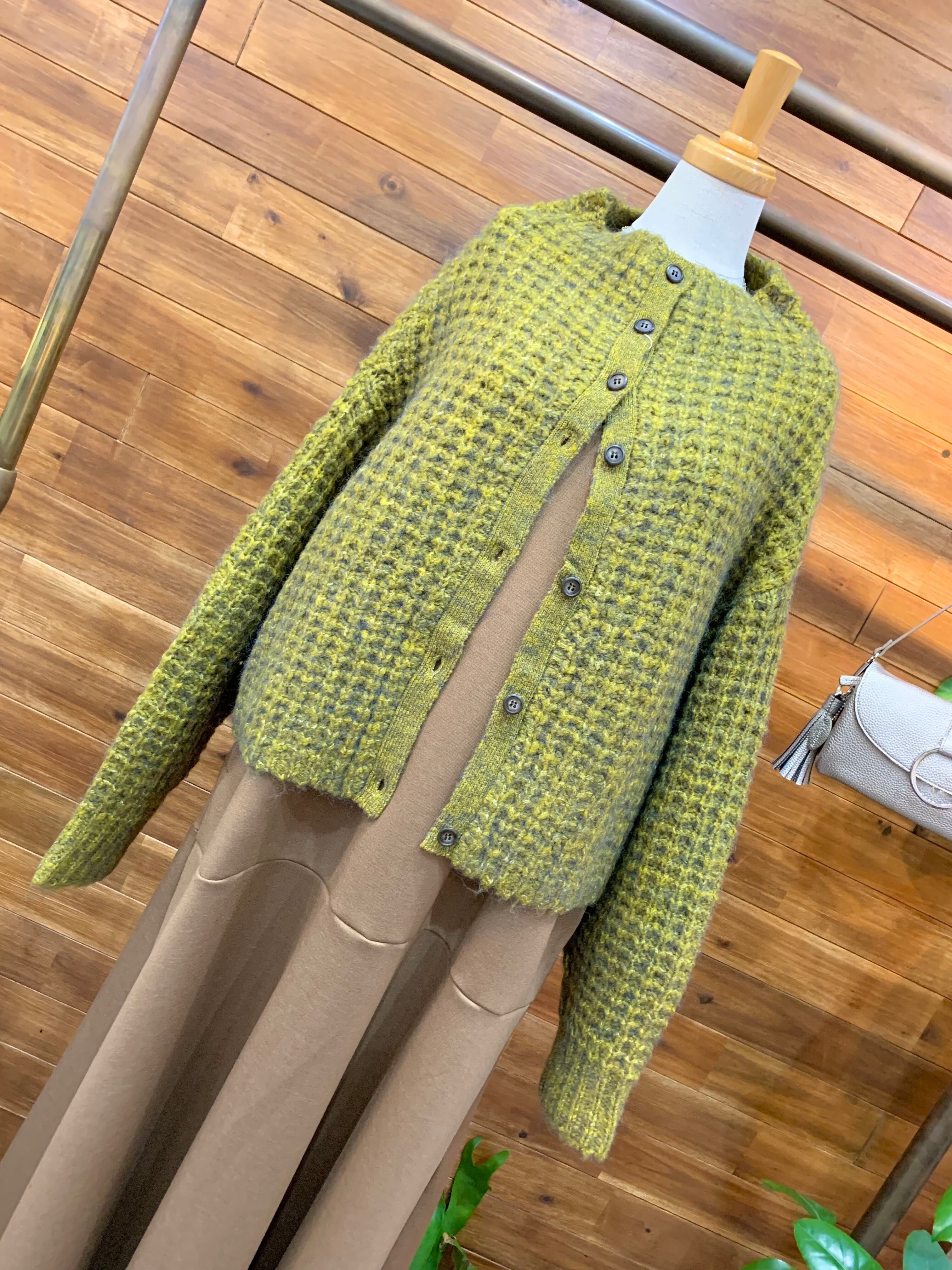 ウール混の膨らみと毛足感のある太糸を、針抜きのワッフルで編み上げています。