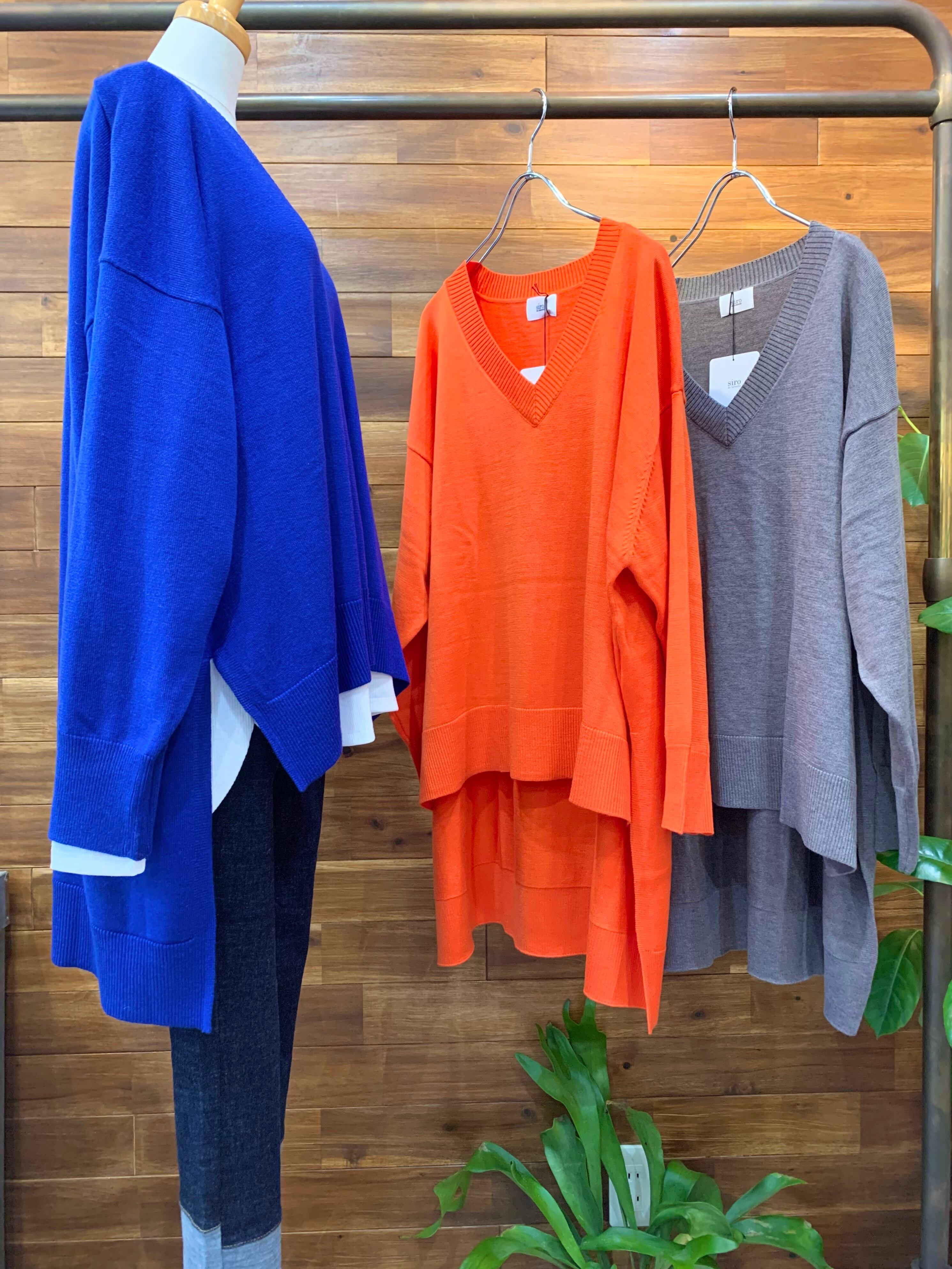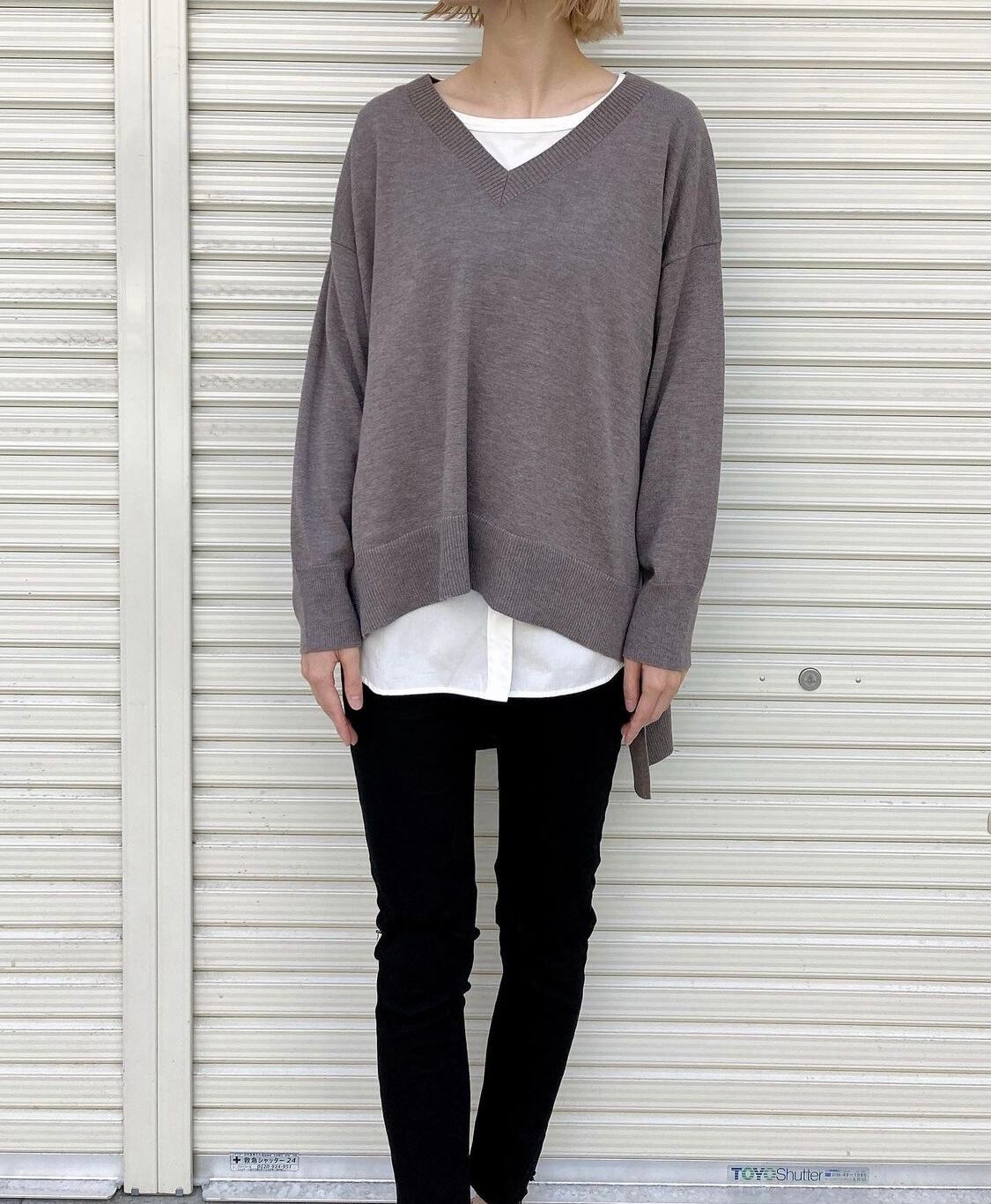 程良いVネックの開きと薄手の素材感で、スッキリとしつつも女性らしい雰囲気に。