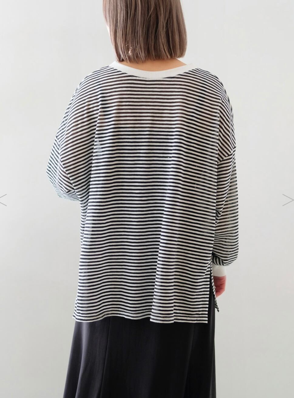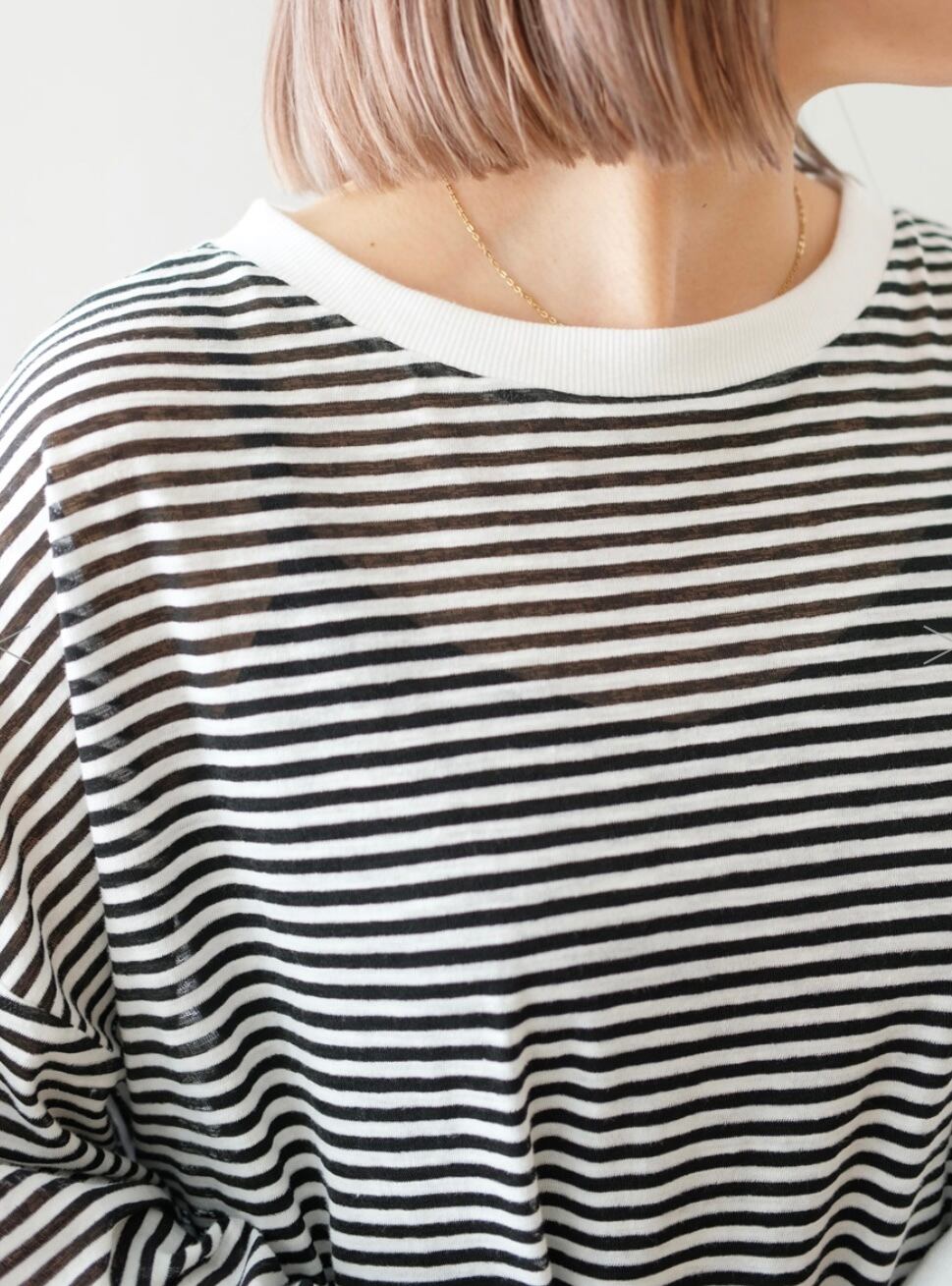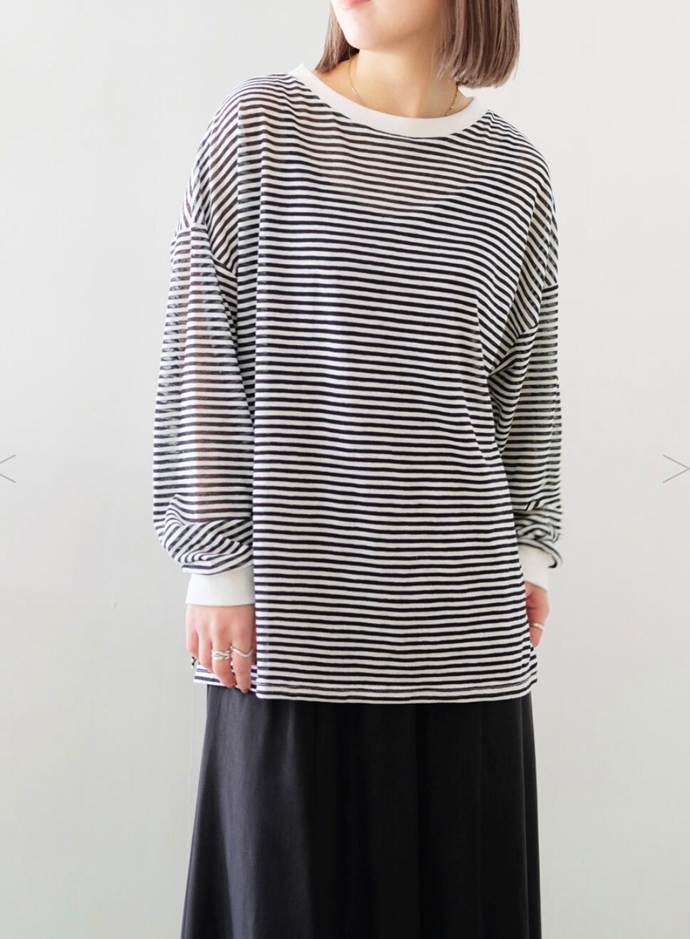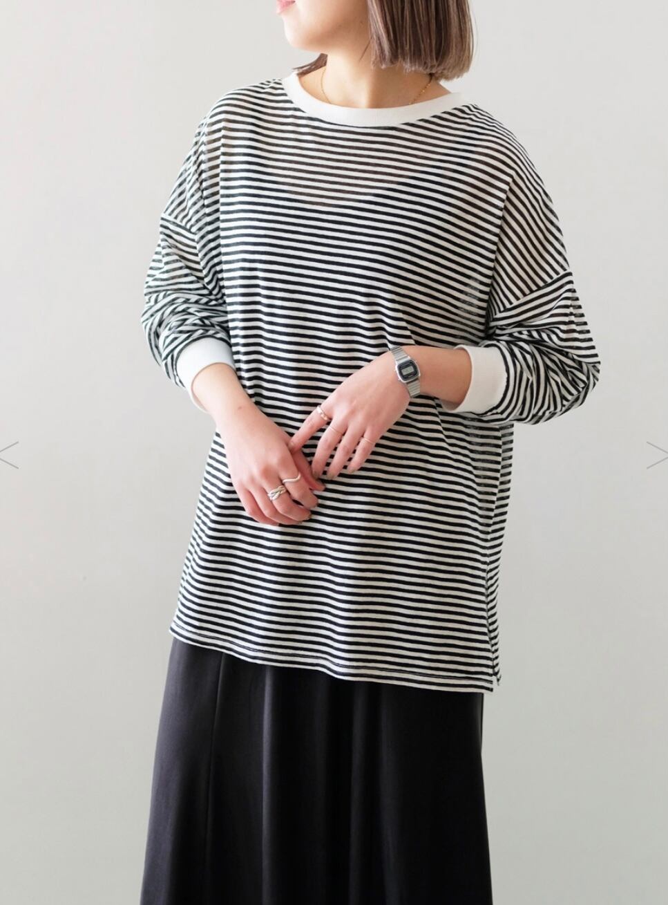 昨年大人気だったシアーボーダーロンティーを、くたっとした薄手の柔らかな綿混素材の生地感はそのままに、袖口をlリブ締めに変更し、丈感も少しカットしてアップデートしました。