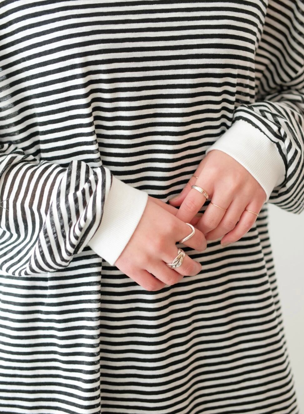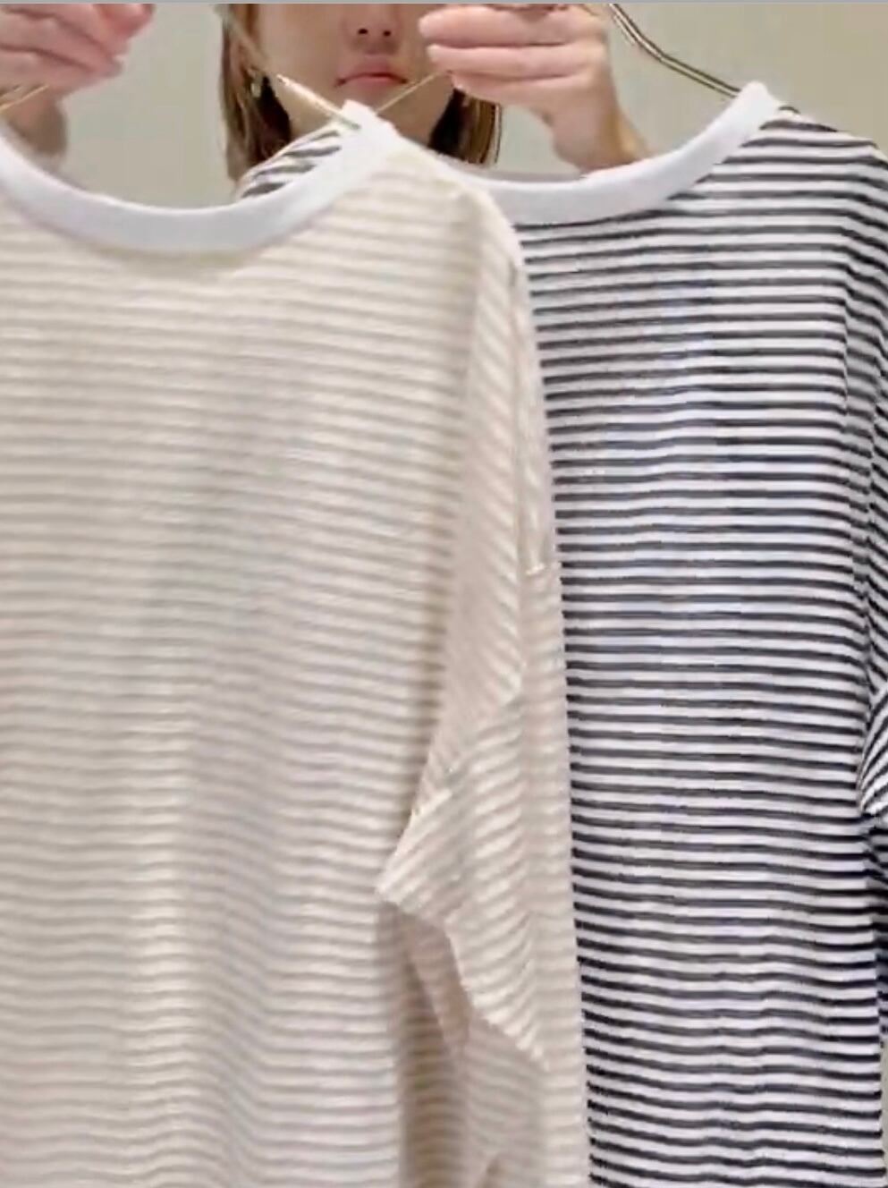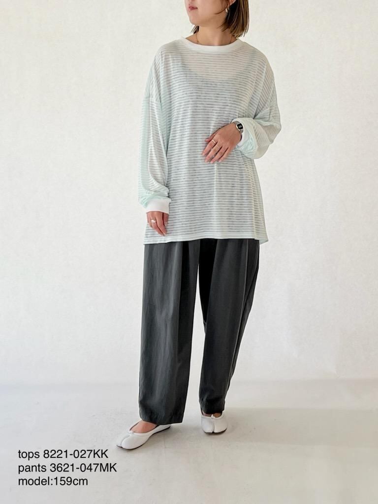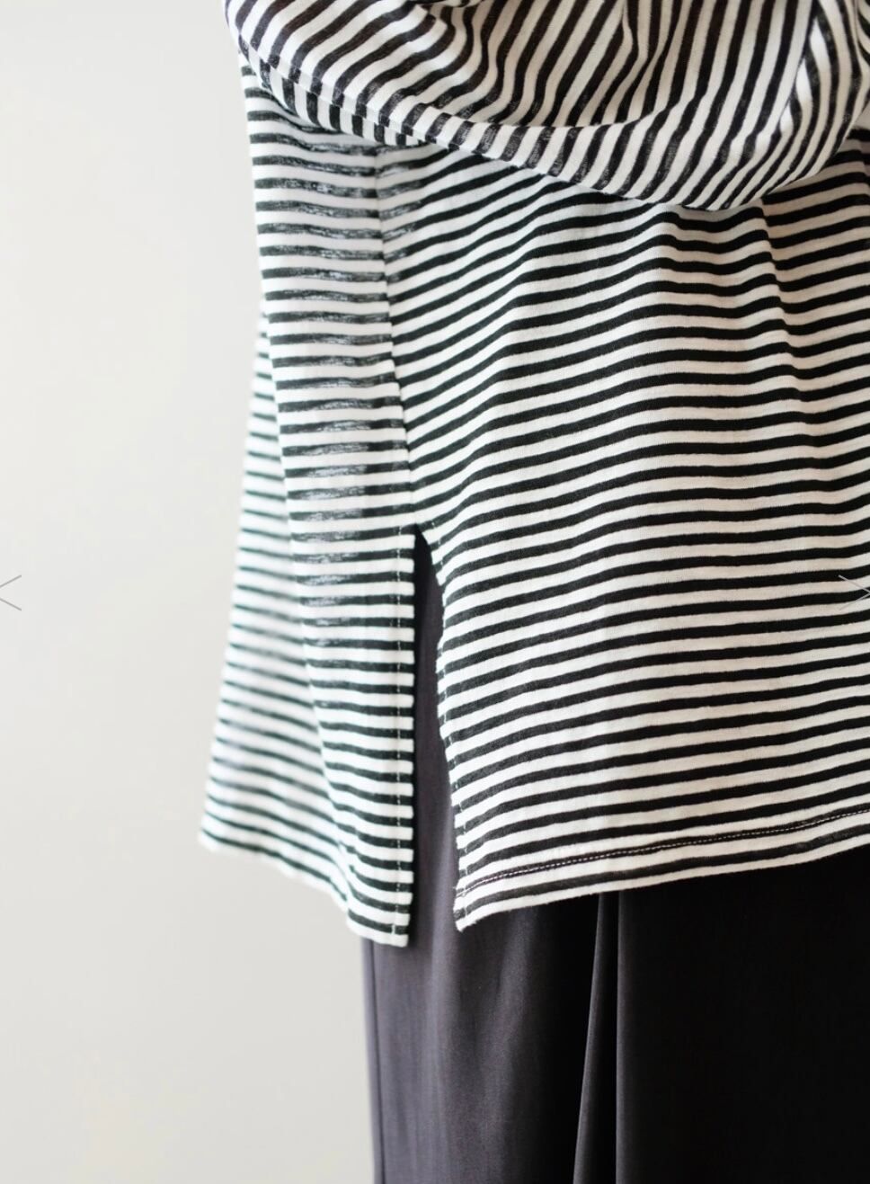 昨年大人気だったシアーボーダーロンティーを、くたっとした薄手の柔らかな綿混素材の生地感はそのままに、袖口をlリブ締めに変更し、丈感も少しカットしてアップデートしました。