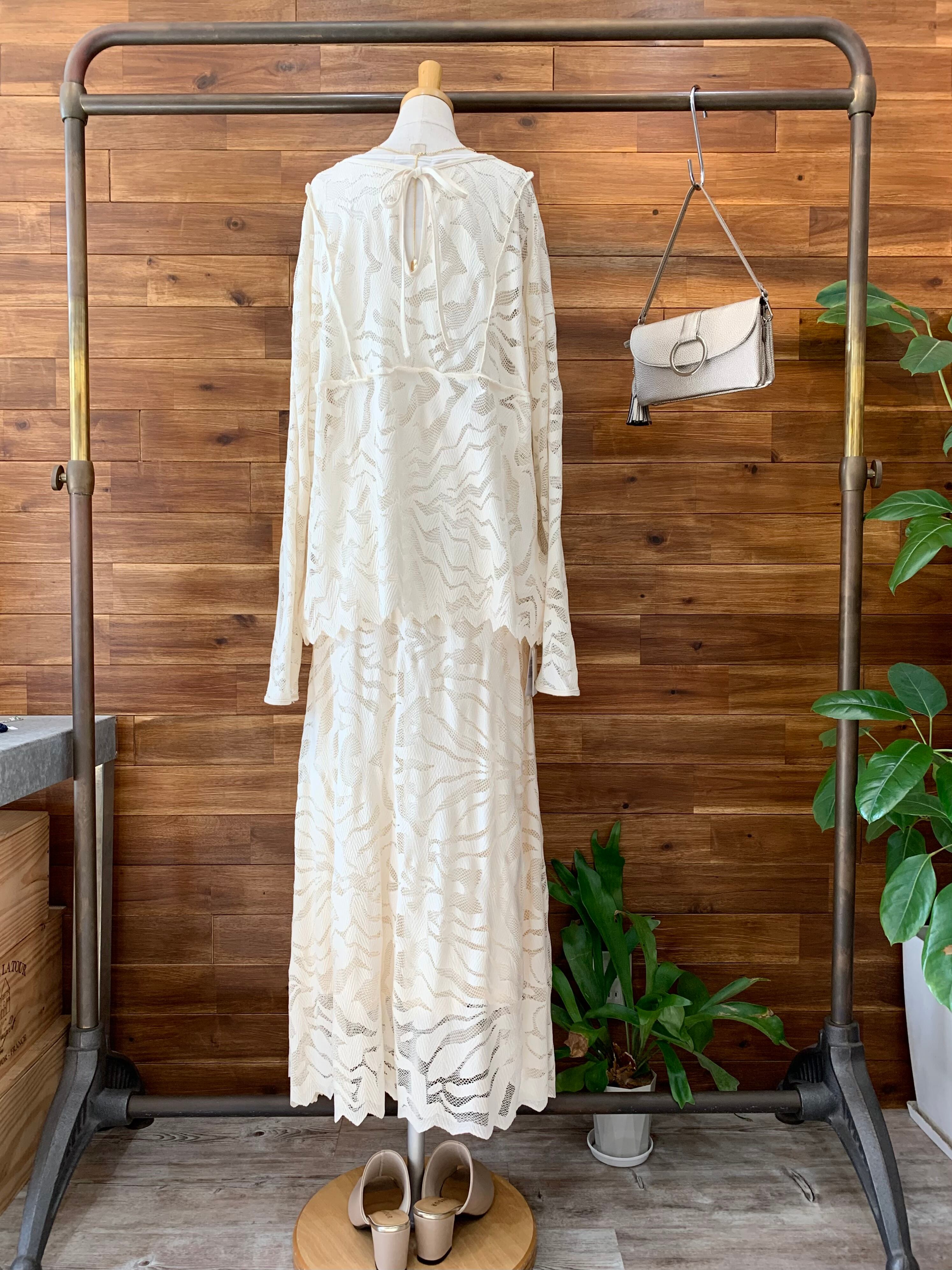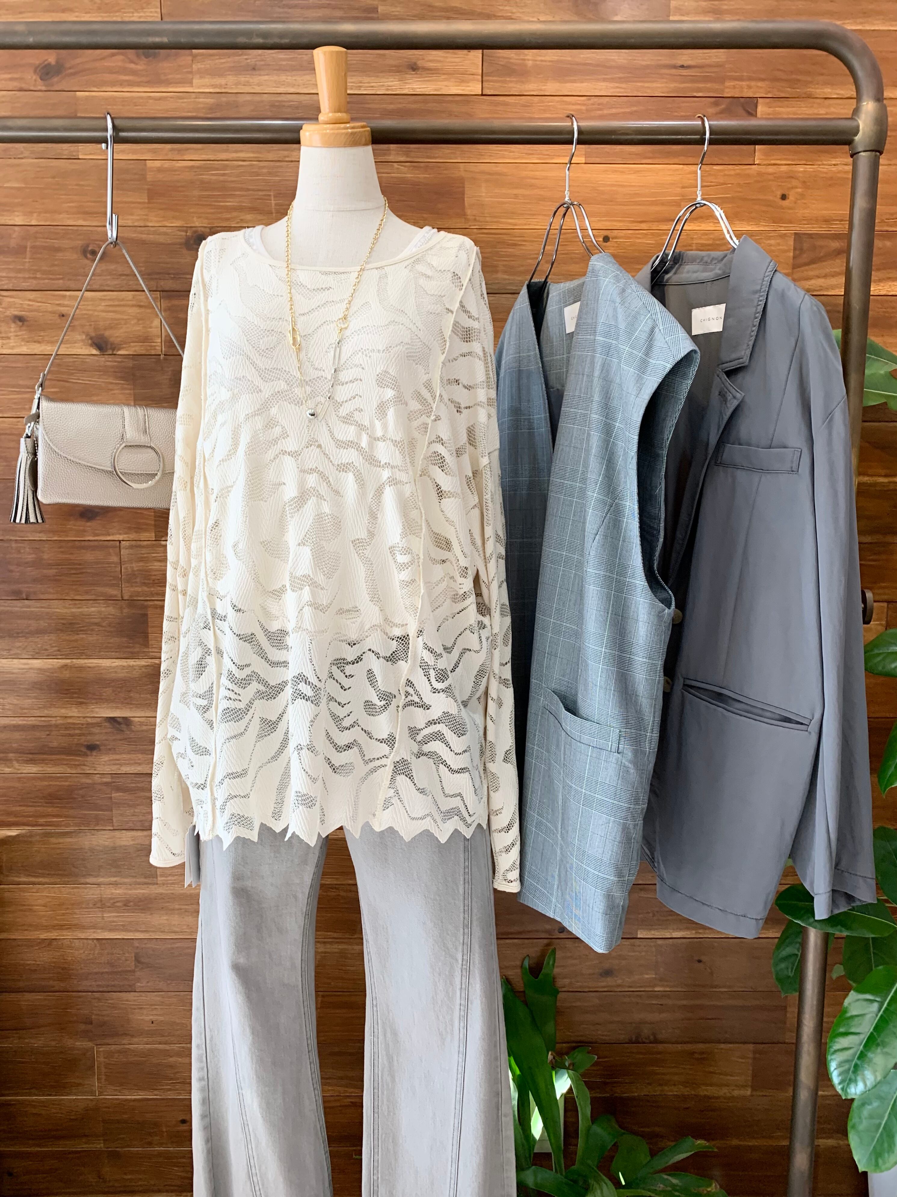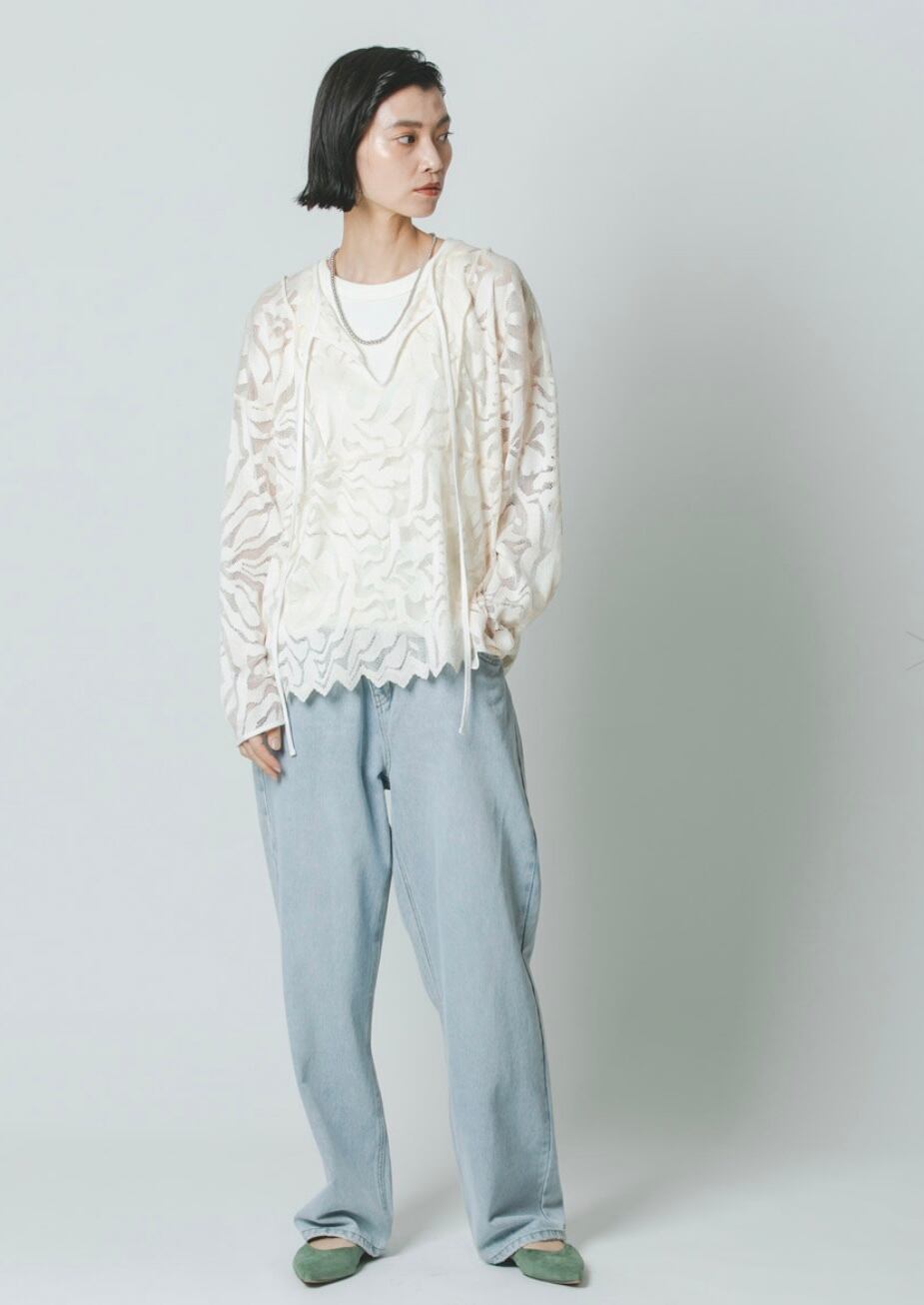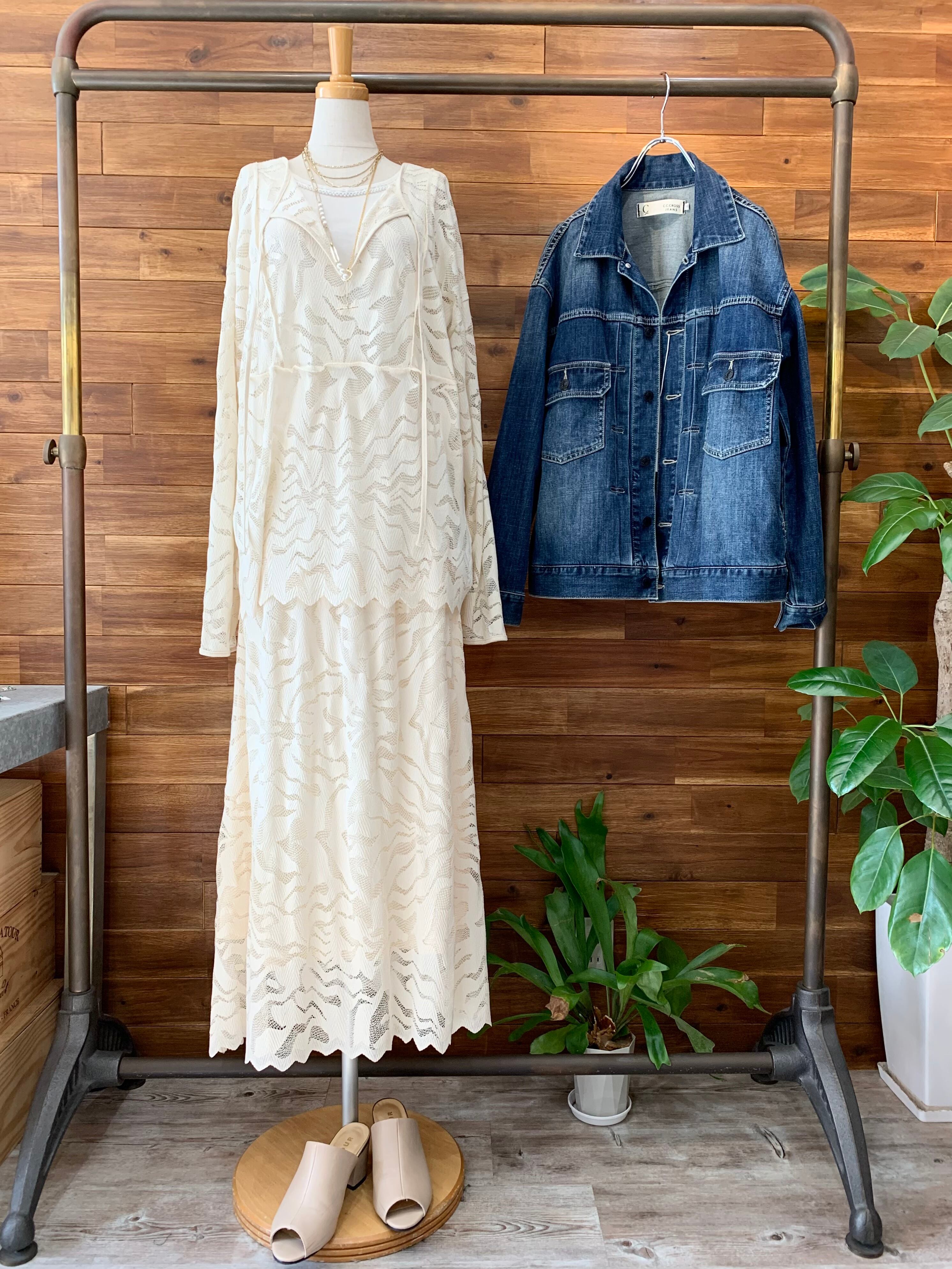 アウトシームデザインもレースアイテムながらカジュアルな印象になり、キャミ合わせでも、ロンTをレイヤードしていただいても様になるアイテムです。