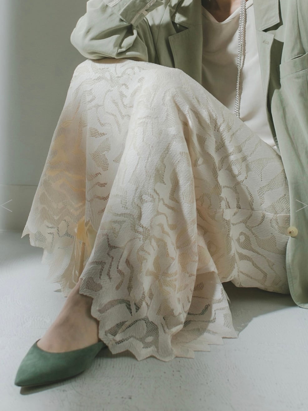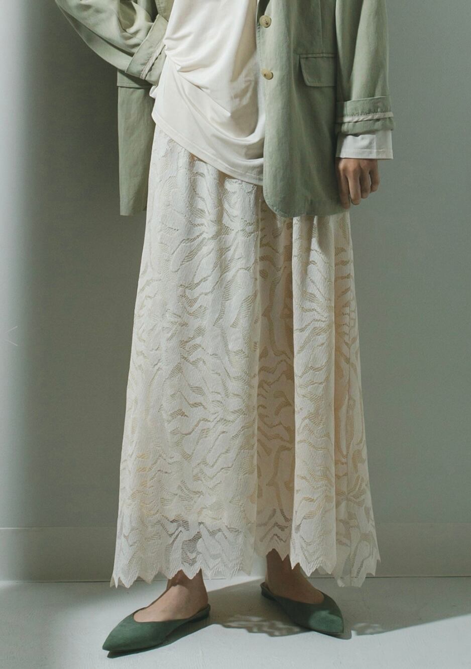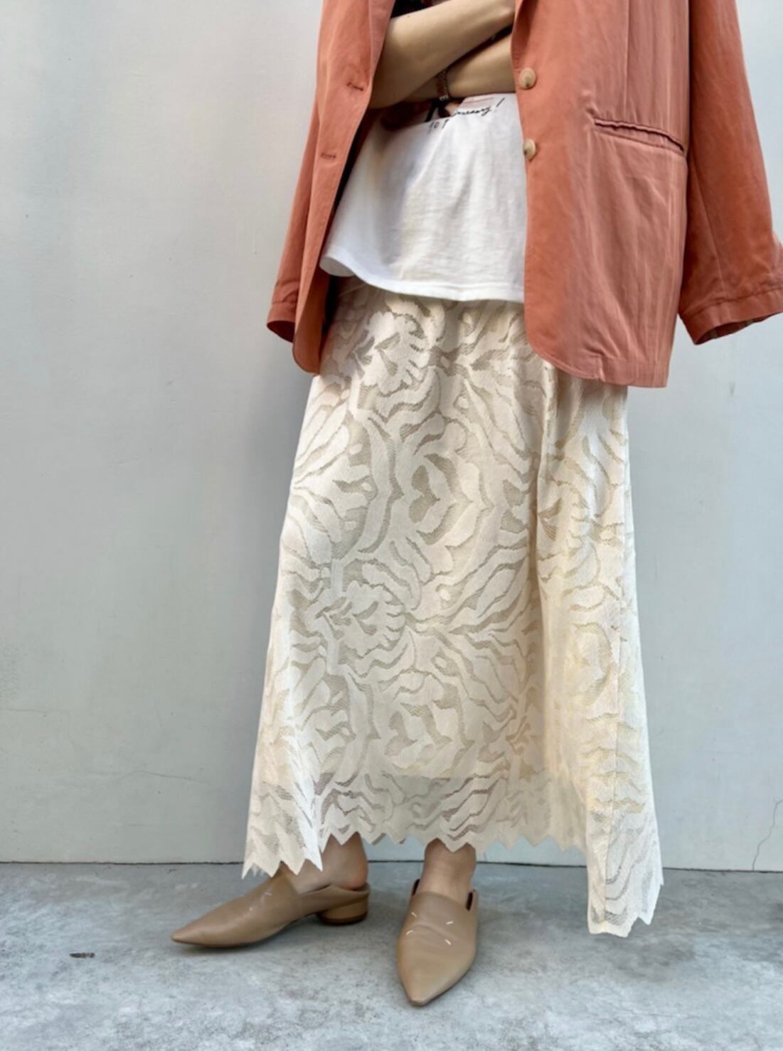 裾のスカラップもポイントになり、裾にかけて緩やかに広がるシルエットは、ボリュームのあるトップスと合わせた時も相性抜群です。