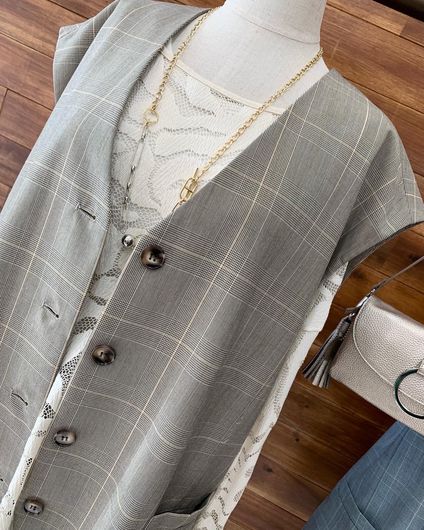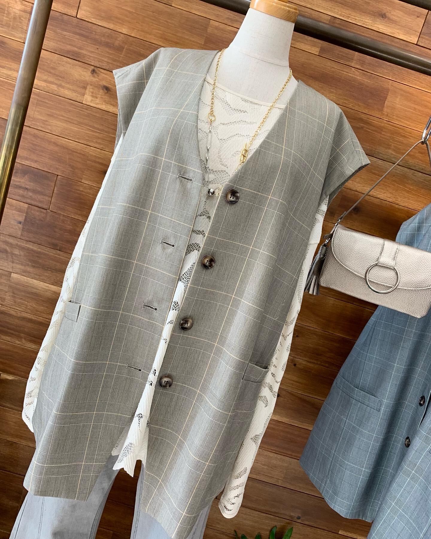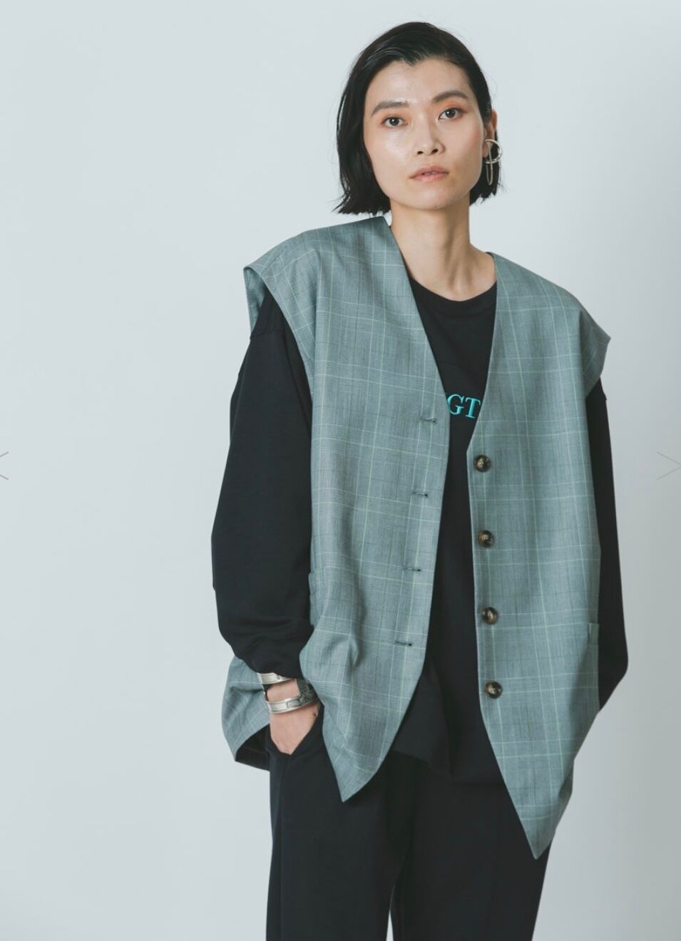 ゆったりしたシルエットのグレンチェック柄ベストジャケットです。