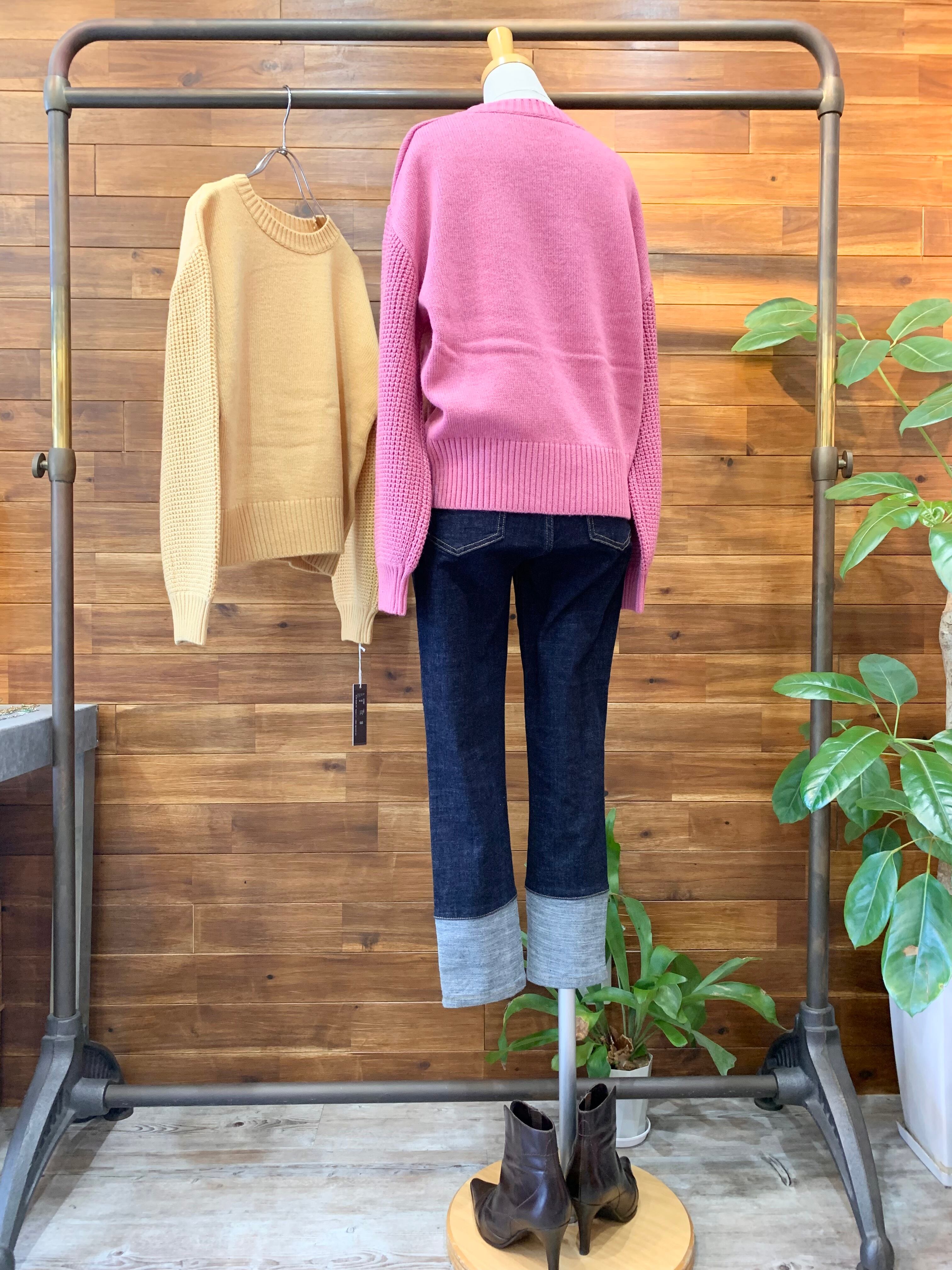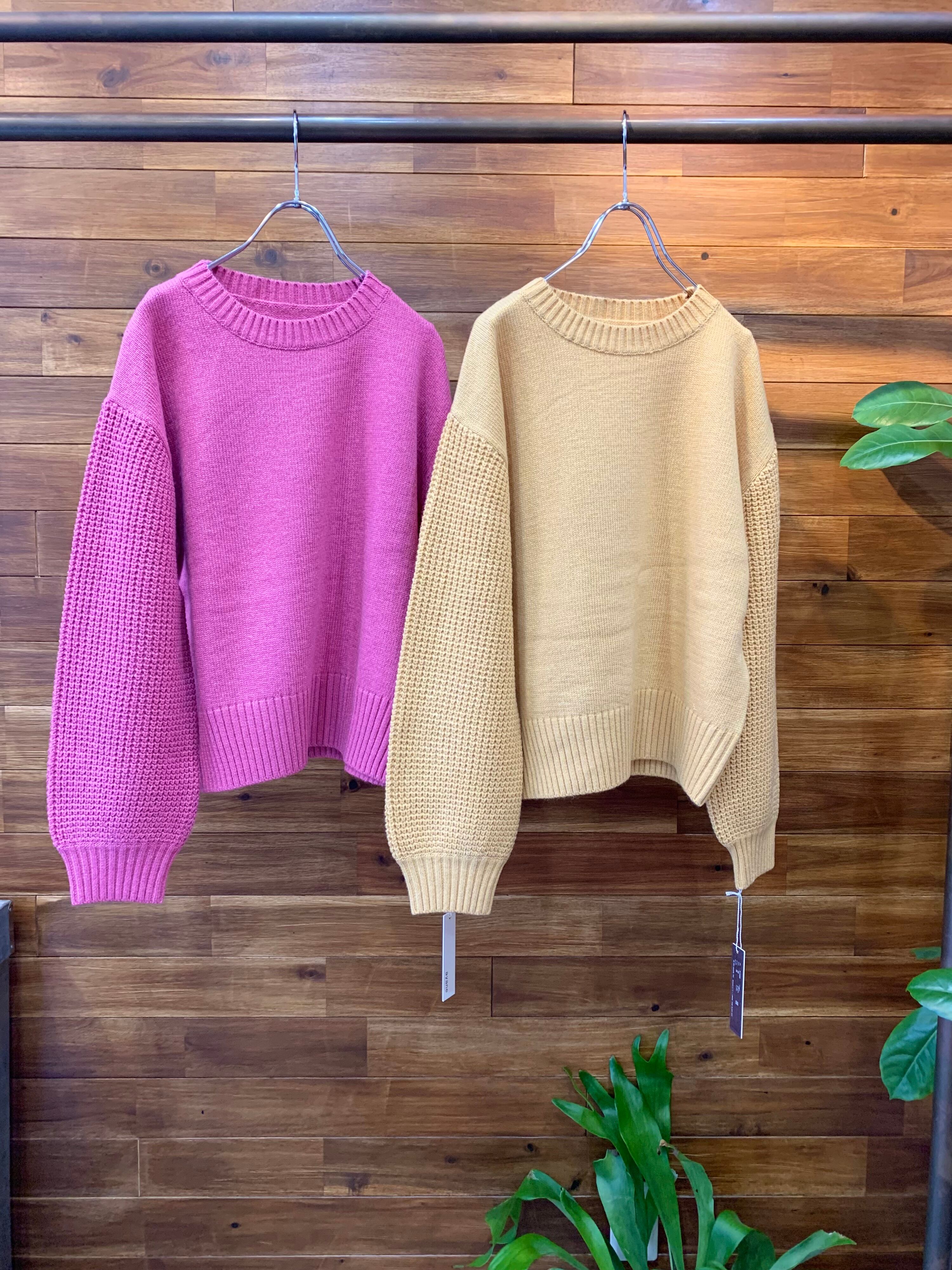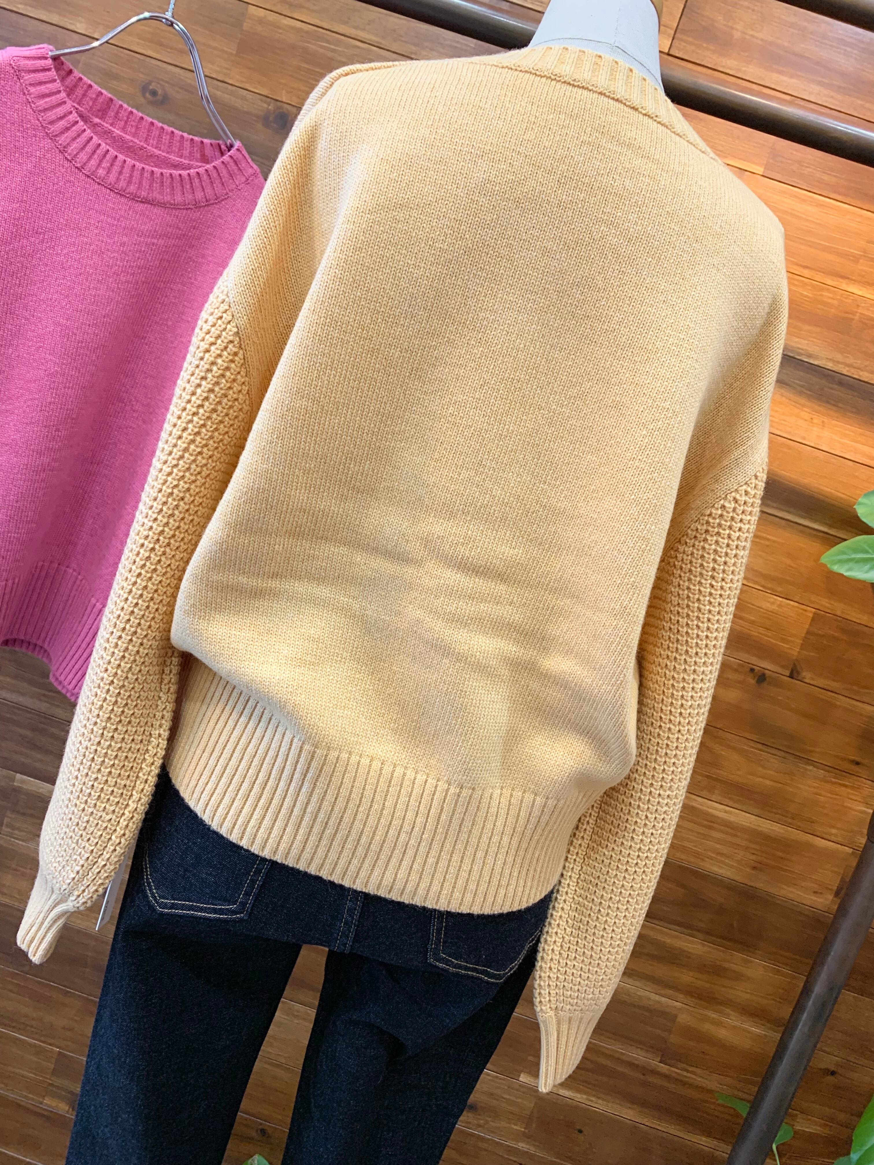 ふんわりしたお袖のシルエットと、編み地の切り替えがポイントのニット♡