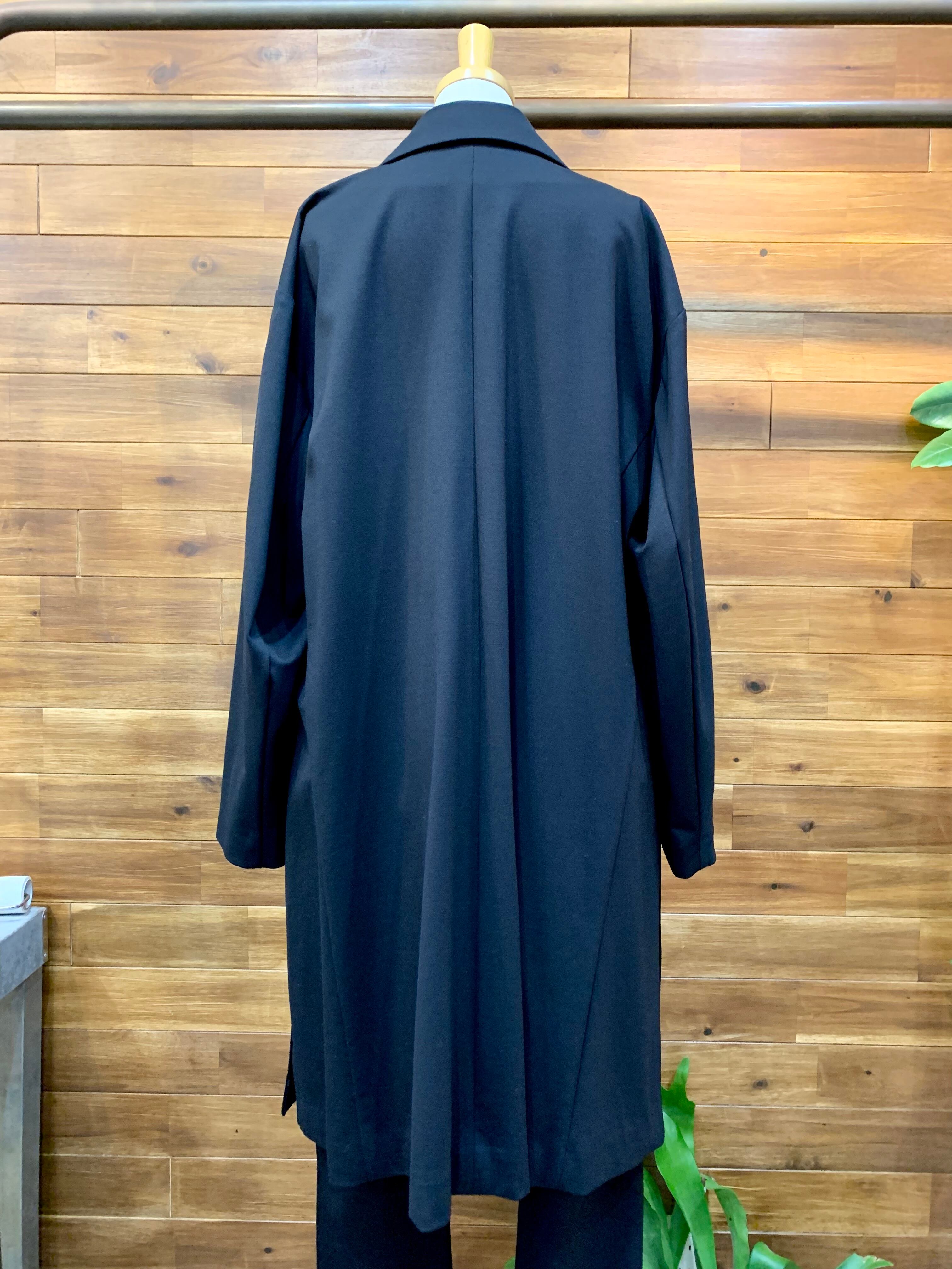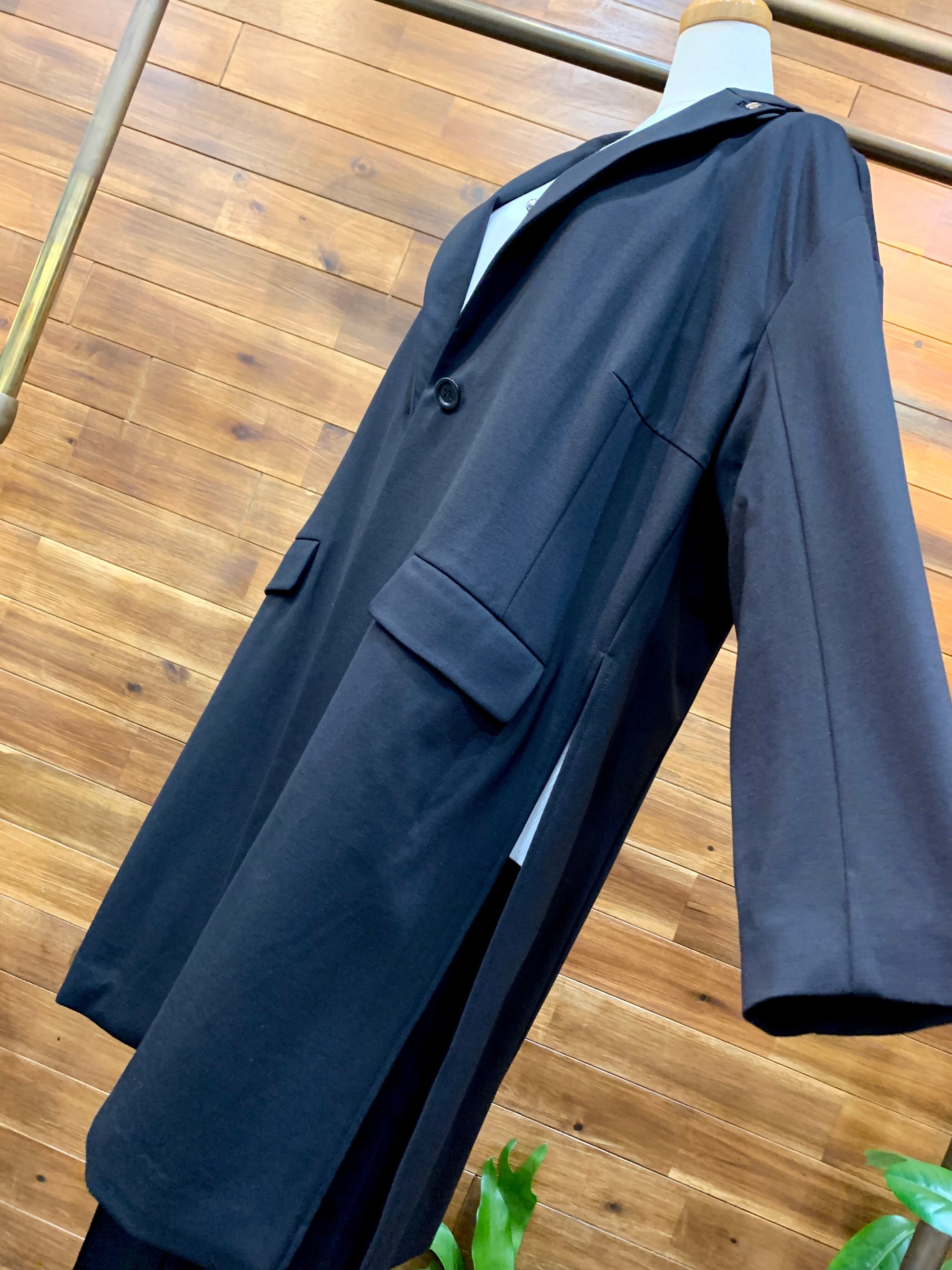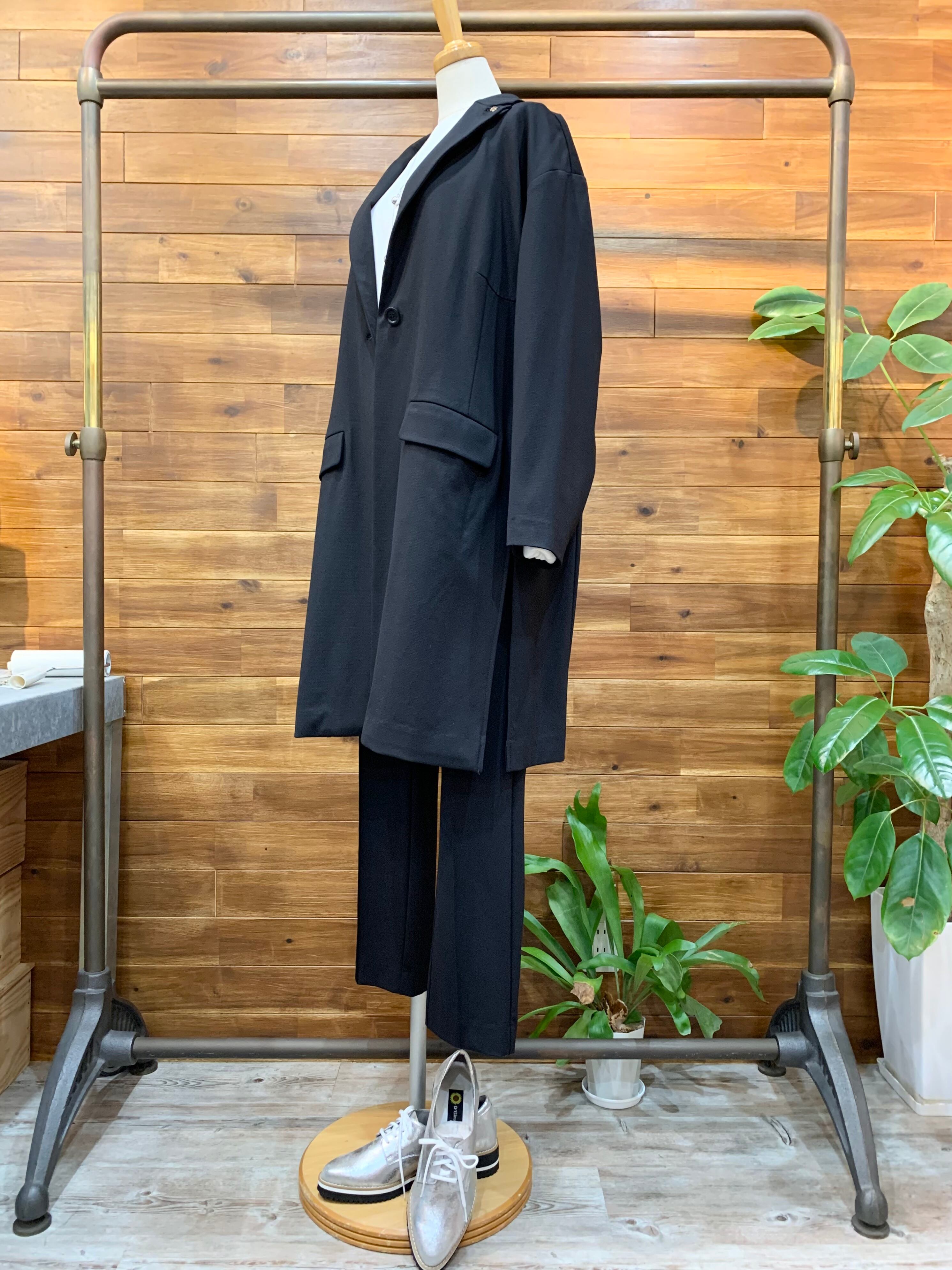 長めのレングスに両サイドの深いスリットや左衿のピンバッジなど、モードで構築的な印象ですが、素材の柔らかさが堅苦しさを無くしてくれて、ずっと着ていられます◎