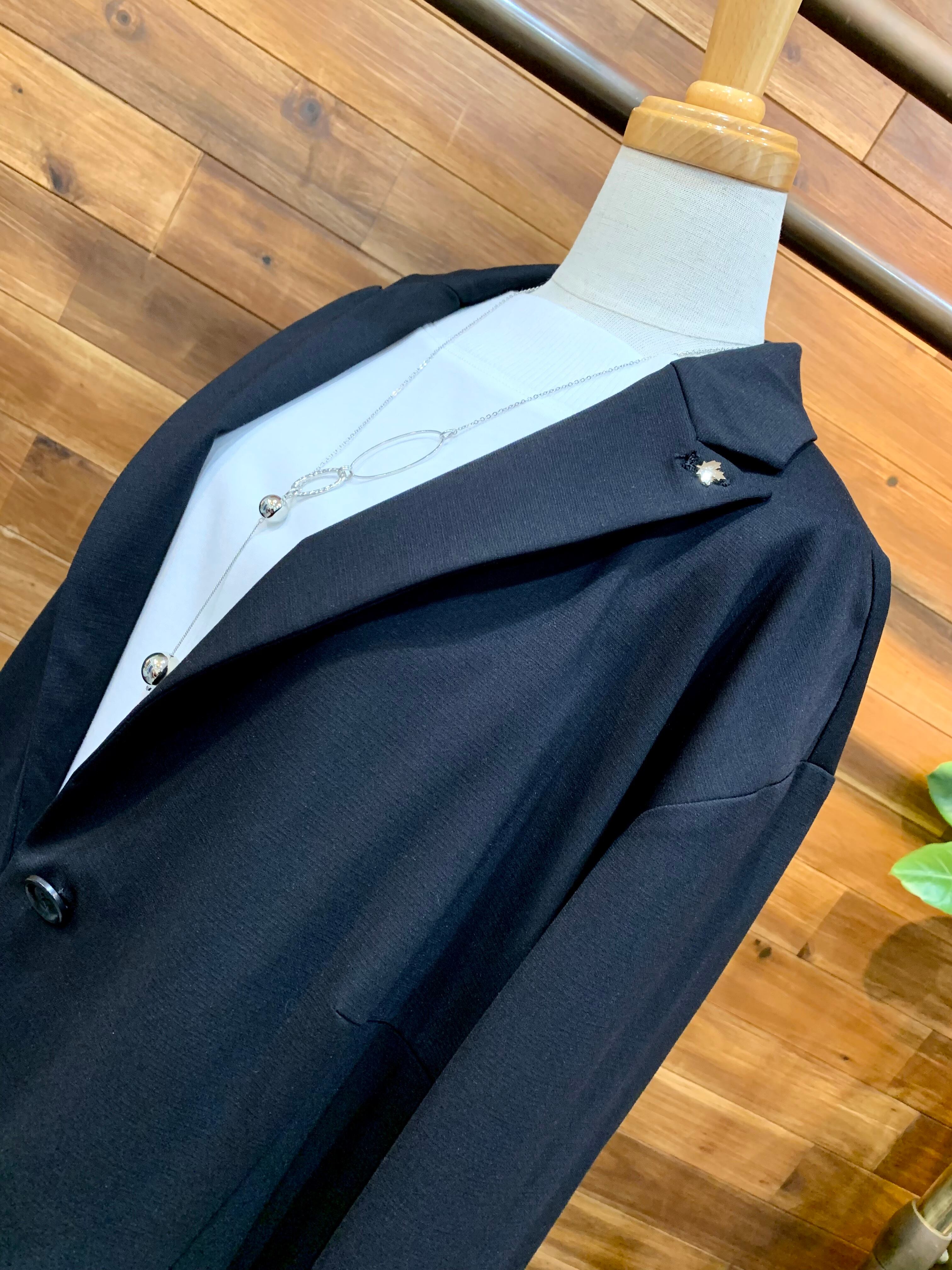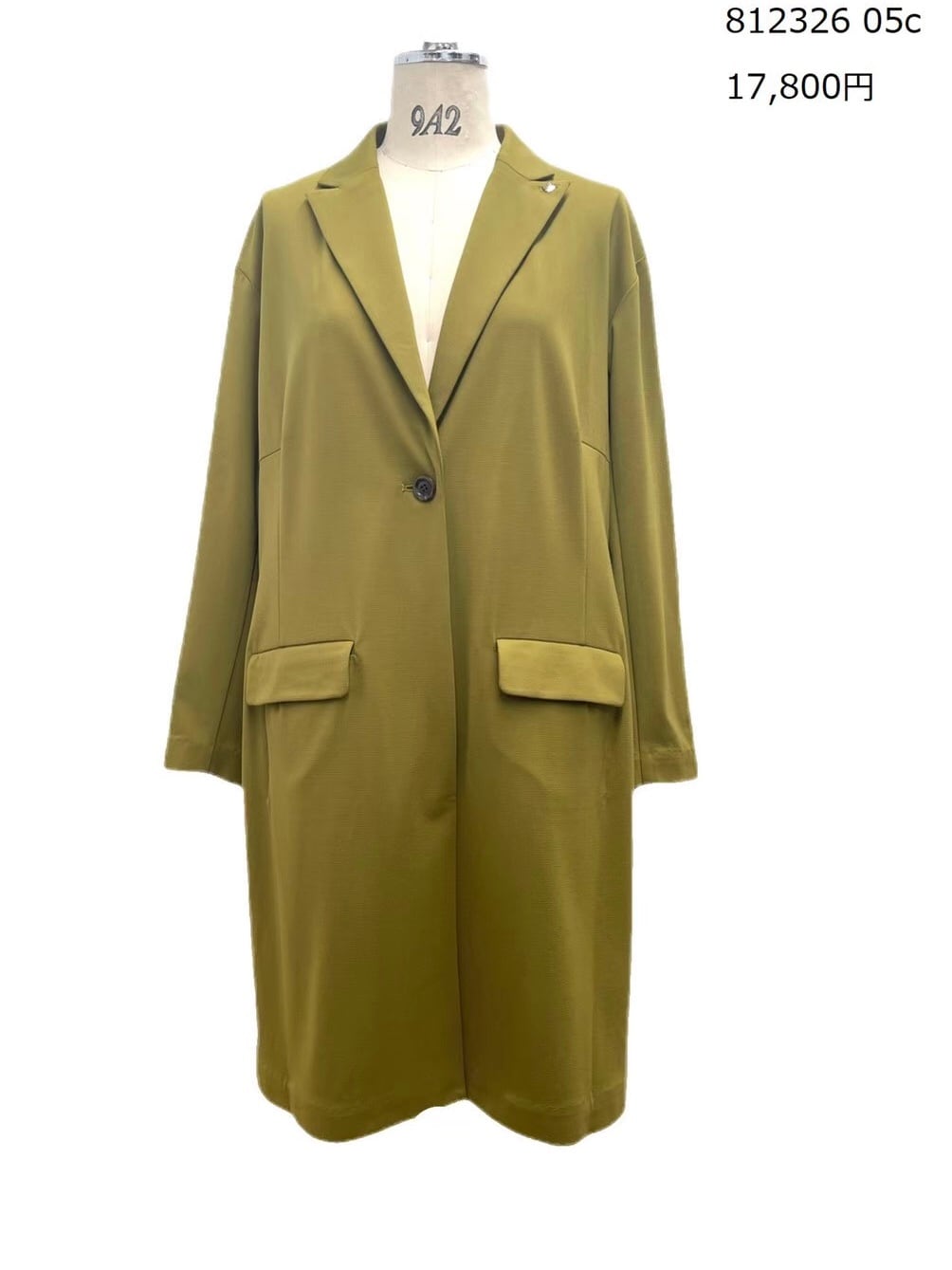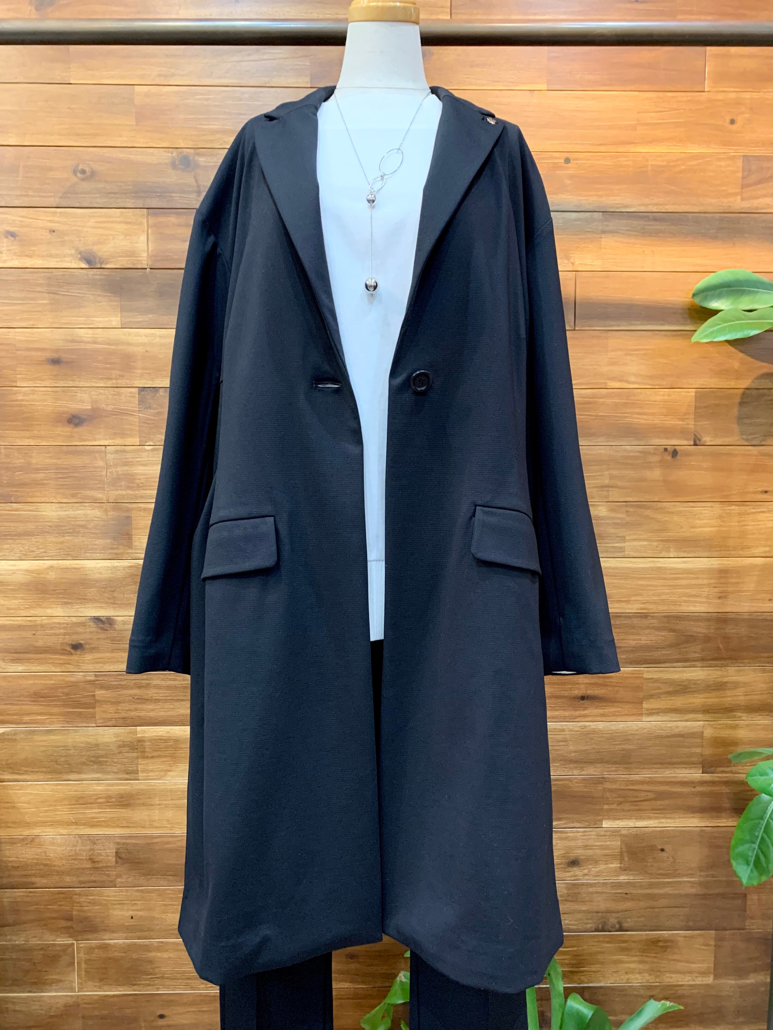 長めのレングスに両サイドの深いスリットや左衿のピンバッジなど、モードで構築的な印象ですが、素材の柔らかさが堅苦しさを無くしてくれて、ずっと着ていられます◎