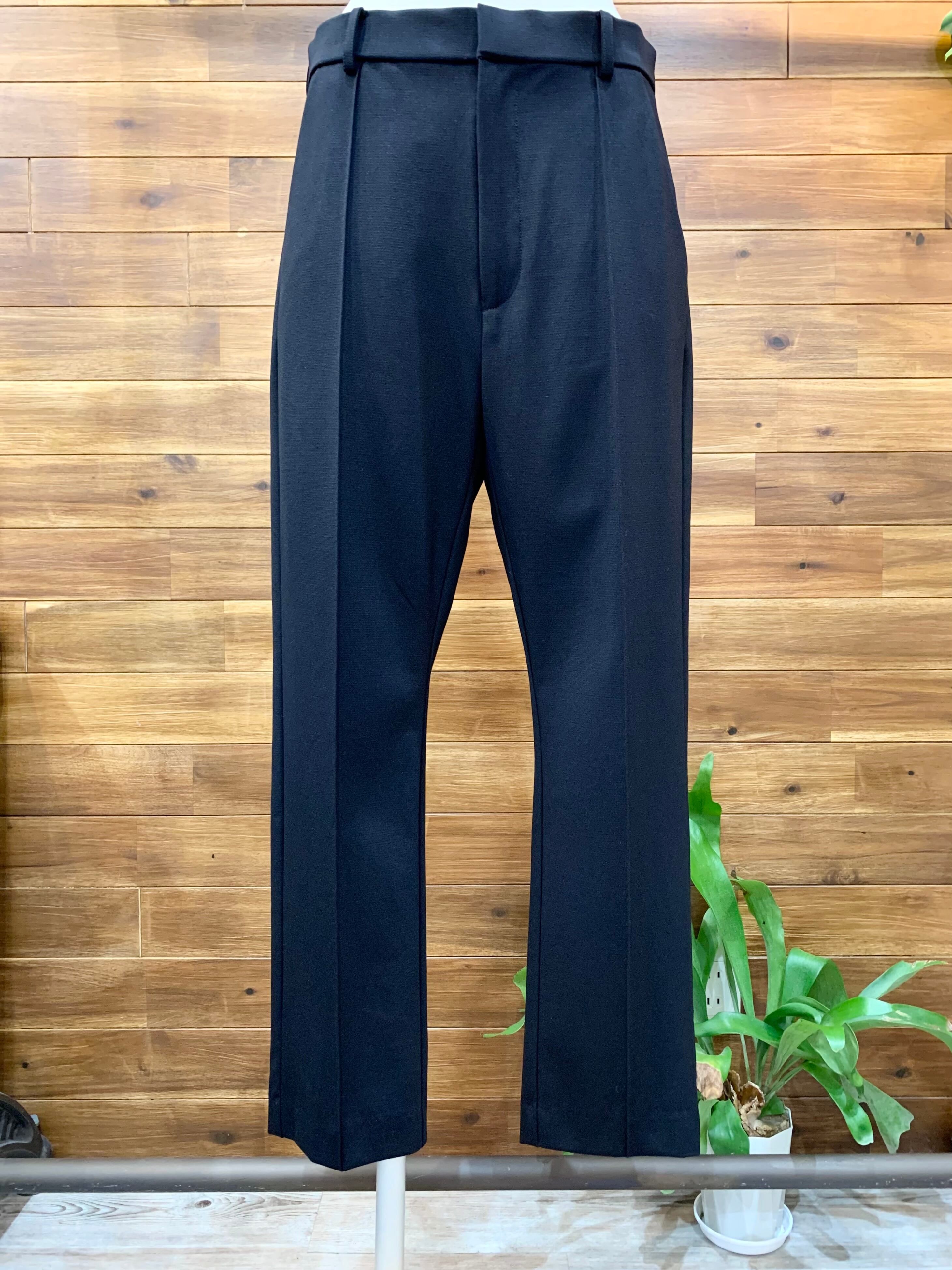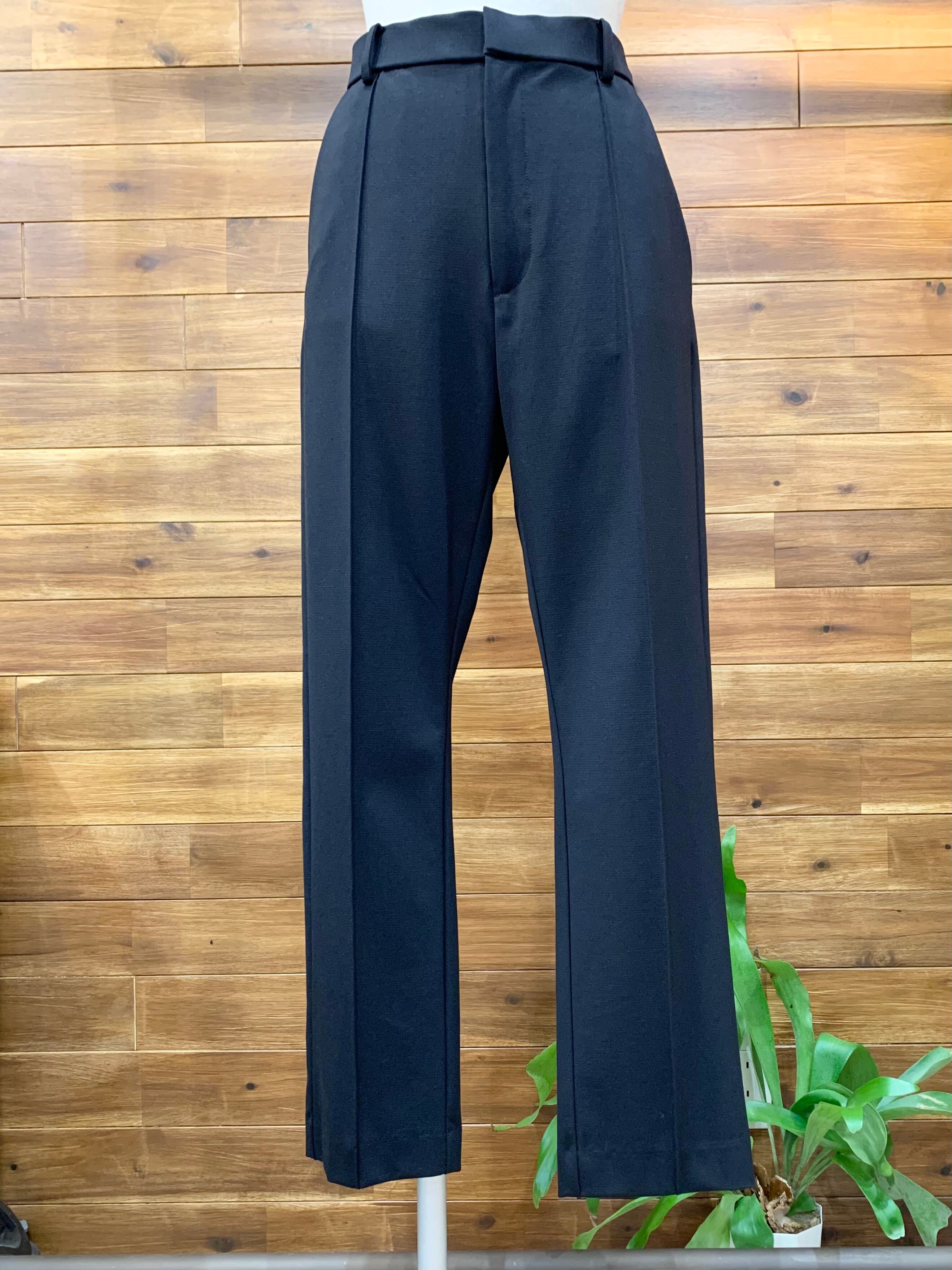 ストレッチ性の高いピケジャージを使用した、マニッシュな細身スラックスパンツ。