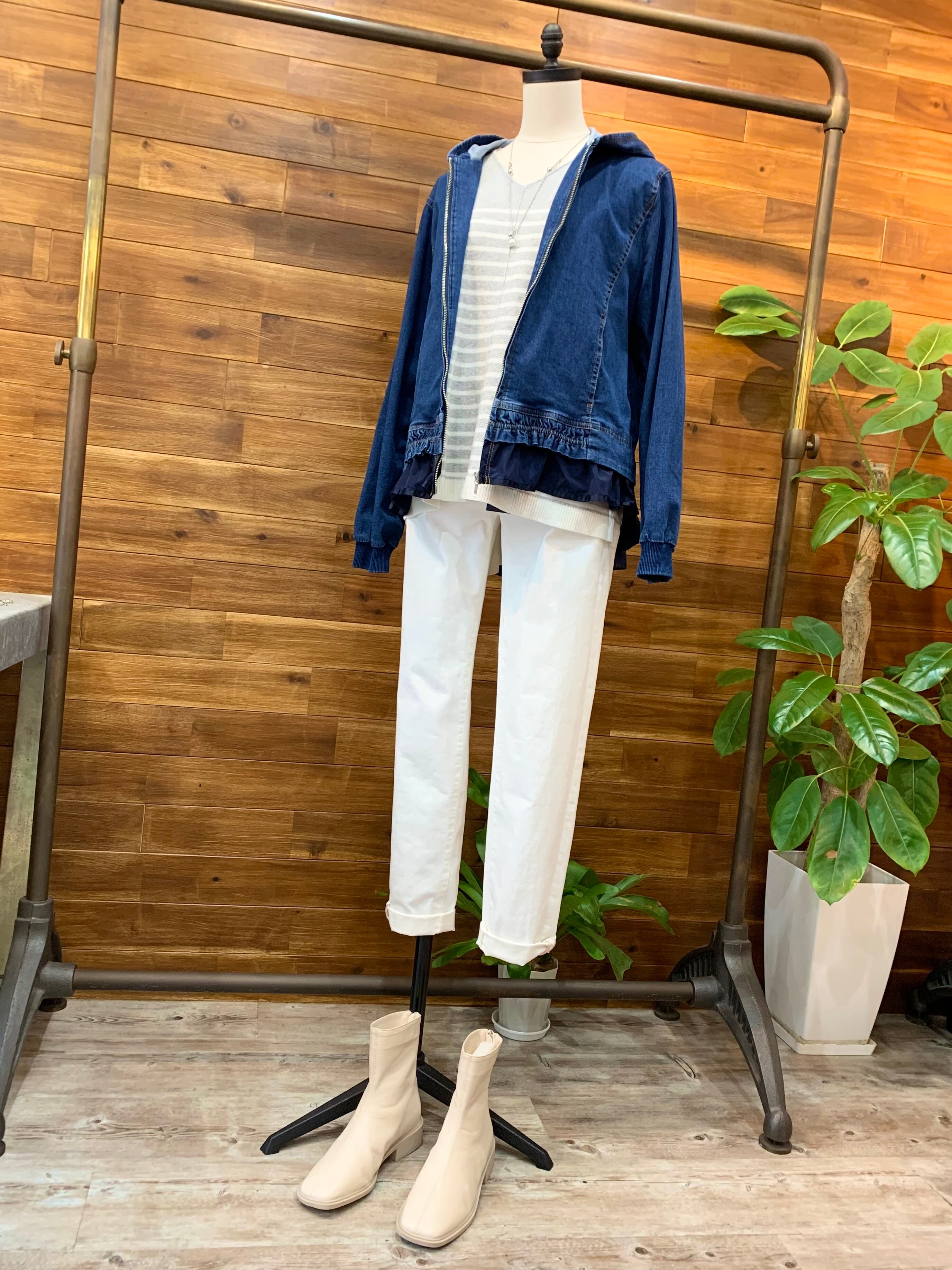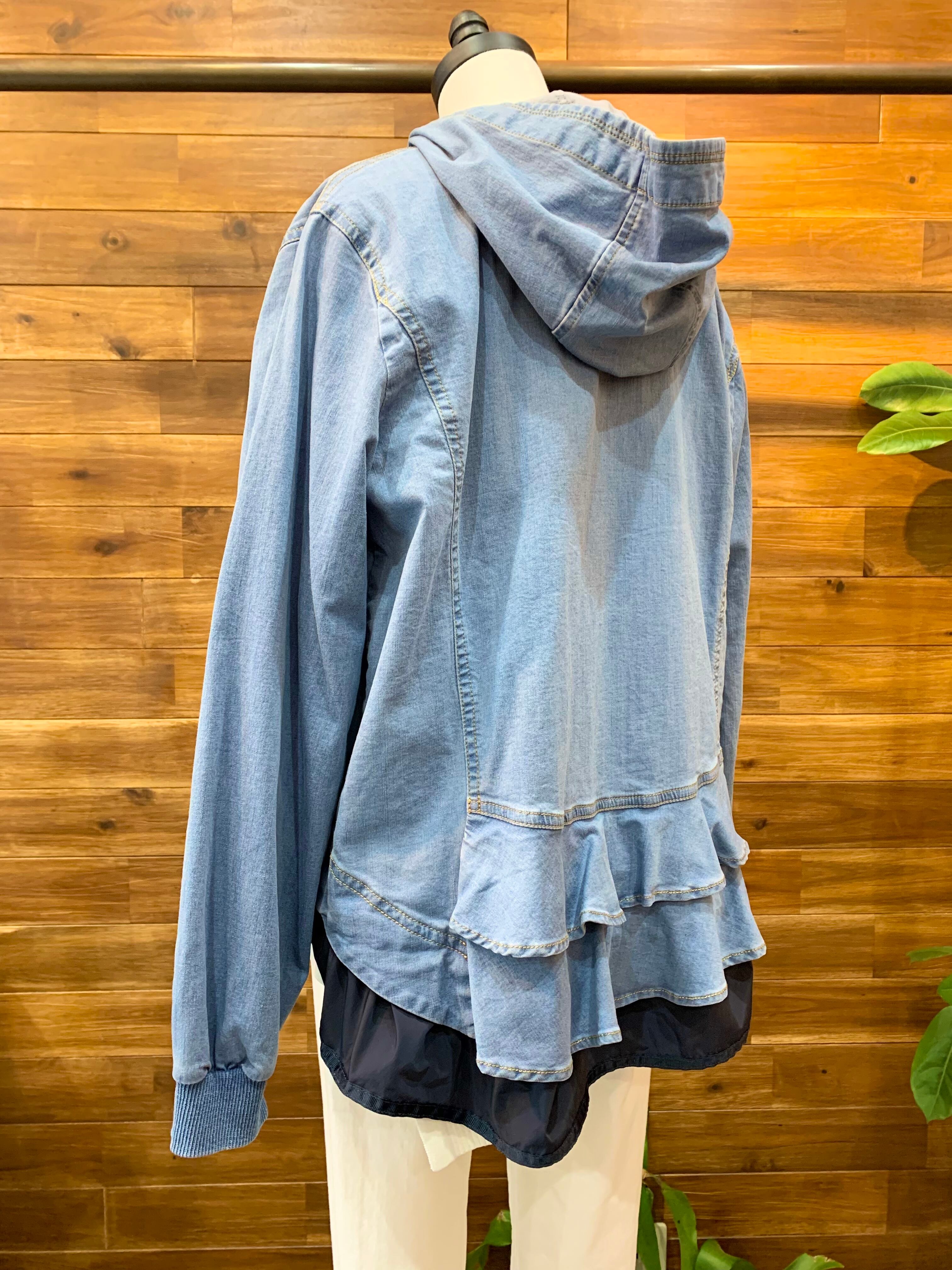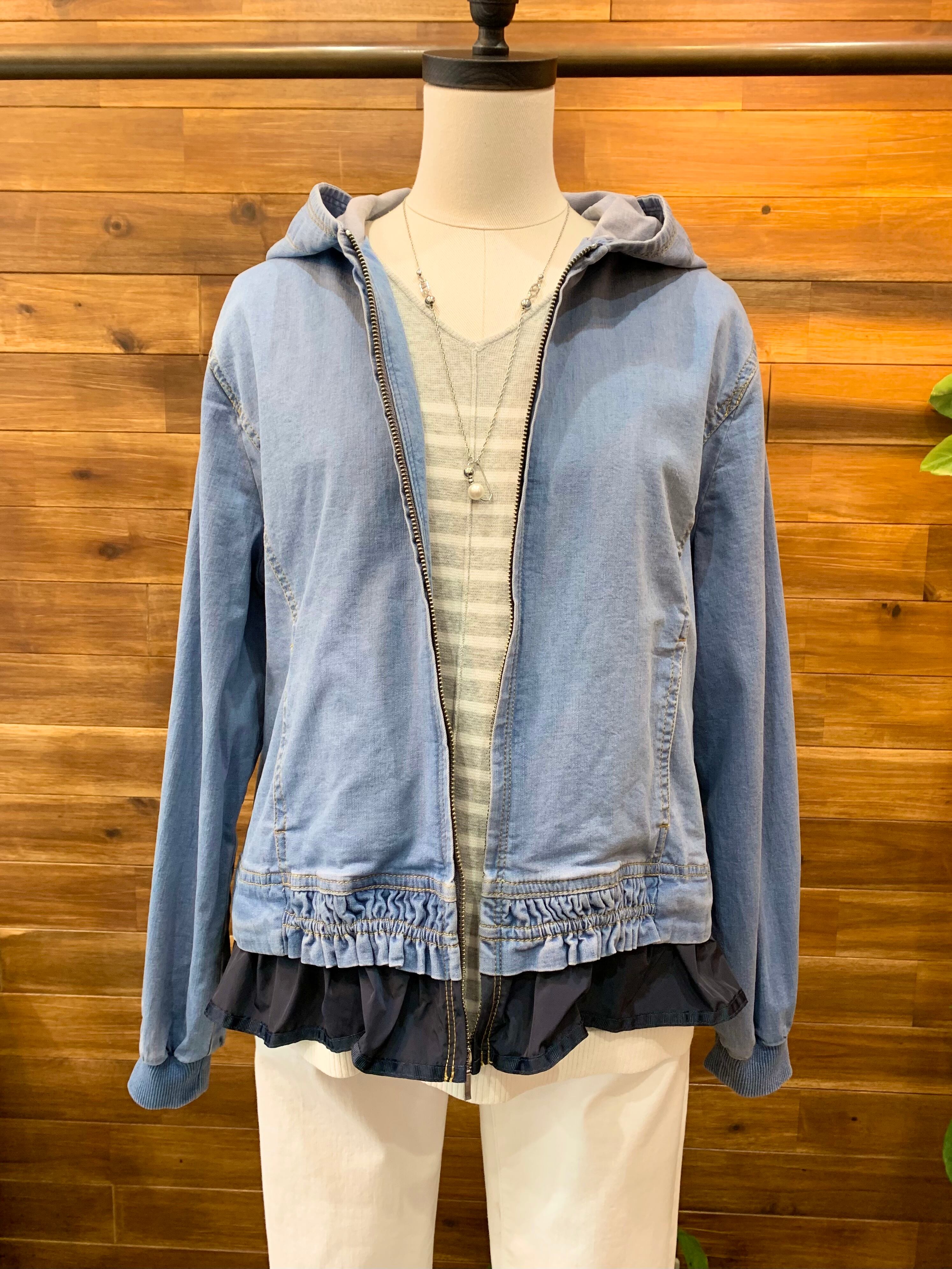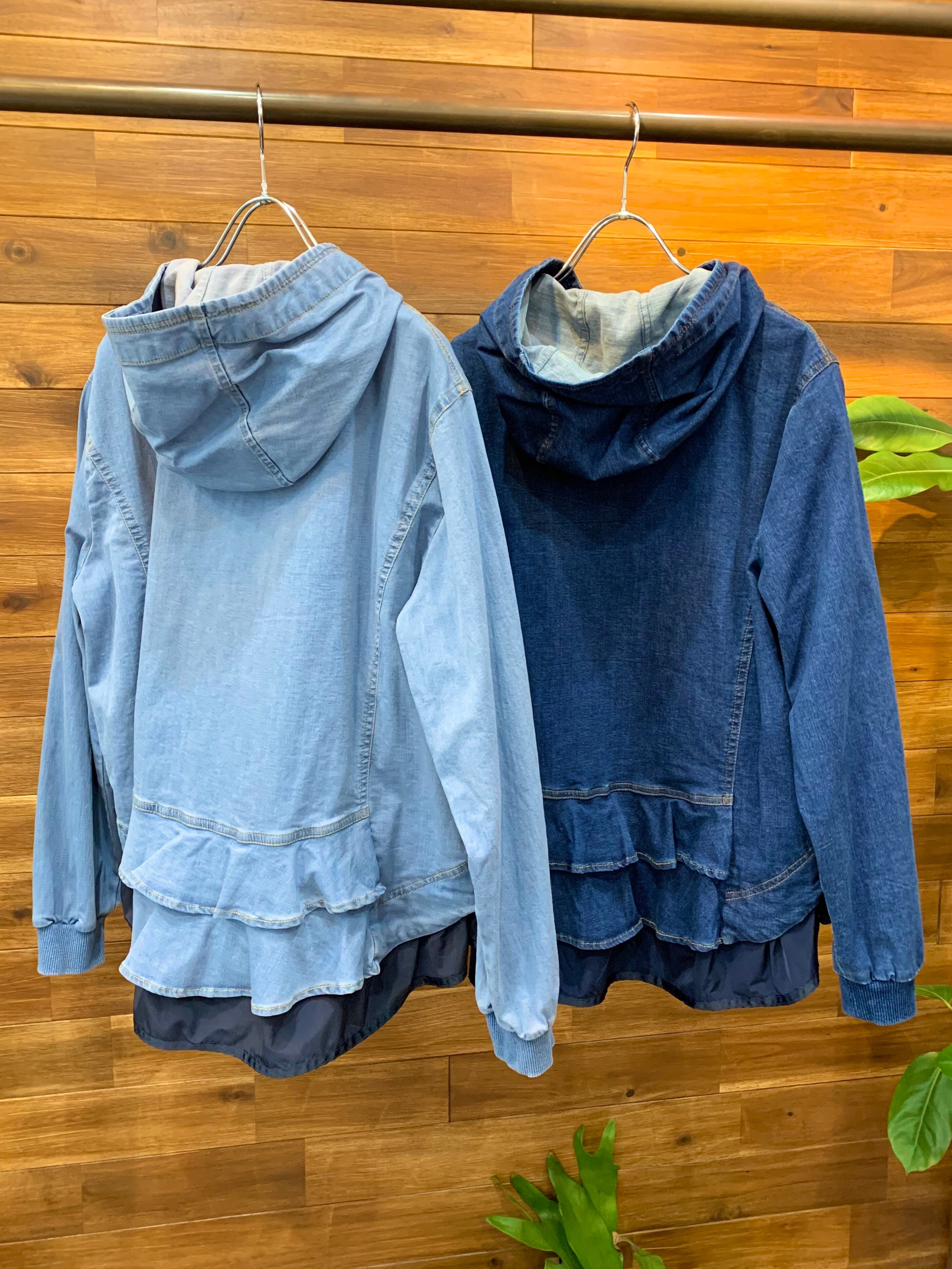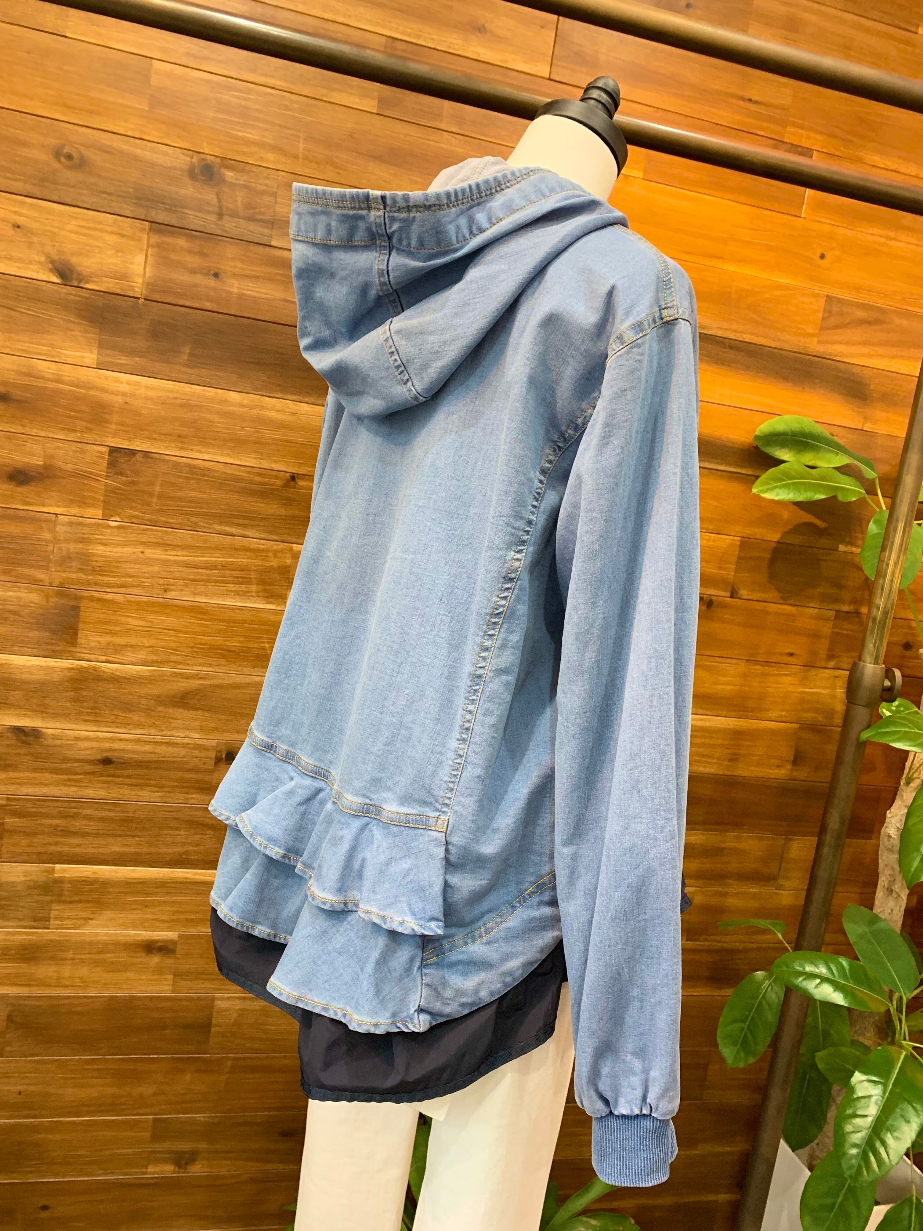 デニム&フードのカジュアルな雰囲気とフリル&ティアードの可愛いらしさがMIXした絶妙なデザインのブルゾンです♪